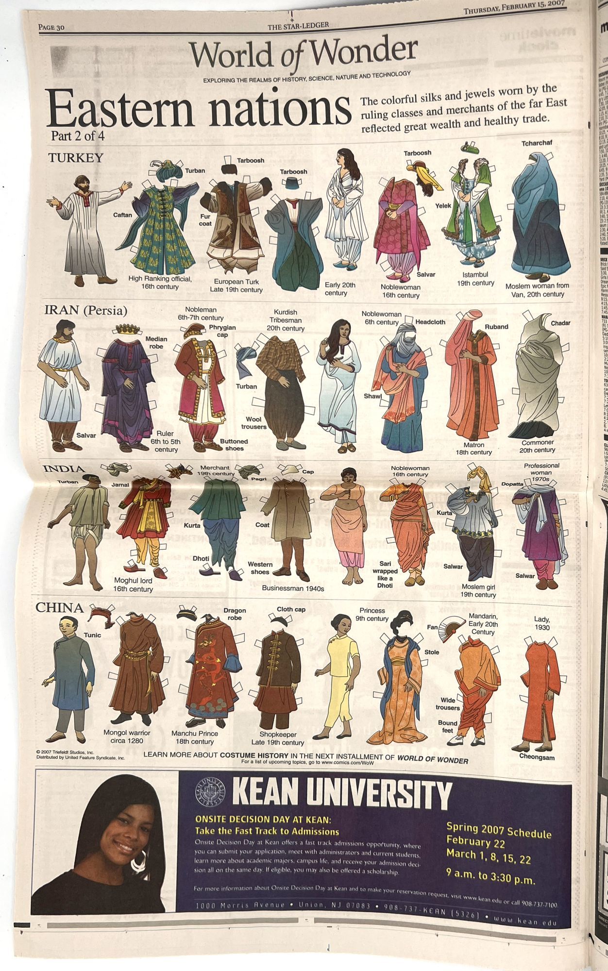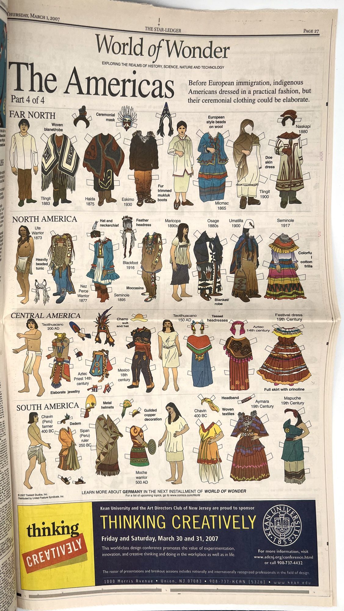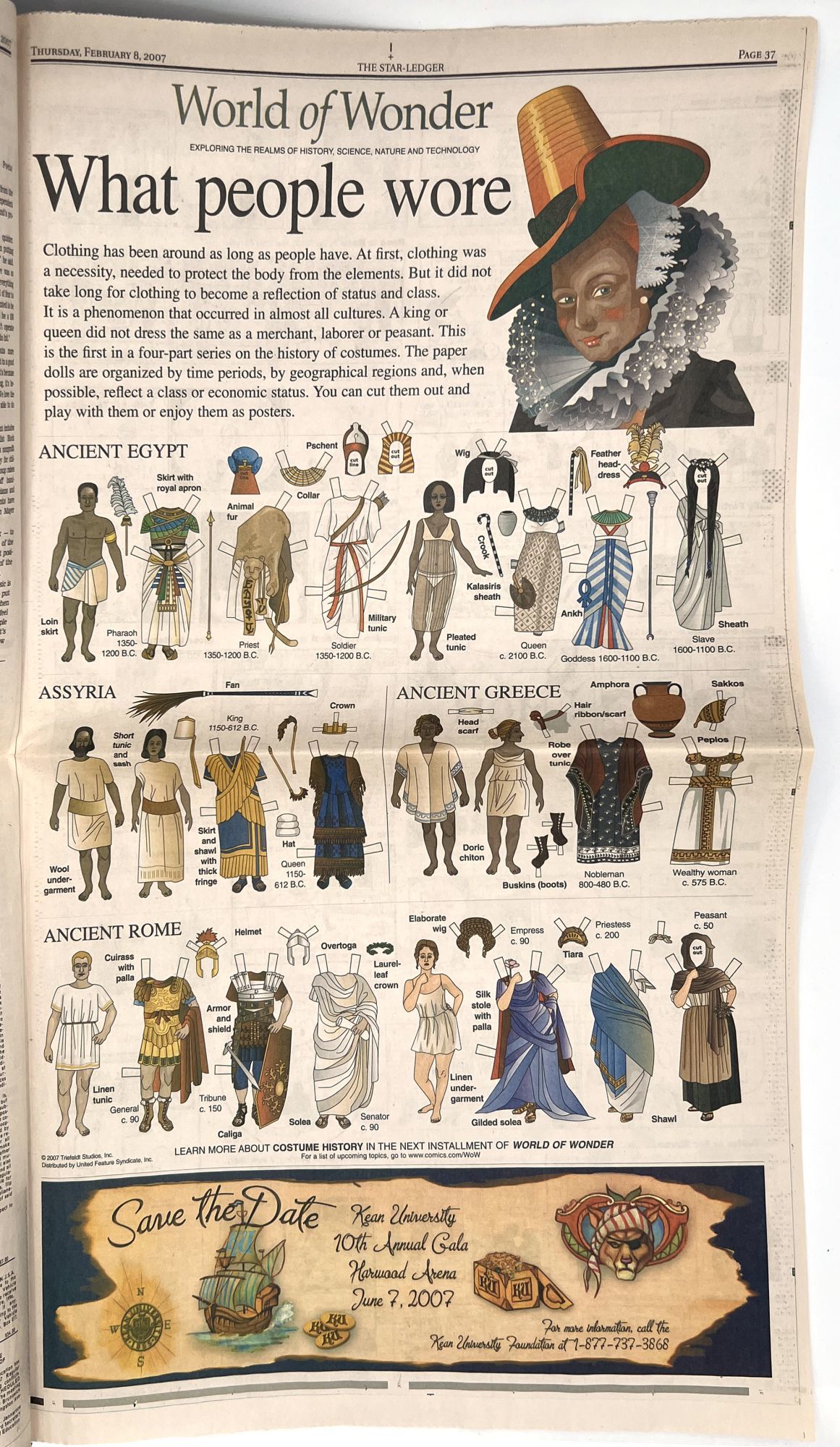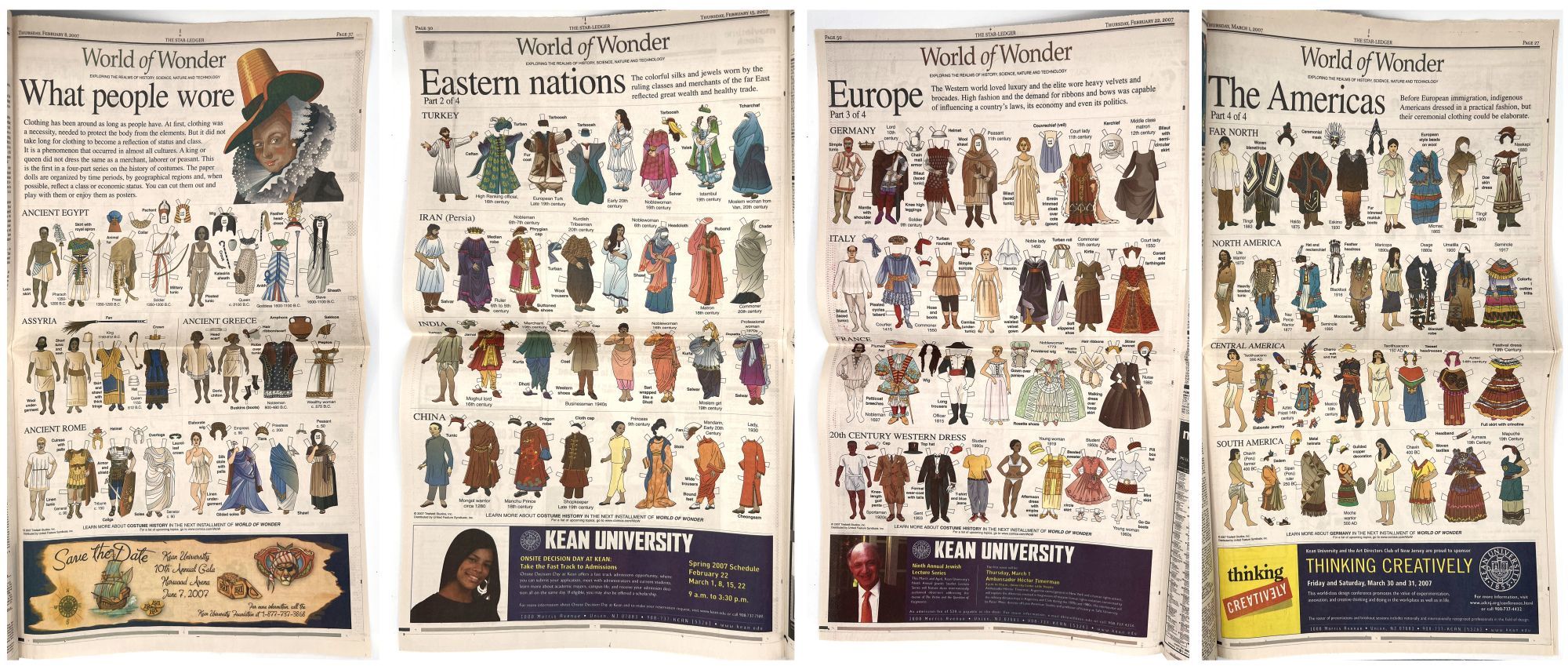 Newark, New Jersey: The Star-Ledger, 2007. Very good to near-fine. Horizontal folds.. Complete uncut set of the four-part "World of Wonder" historical fashion paper doll series published in four subsequent issues of New Jersey's "The Star-Ledger" newspaper in February 2007. The series included male and female paper dolls with tabbed colorful outfits and accessories to cut out for the following time periods/places in fashion history: Ancient Egypt, Assyria, Ancient Greece, Ancient Rome (Part 1); Turkey, Iran (Persia), India, and China (Part 2); Germany, Italy, France, and 20th century Western Dress (Part 3); indigenous peoples of the Far North, North America, Central America, and South America (Part 4). Highlights fashion and cultural customs that would not be familiar to readers of the paper, such as traditional foot binding in China. Note the inclusion of "20th century Western Dress", which encourages readers to analyze themselves through an anthropological/ethnographic lens. Interestingly, despite the series' clear commitment to diversity, it lacks any representation of peoples from Oceania (indigenous or otherwise). Each newspaper section is approx. 12 pp, and measures approx. 22" by 12.75". There are four sections total.