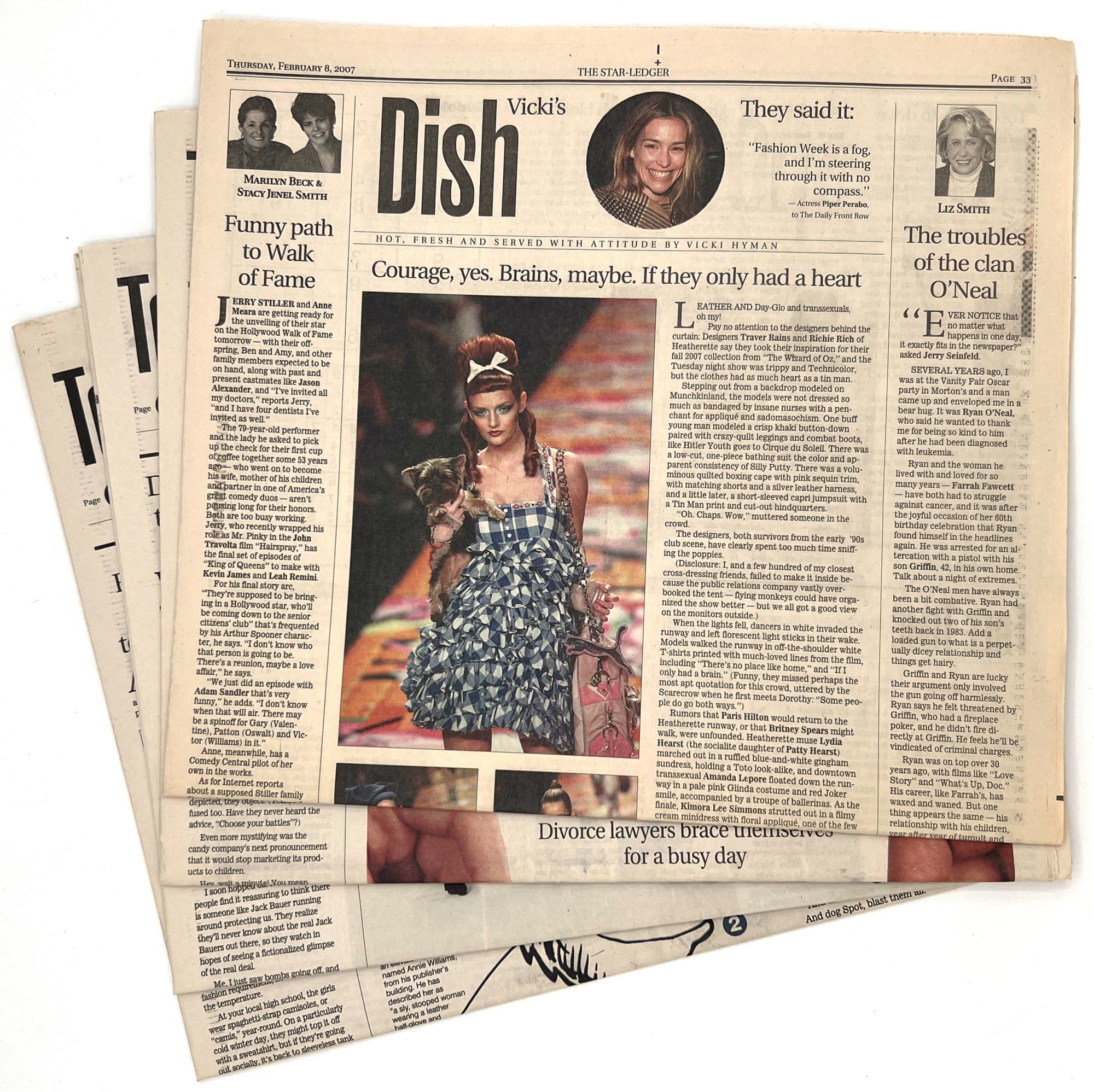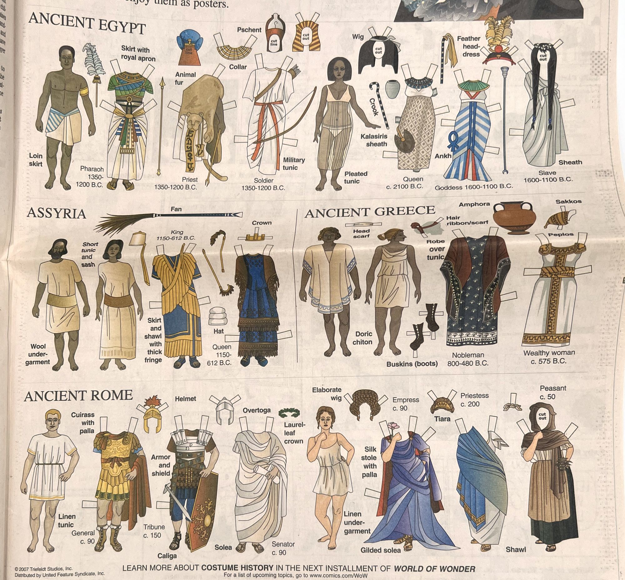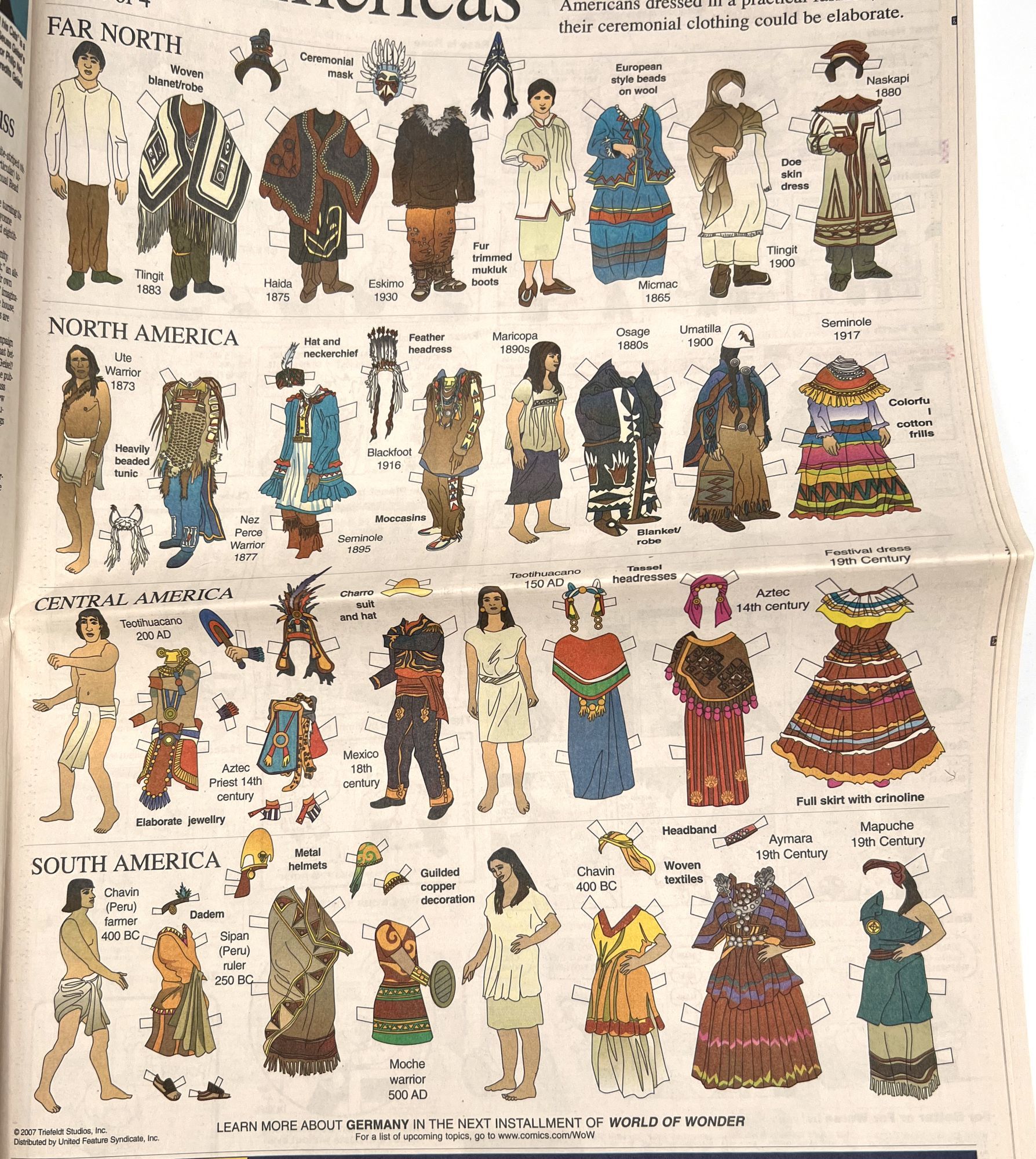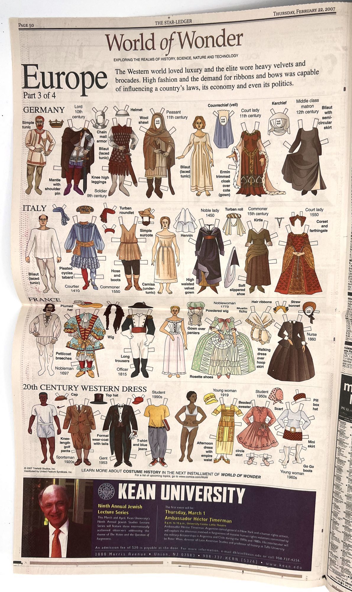 Newark, New Jersey: The Star-Ledger, 2007. Very good to near-fine. Horizontal folds.. Complete uncut set of the four-part "World of Wonder" historical fashion paper doll series published in four subsequent issues of New Jersey's "The Star-Ledger" newspaper in February 2007. The series included male and female paper dolls with tabbed colorful outfits and accessories to cut out for the following time periods/places in fashion history: Ancient Egypt, Assyria, Ancient Greece, Ancient Rome (Part 1); Turkey, Iran (Persia), India, and China (Part 2); Germany, Italy, France, and 20th century Western Dress (Part 3); indigenous peoples of the Far North, North America, Central America, and South America (Part 4). Highlights fashion and cultural customs that would not be familiar to readers of the paper, such as traditional foot binding in China. Note the inclusion of "20th century Western Dress", which encourages readers to analyze themselves through an anthropological/ethnographic lens. Interestingly, despite the series' clear commitment to diversity, it lacks any representation of peoples from Oceania (indigenous or otherwise). Each newspaper section is approx. 12 pp, and measures approx. 22" by 12.75". There are four sections total.