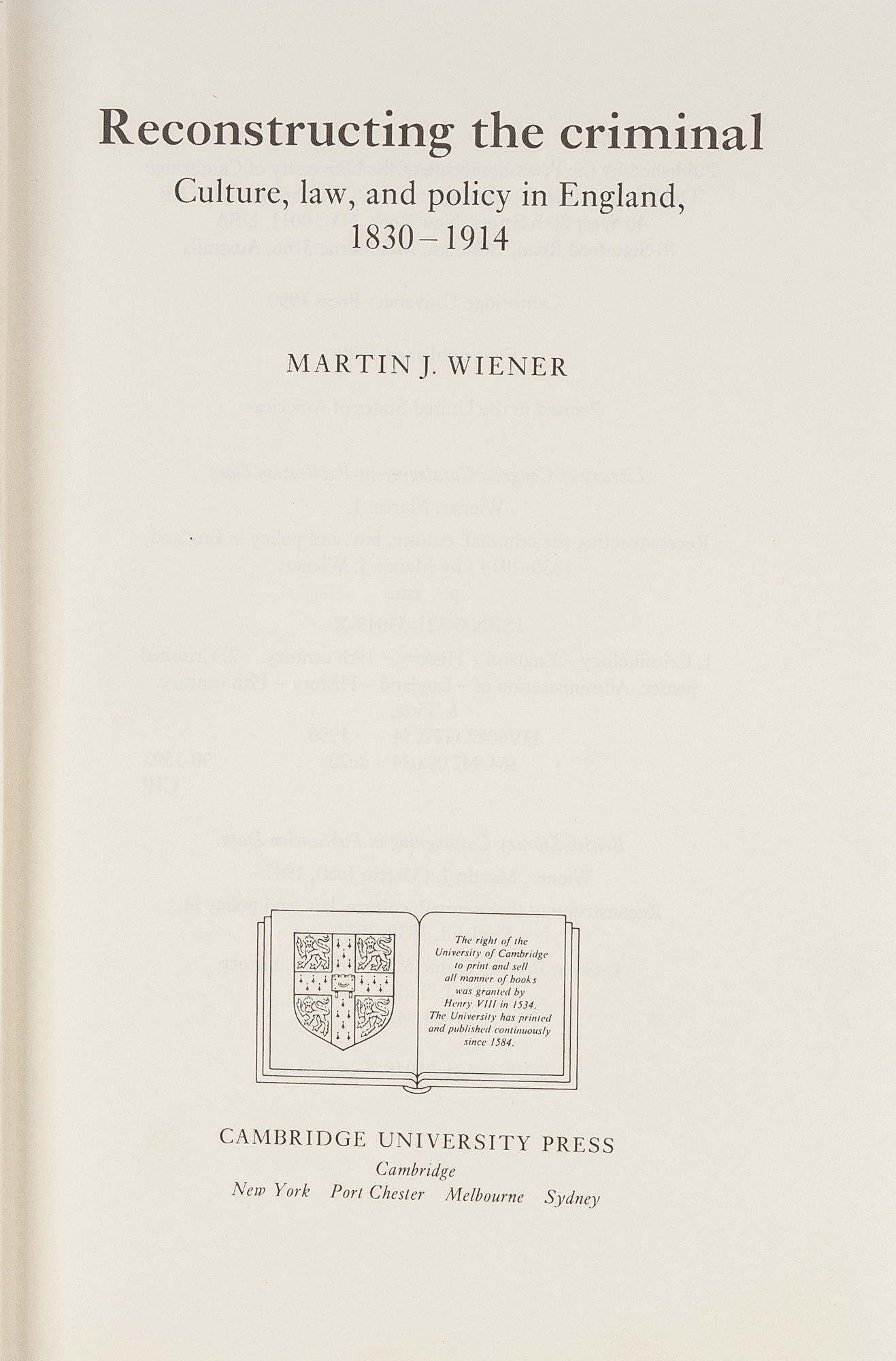 1990. Wiener, Martin J. Reconstructing the Criminal: Culture, Law, and Policy in England, 1830-1914. Cambridge [England]; New York: Cambridge University Press, 1990. ix, 381 pp., illustrations. Publisher's black cloth, with stamped spine, very good. In a fine dust jacket. $25. * This ambitious and imaginative work interprets criminal justice history by relating it to intellectual and cultural history. Starting from the assumption that policies and statutes originate in a society's values and norms, the author skillfully and persuasively demonstrates how changes in criminal law and penal practice were related to the changing values of early, mid, and late Victorian and Edwardian society. Wiener traces changes in the criminal justice system by examining the treatment of offenders. During the Victorian period the system became more punitive and then reformed to be more welfarist. This work offers insight into the contemporary Anglo-American penal system. In addition, Wiener's wide-ranging discussion of issues, most notably of free will versus determinism, sheds light on a broad range of Victorian history, beyond crime and punishment. (Publisher's description).