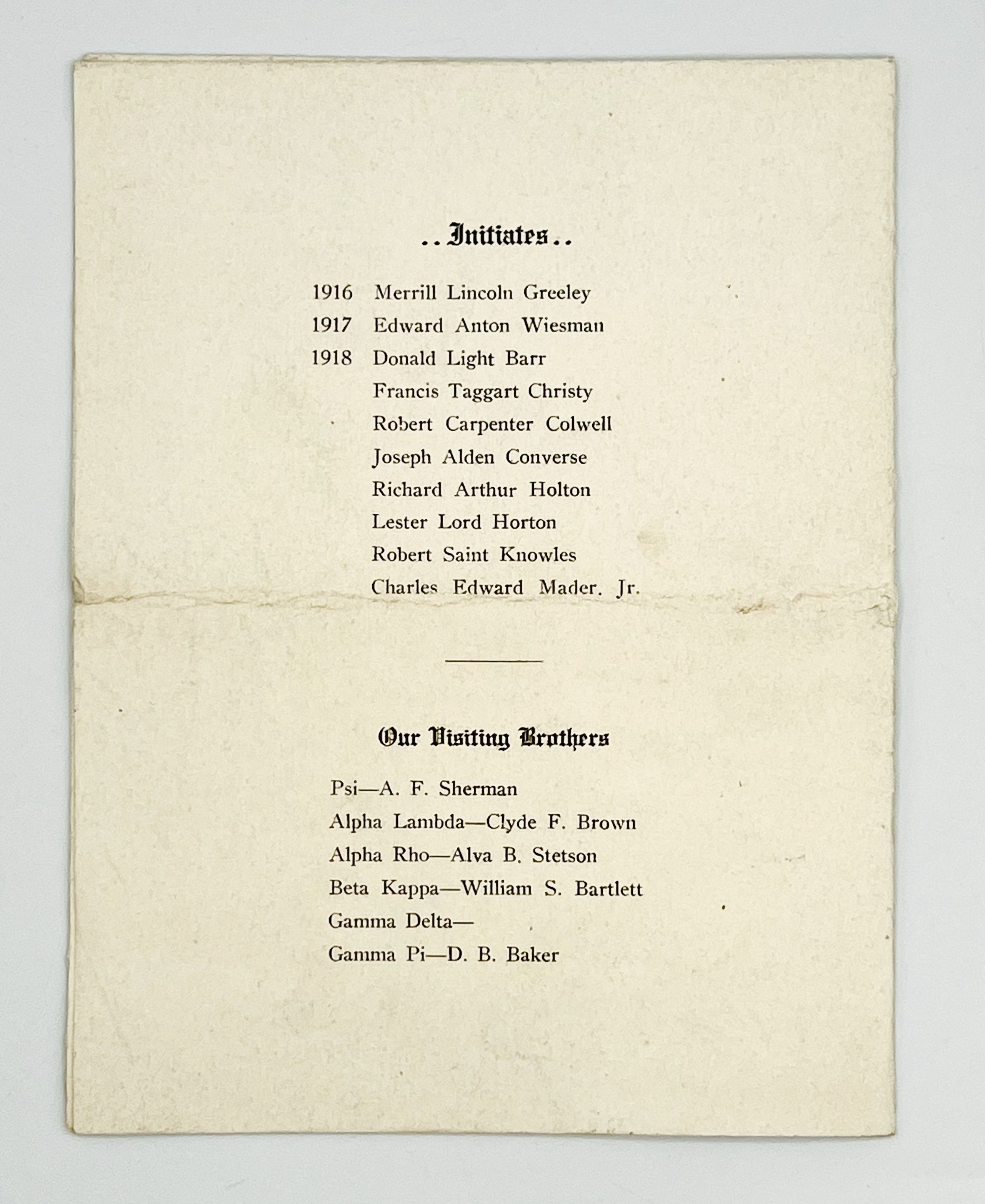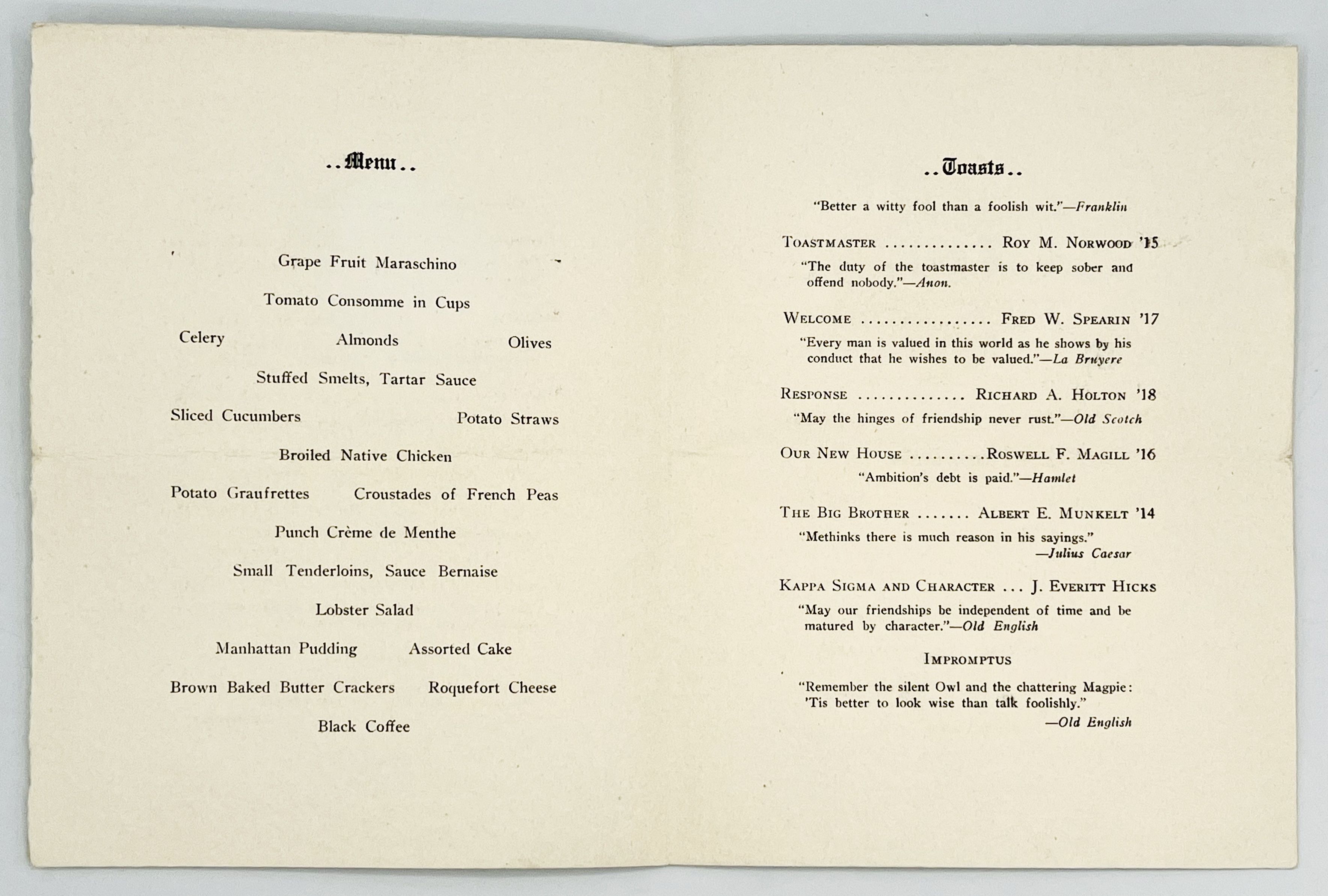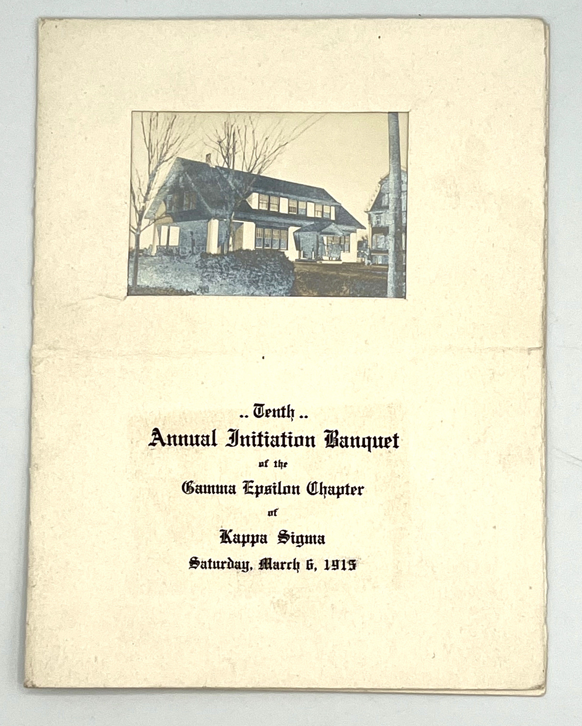 Hanover, NH, 1915. Cards. Cream cards, black and white photo. Near fine. 18.5 X 14 cm. Fraternity Program and Menu featuring the original photo of the wooden house the Kappa Sigma chapter built on Webster Avenue. Chi Gamma Epsilon began as the fraternal organization Beta Gamma in 1904. There were 11 founding members. In 1905, Beta Gamma was given national status as the Gamma Epsilon chapter of Kappa Sigma at Dartmouth College. From 1914 to 1916, the brothers raised enough money to build this small wooden house. The house was razed in 1935 for need of a larger structure. The menu features Stuffed Smelts, Broiled Native Chicken, Tenderloin, Lobster Salad, and Punch Crème de Menthe. Featured members gave Toasts, and Initiates and Visiting Brothers are listed on the rear of the program. Visible crease through the middle, otherwise clean with original photo displayed in a cutout on front cover.