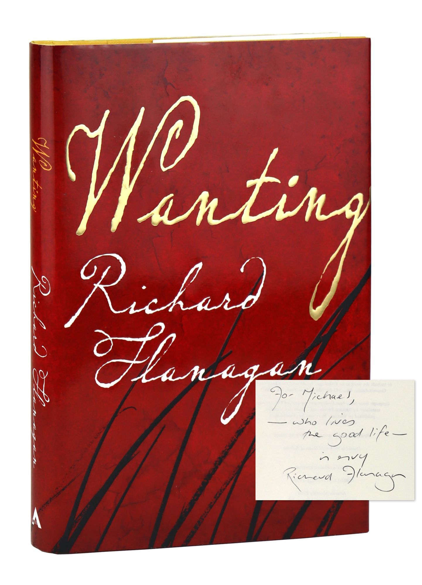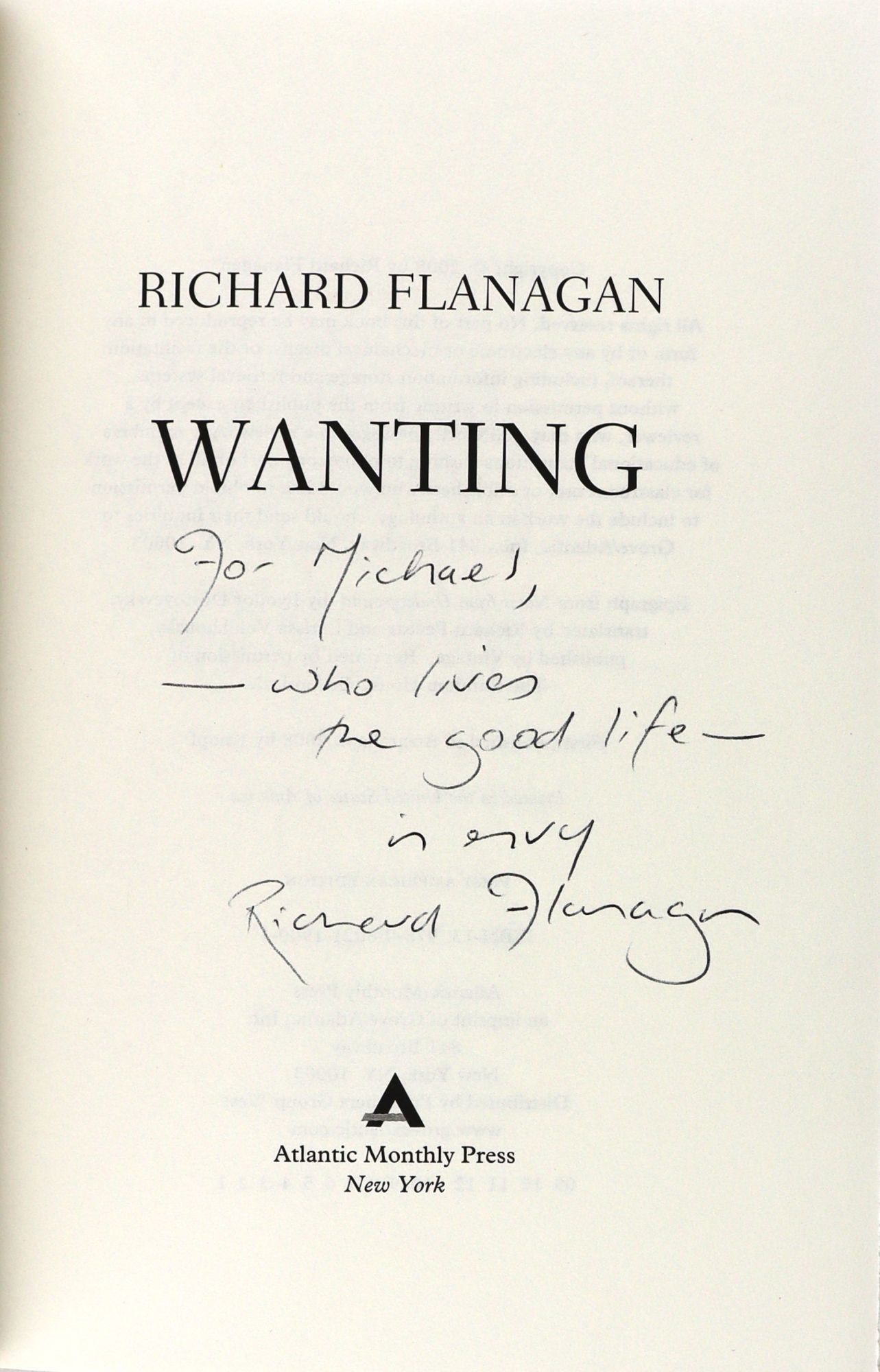 New York: Atlantic Monthly Press, 2008. Very Good/Very Good. New York: Atlantic Monthly Press, 2008. First American Edition, stated, with full numberline. Octavo. 256 pp. Illustrated dust jacket with $24.00 price intact. Mustard boards stamped in black; red endpapers. Light rubbing to edges of dust jacket, with some sticker residue over UPC and faint dust-soiling to surface. Boards show mild shelfwear. Binding sound and pages unmarked. Very Good. Signed by Richard Flanagan with brief inscription to previous owner at title page.