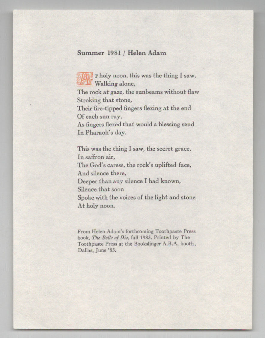 West Branch, IA: The Toothpaste Press, 1983. First edition. Small broadside that measures 7" x 5.5" and is printed in 2 colors. Done as a promotion for the then forthcoming book "The Bells of Dis" and given away at the A.B.A. in Dallas of 1983. A fine copy.