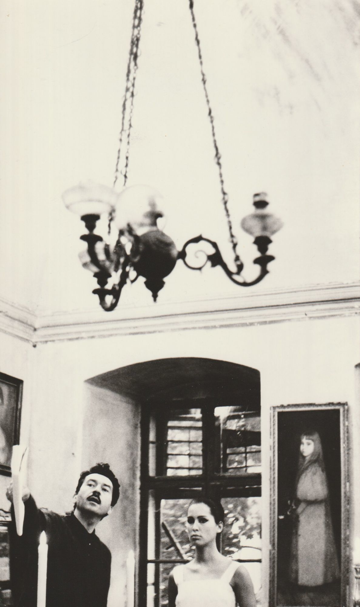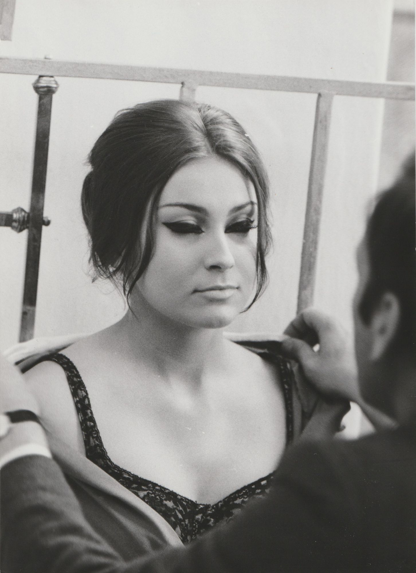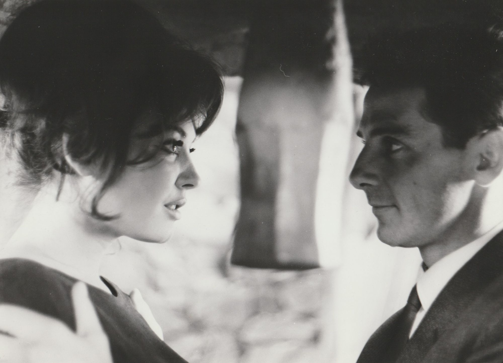 Double weight photograph shows director Alain Robbe-Grillet talking with actress Sylvie Bréal on the set.