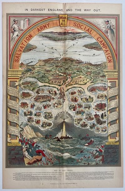 Featuring a doorway, the chart draws the viewer into a scene of Booth's imagined new Utopia. In the foreground is the stormy sea with a shipwreck and the Salvation Army lighthouse. Survivors are being rescued from the sea of starvation, beggary, misery, and other vices by the Salvation Army and guided to the "City Colony" and the various refugees and workshops. Beyond that we see the "Farm Colony" where those few who, having proved them worthy, are allowed to proceed. For those who find success in the Farm Colony we see steamers ferrying people across existing colonies of the British and other Empires, or to a "Colony Across the Sea" yet to be established. The two pillars of the doorway includes a statistical critique of the extent of misery and ruin in Great Britain, and includes the number of prostitutes, prison populations, suicides, levels of destitution, homelessness, and other miseries. The chart is in good condition. Minor wear and verso restoration along original foldlines.