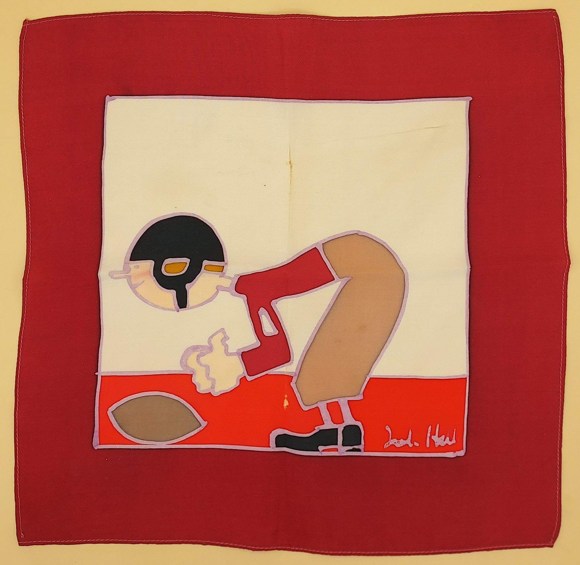 Very Good. Silk scarf measuring 12" x 12". Two fold lines (one horizontal, one vertical) through the center. 1" split in the cloth to the surface. A sporty design by John Held Jr.
