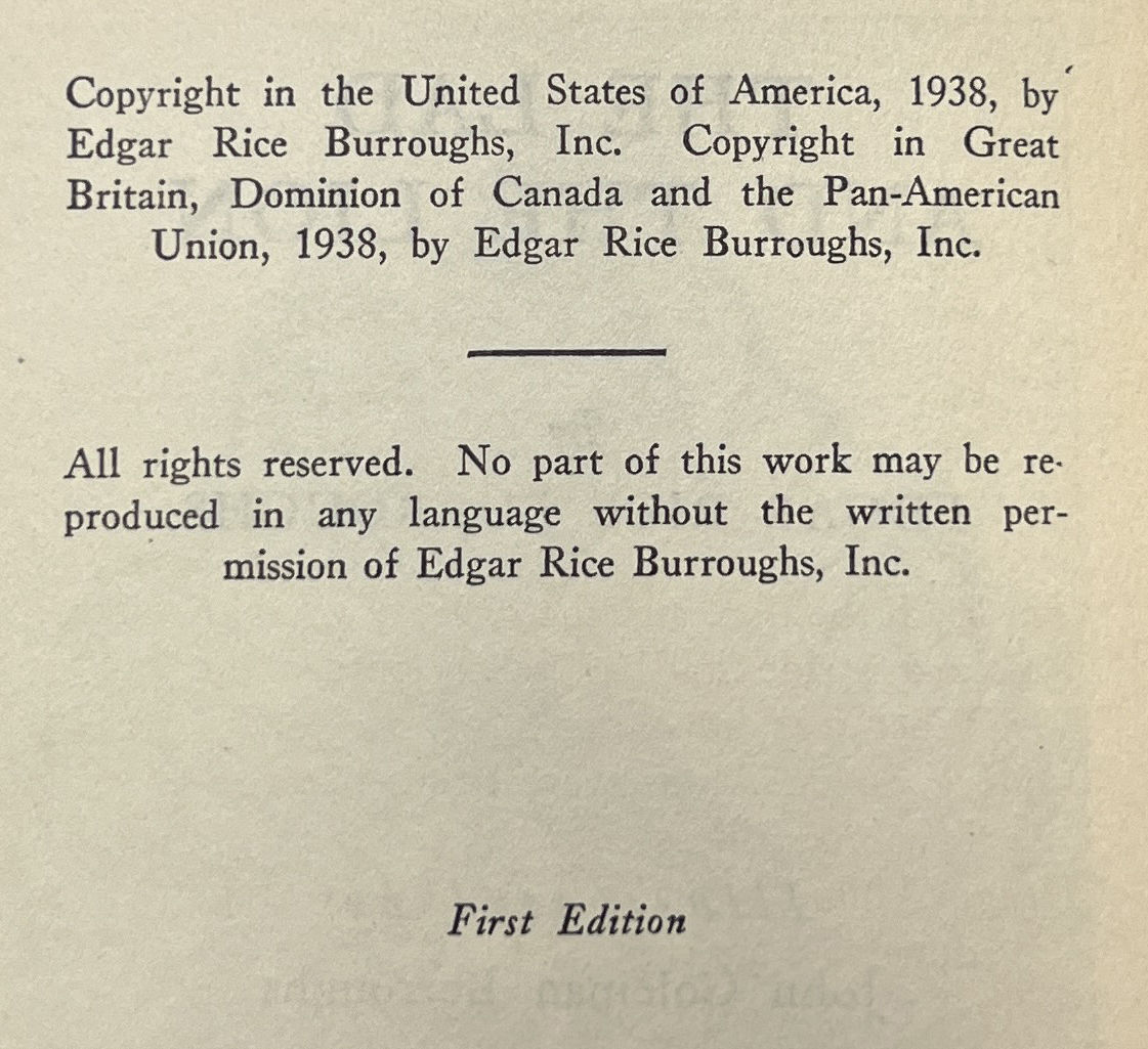 Tarzana: Edgar Rice Burroughs Inc, 1938. First Edition. Hardcover. Good. Frontispiece by John Coleman Burroughs. About Very Good, lacking the jacket. Blue cloth, pitted at the front gutter and board, lightly bumped at the corners. Square and firmly bound with a red top stain, clean internally. From the collection of Joan Bledig.