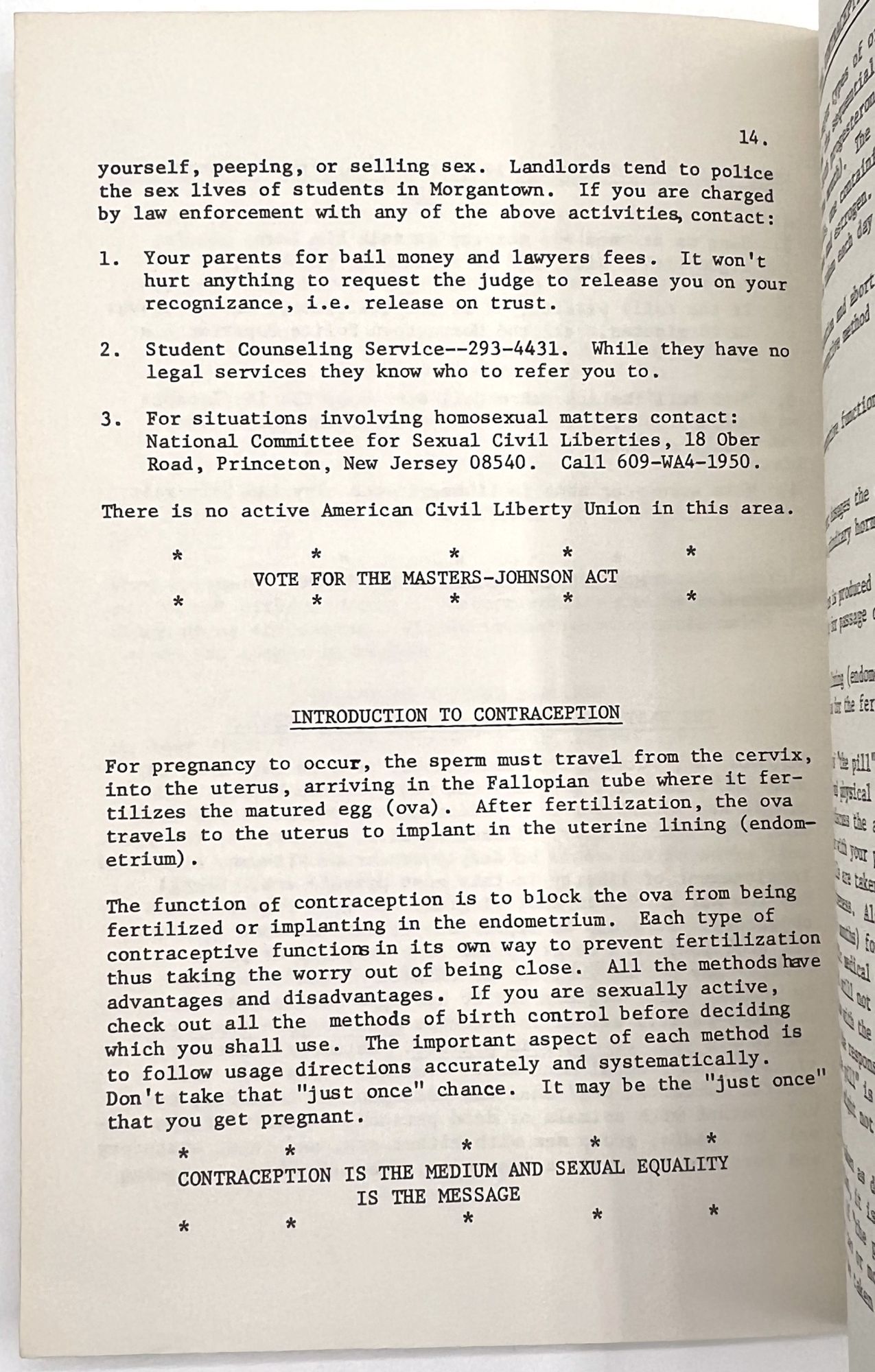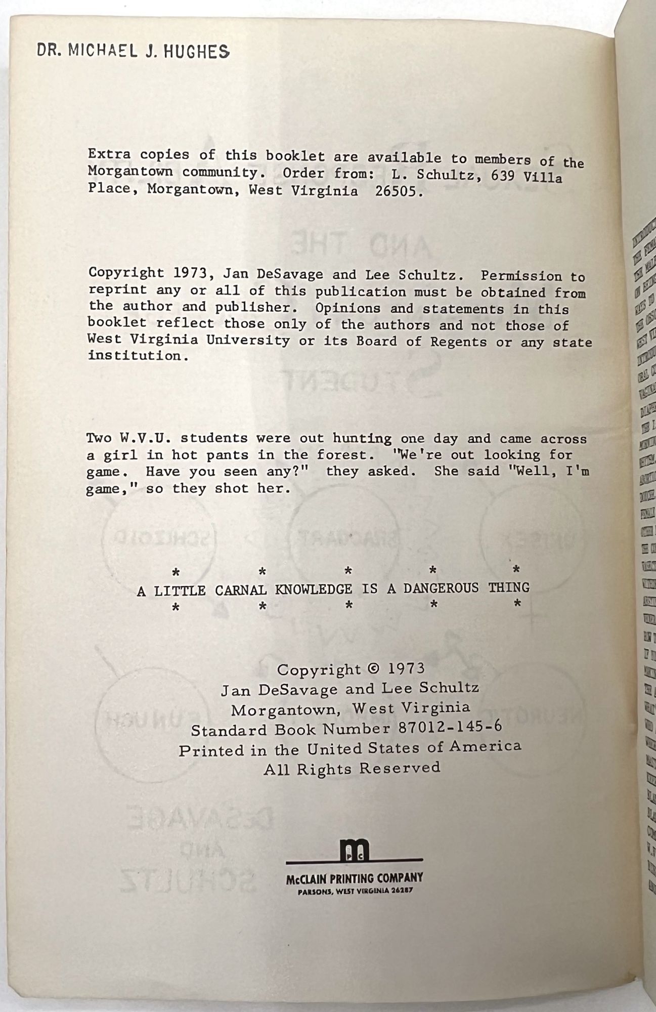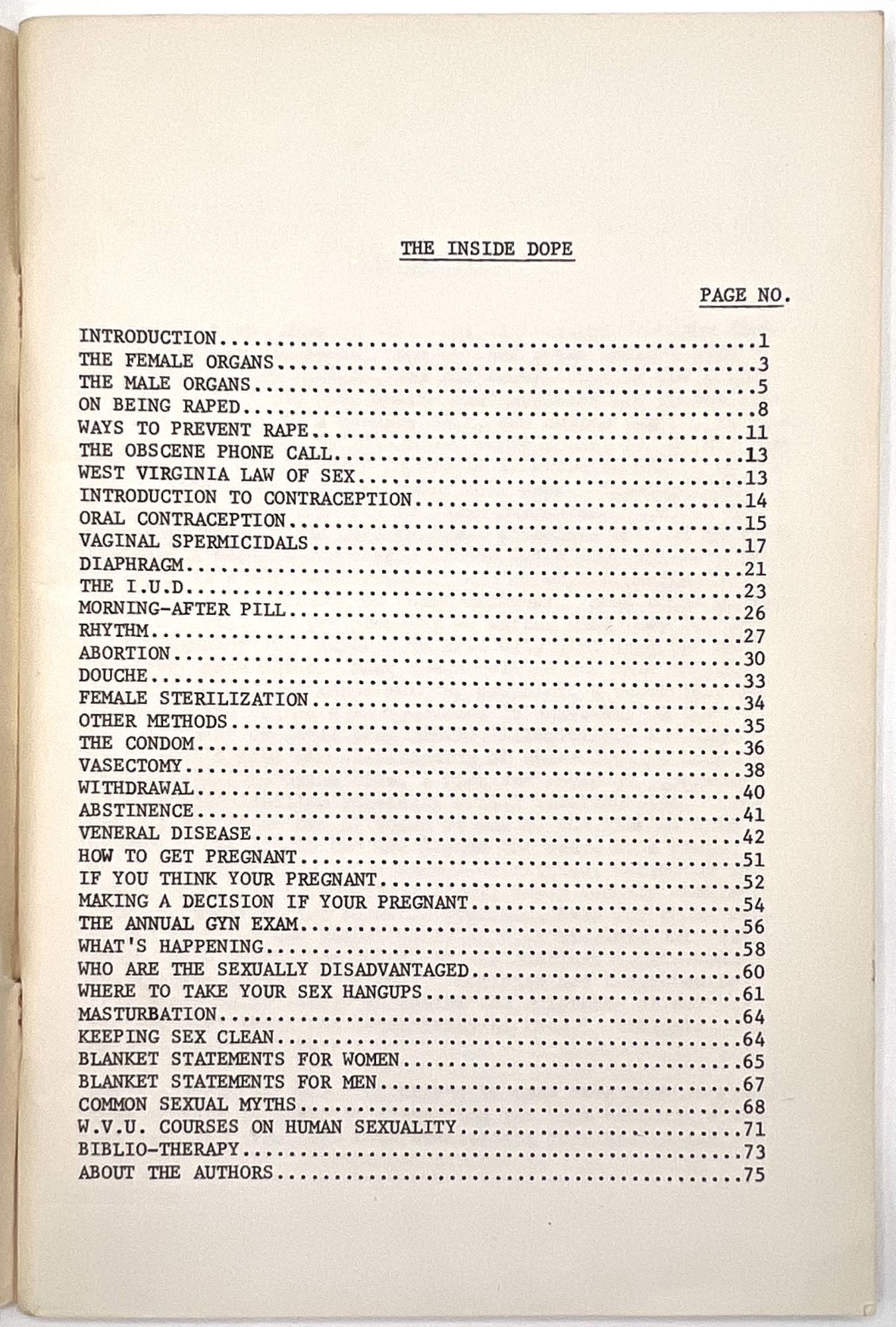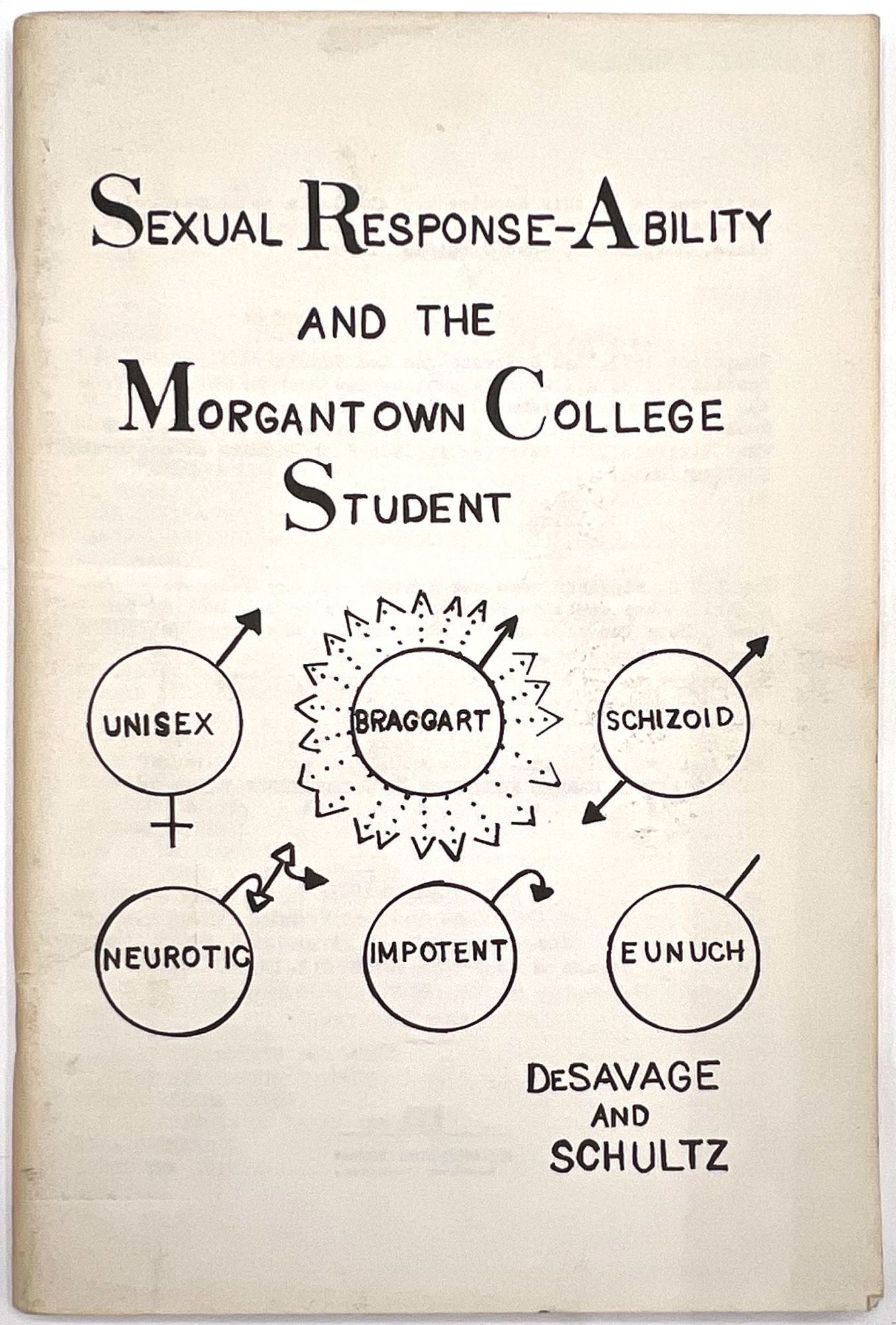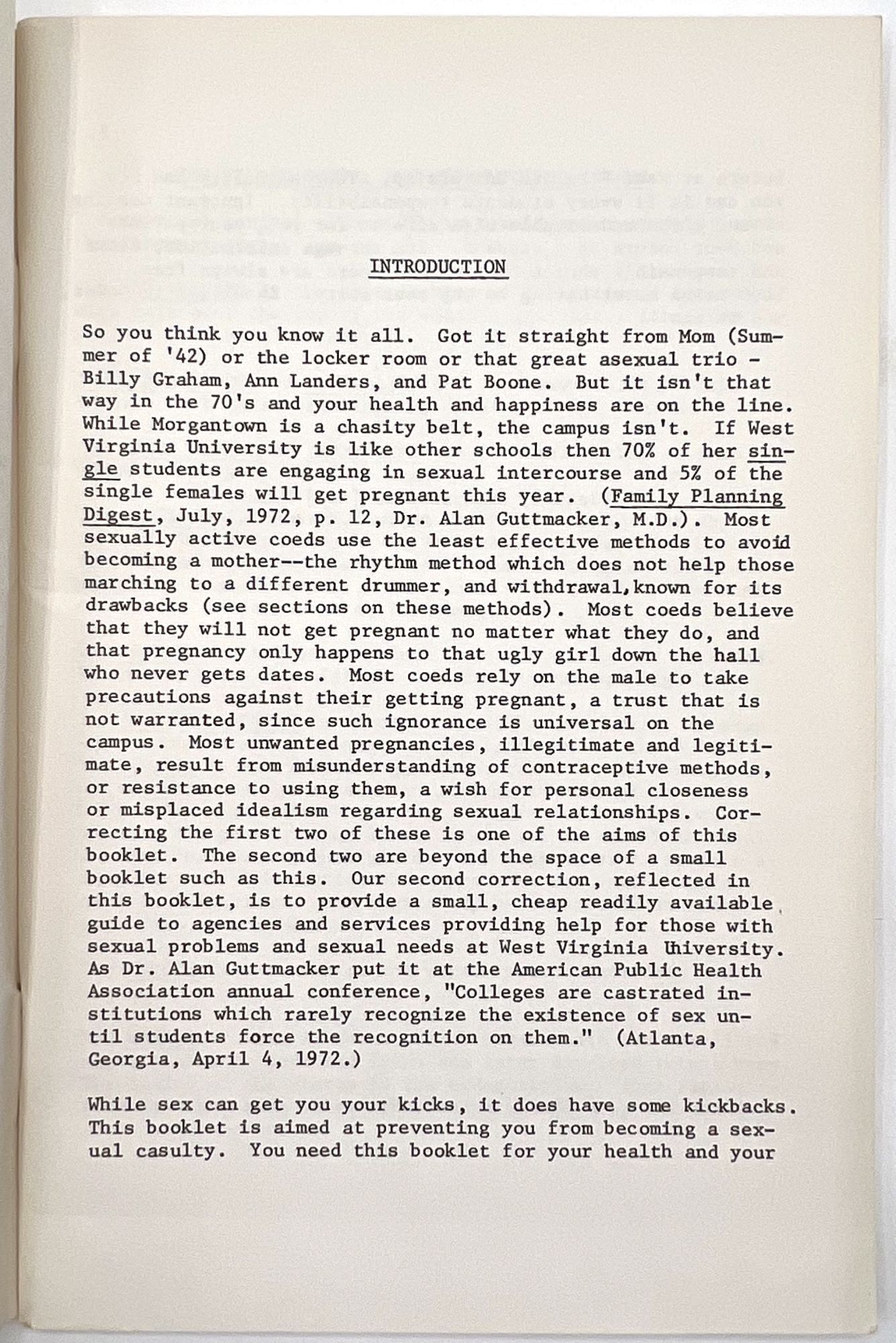 Morgantown, West Virginia, 1973. Very good. Minor staining to lower wrapper.. A no-nonsense sex education booklet from 1973, published for West Virginia University students in Morgantown, West Virginia, including non-judgmental information on the following subjects: sex anatomy; rape and sexual assault; methods of contraception; abortion; sterilization; venereal disease; pregnancy; common sexual myths; "sexual disadvantages" (e.g. premature ejaculation, painful intercourse); and resources for "where to take your sex problems and hang ups" (i.e. local counseling services). Includes frequent pithy and often humorous sound bites throughout designated with stars, such as: "GRAPE NUTS ARE NOT A VENEREAL DISEASE (RALPH NADER)" (pg. 51) and "IF GOD HAD MEANT FOR PEOPLE TO GO NUDE, THEY WOULD HAVE BEEN BORN THAT WAY" (pg. 65). Note the cover design, which emphasizes the diversity inherent in human sexuality. Single vol. (8.5" by 5.5"), pp. 76, original illus. wrps. Note page 33, which assures students that "In time, Morgantown will develop abortion services since the United States Supreme Court (1973) legalized abortion". As of the writing of this description, the practice is banned in the state.
