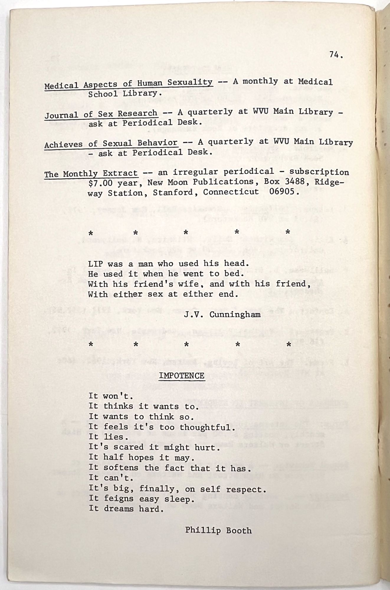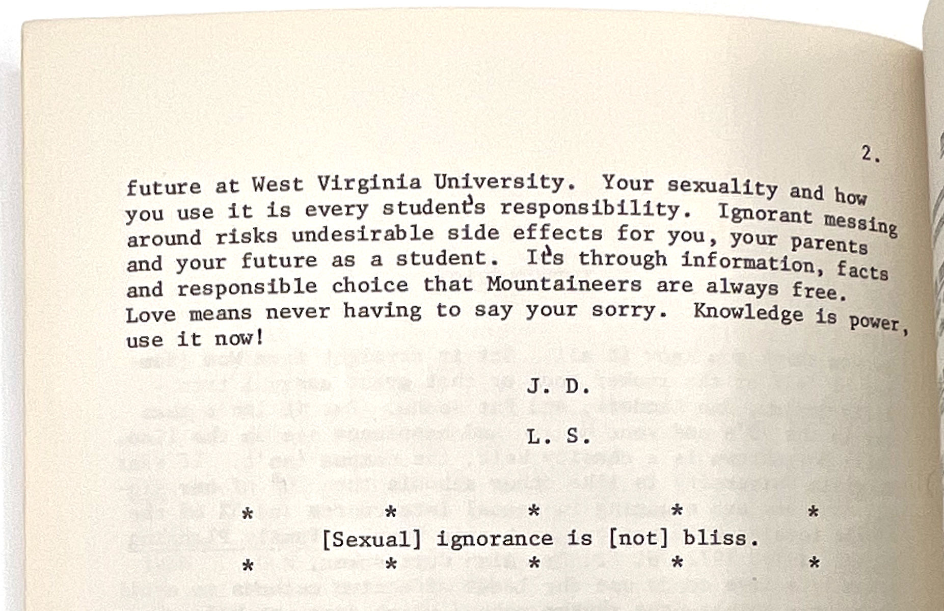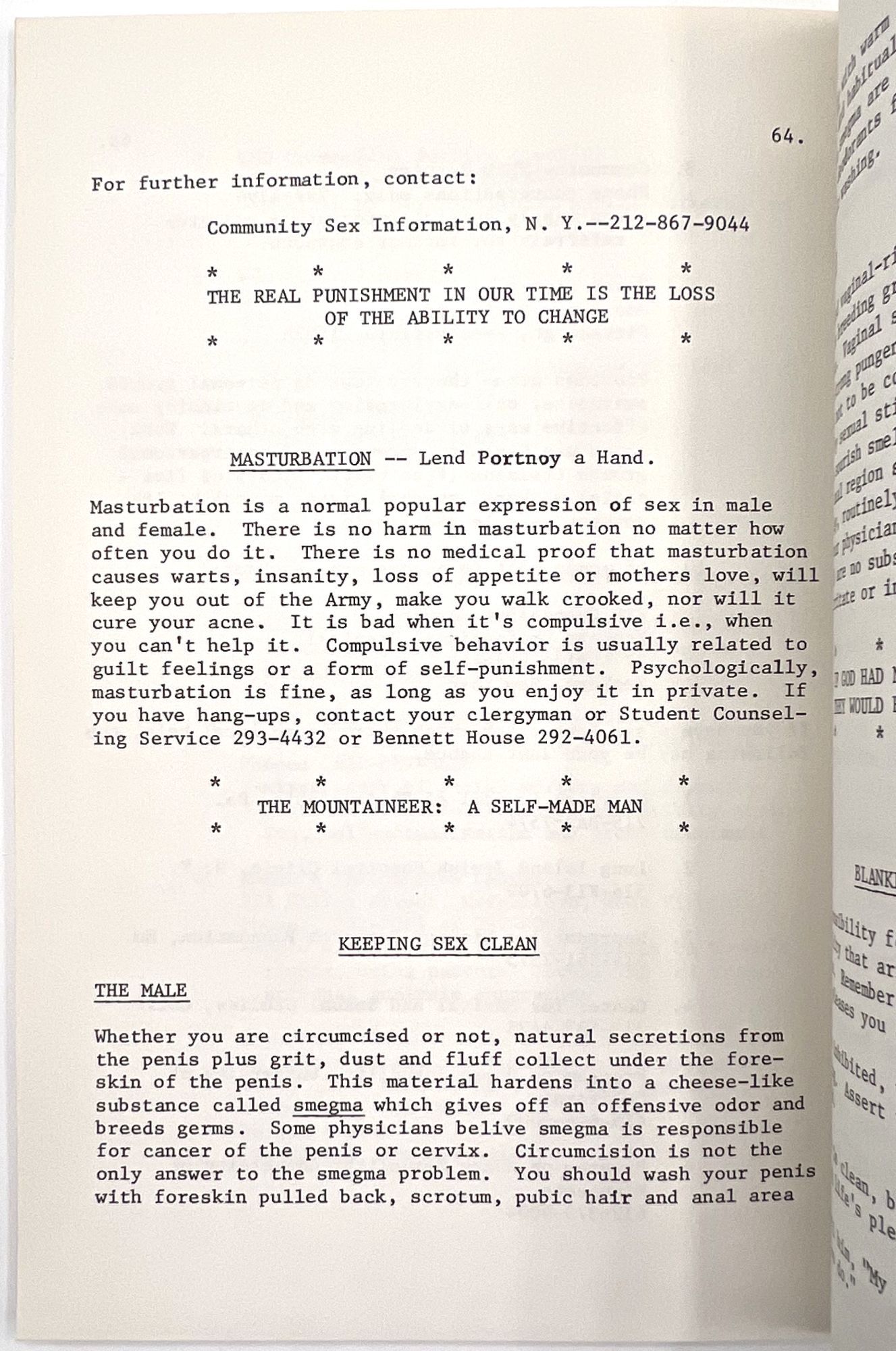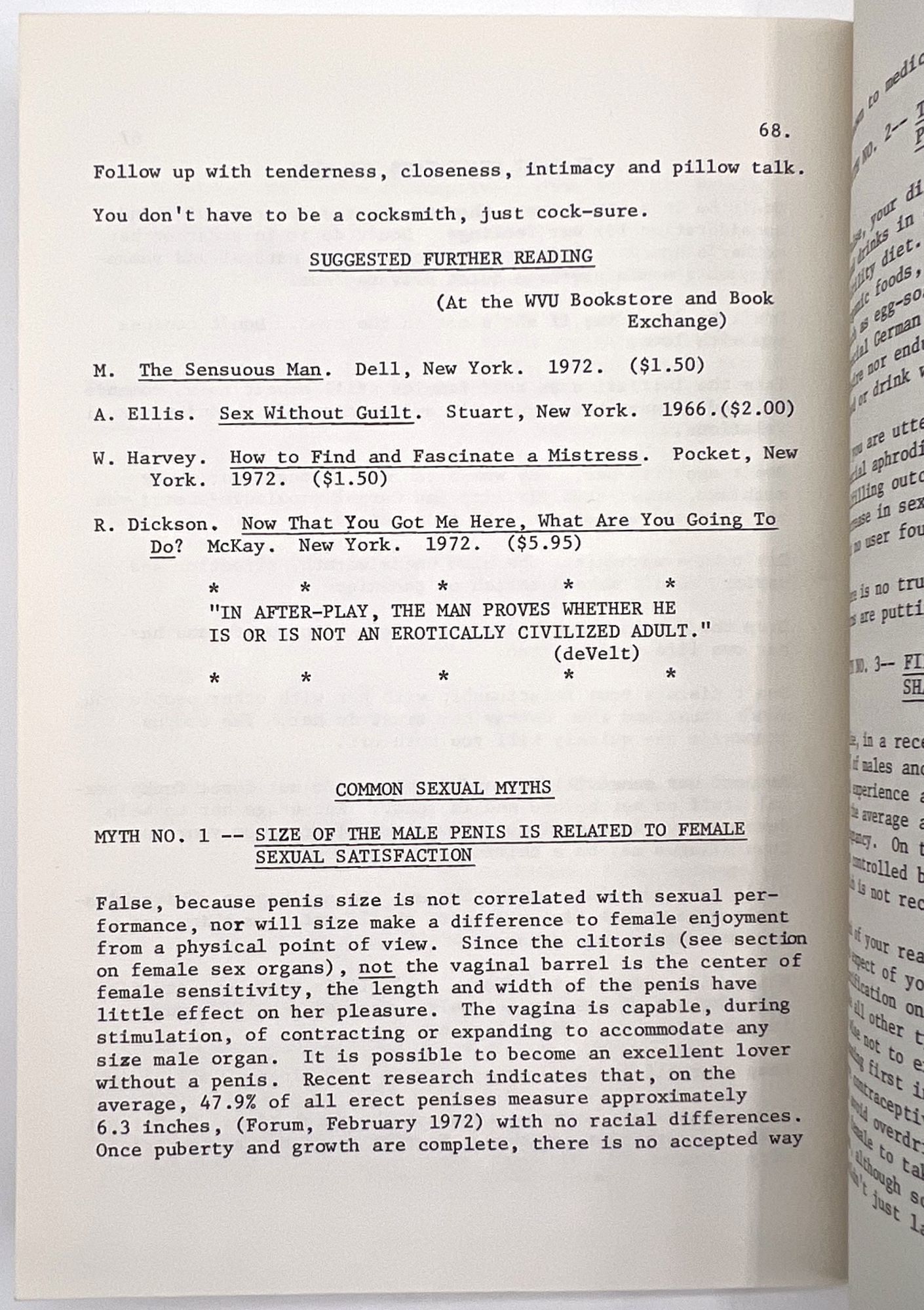 Morgantown, West Virginia, 1973. Very good. Minor staining to lower wrapper.. A no-nonsense sex education booklet from 1973, published for West Virginia University students in Morgantown, West Virginia, including non-judgmental information on the following subjects: sex anatomy; rape and sexual assault; methods of contraception; abortion; sterilization; venereal disease; pregnancy; common sexual myths; "sexual disadvantages" (e.g. premature ejaculation, painful intercourse); and resources for "where to take your sex problems and hang ups" (i.e. local counseling services). Includes frequent pithy and often humorous sound bites throughout designated with stars, such as: "GRAPE NUTS ARE NOT A VENEREAL DISEASE (RALPH NADER)" (pg. 51) and "IF GOD HAD MEANT FOR PEOPLE TO GO NUDE, THEY WOULD HAVE BEEN BORN THAT WAY" (pg. 65). Note the cover design, which emphasizes the diversity inherent in human sexuality. Single vol. (8.5" by 5.5"), pp. 76, original illus. wrps. Note page 33, which assures students that "In time, Morgantown will develop abortion services since the United States Supreme Court (1973) legalized abortion". As of the writing of this description, the practice is banned in the state.