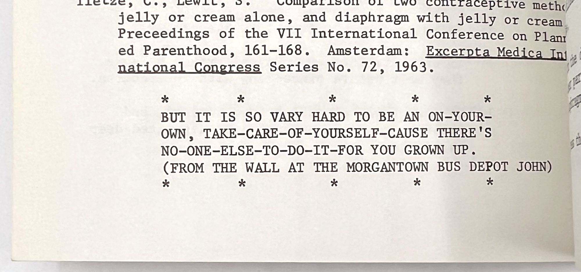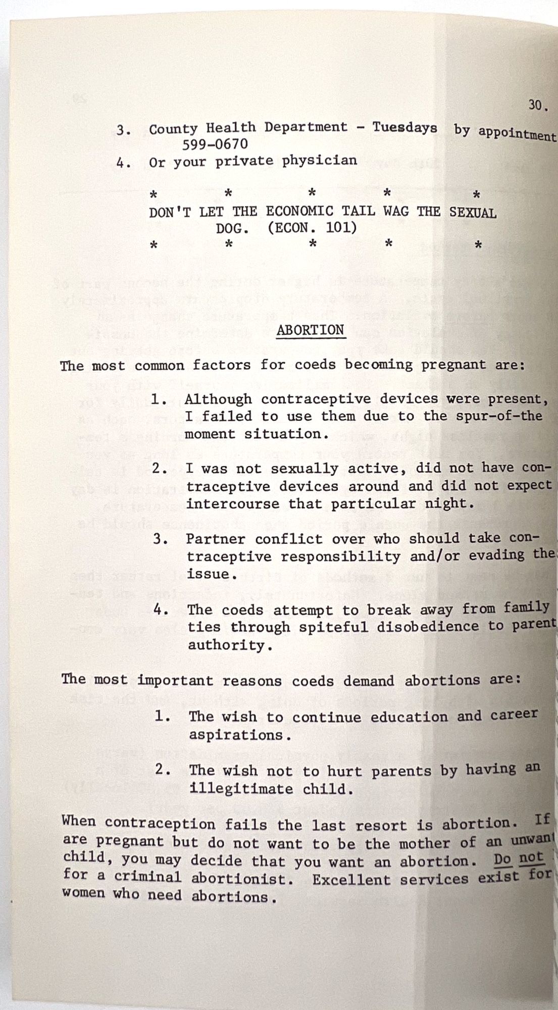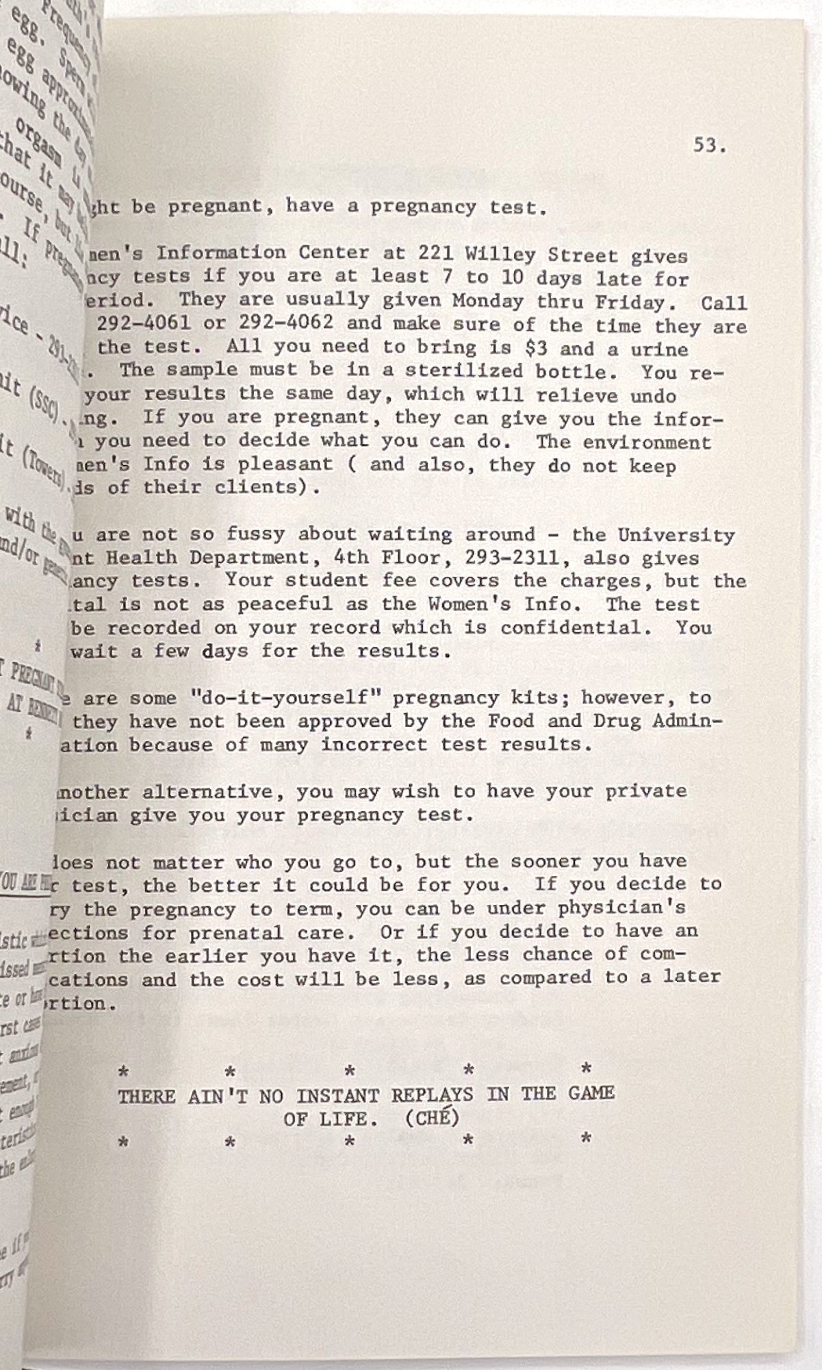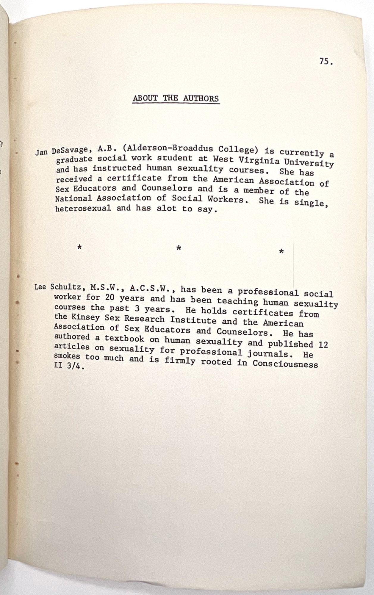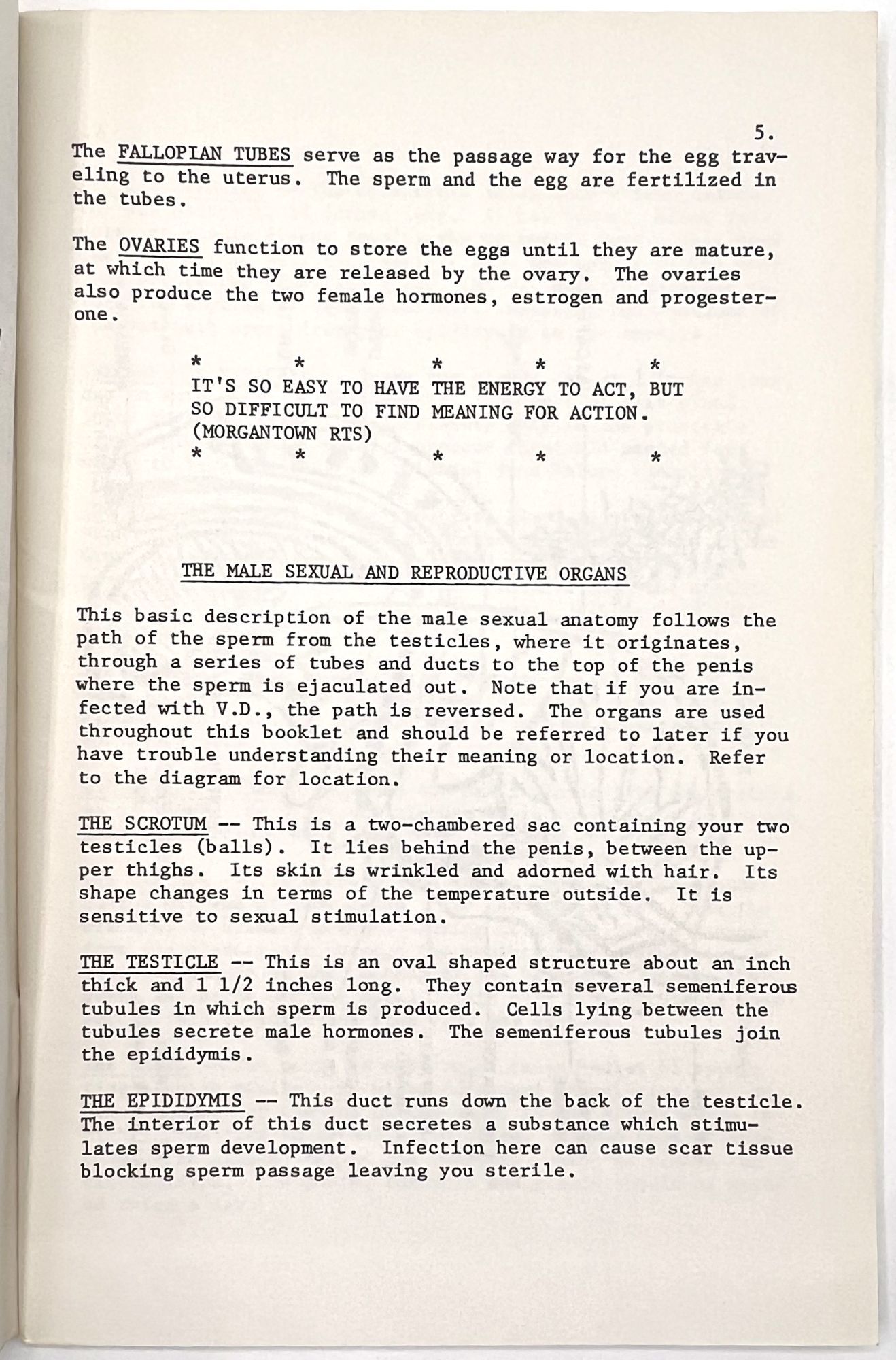 Morgantown, West Virginia, 1973. Very good. Minor staining to lower wrapper.. A no-nonsense sex education booklet from 1973, published for West Virginia University students in Morgantown, West Virginia, including non-judgmental information on the following subjects: sex anatomy; rape and sexual assault; methods of contraception; abortion; sterilization; venereal disease; pregnancy; common sexual myths; "sexual disadvantages" (e.g. premature ejaculation, painful intercourse); and resources for "where to take your sex problems and hang ups" (i.e. local counseling services). Includes frequent pithy and often humorous sound bites throughout designated with stars, such as: "GRAPE NUTS ARE NOT A VENEREAL DISEASE (RALPH NADER)" (pg. 51) and "IF GOD HAD MEANT FOR PEOPLE TO GO NUDE, THEY WOULD HAVE BEEN BORN THAT WAY" (pg. 65). Note the cover design, which emphasizes the diversity inherent in human sexuality. Single vol. (8.5" by 5.5"), pp. 76, original illus. wrps. Note page 33, which assures students that "In time, Morgantown will develop abortion services since the United States Supreme Court (1973) legalized abortion". As of the writing of this description, the practice is banned in the state.