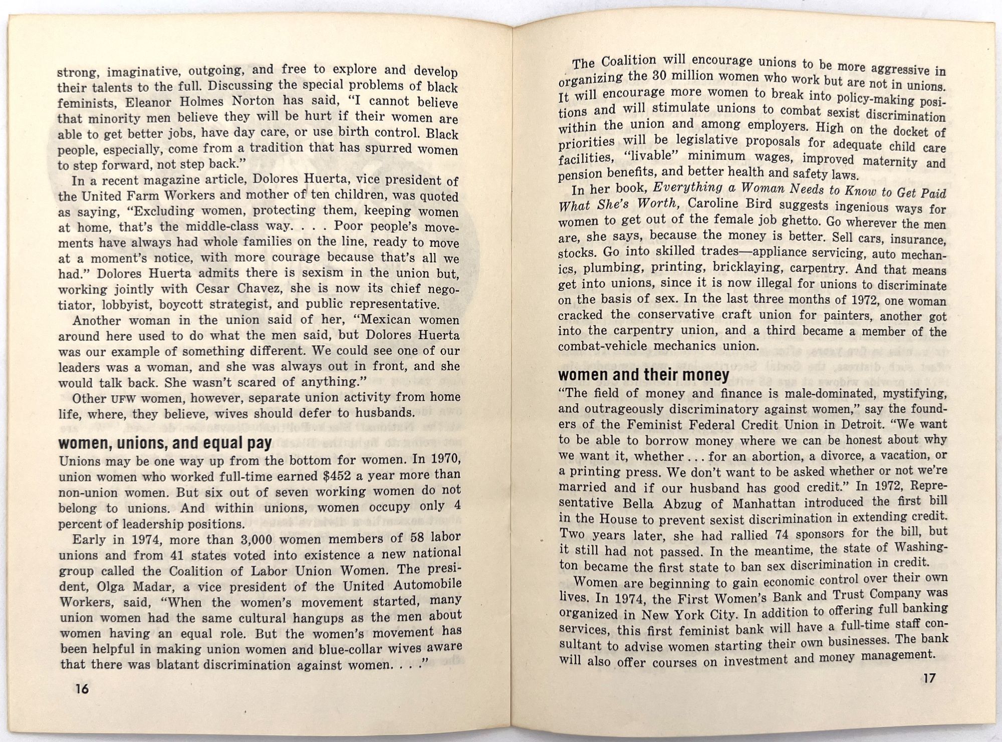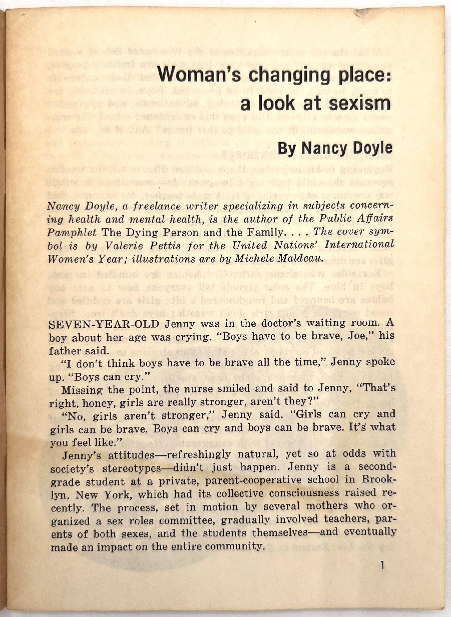 New York, New York: Public Affairs Pamphlets, 1974. Very good. Sunned, toned. One or two minor nicks, minor short tears.. First edition of a 1974 pamphlet on sexism and gender roles in American society, addressing the following subjects: the reinforcement of gender roles in childhood; sexism in schools; women in business; unions and the struggle for equal pay; specific struggles faced by women of color; ageism; the psychological toll of sexism; equity in competitive sport; religion and sexism; and issues facing women globally. Published in a series of "Public Affairs Pamphlets". Note the list of other pamphlets available in the rear, addressing issues ranging from parenting education and mental health to homosexuality in America, venereal diseases, and race relations. Single vol. (7" by 5"), pp. 28, stapled in original illus. mauve wrps with feminist symbol on front. "Boys have trucks. Girls have dolls.
