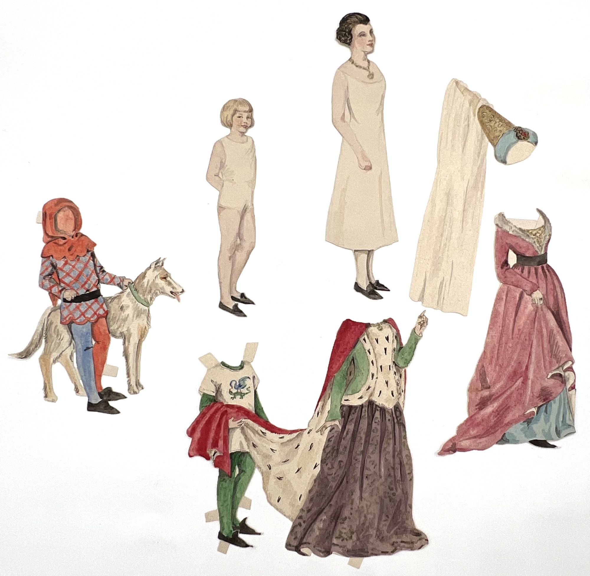 United States, 1930. Near-fine.. A charming Medieval theme paper doll set with fine original watercolor and pencil artwork, hand cut and designed. It includes one 4.75" paper doll depicting a pretty young brunette medieval princess, and a 3.75" blonde page boy to accompany her. They each share one outfit, which shows the page carrying a fine ermine train behind her. She also has a fine pink gown with pointed princess hat and veil, and he has his own jester costume with dog. A very charming work of original art bringing history alive for children.
