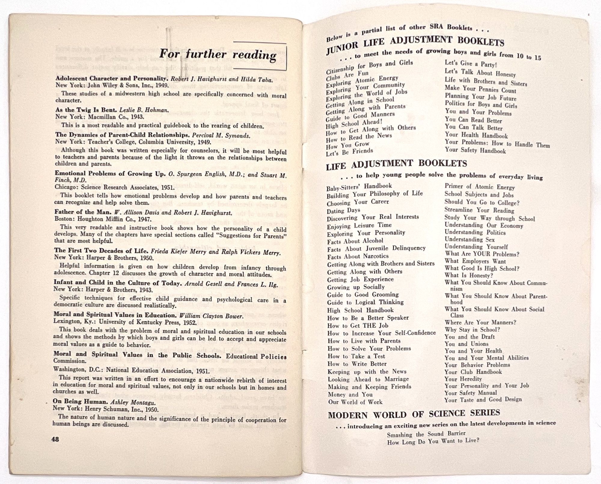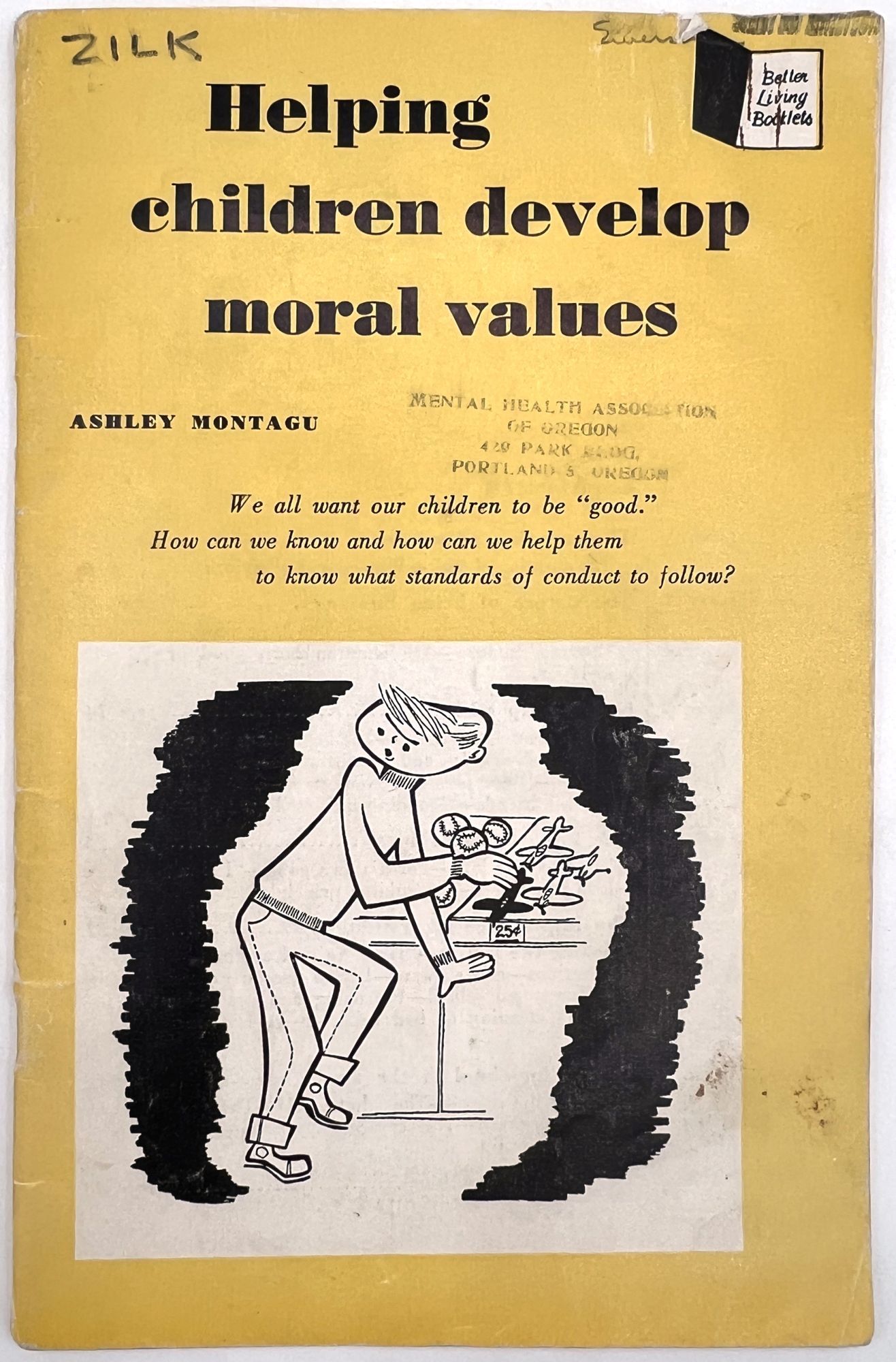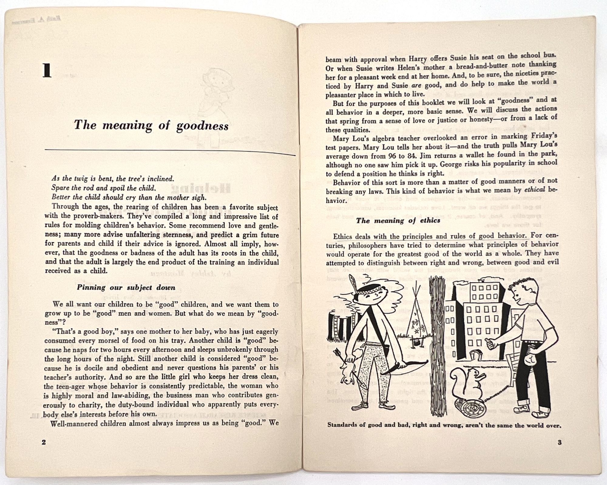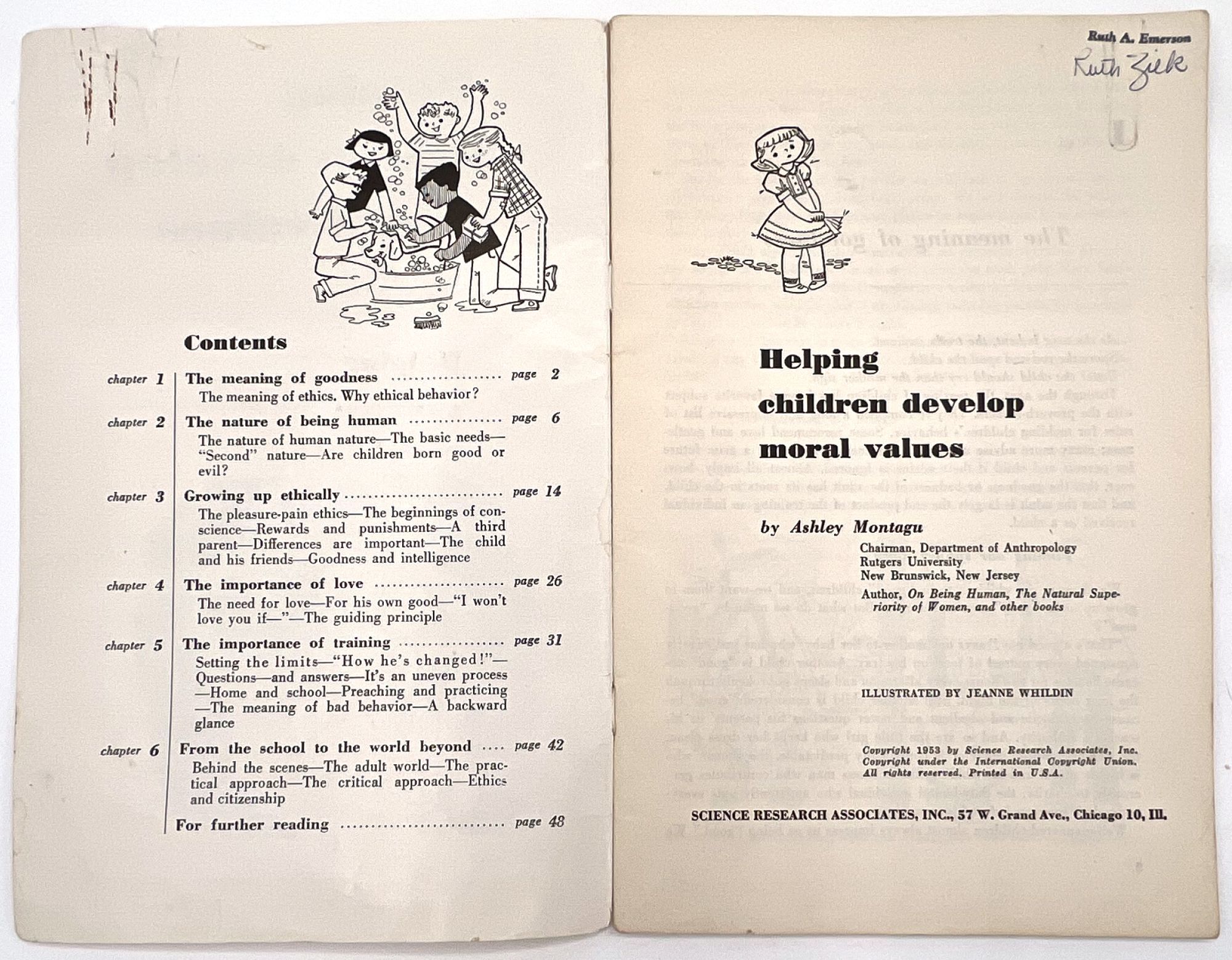 Chicago, Illinois, 1953. Very good. Minor dust soiling, a little rust staining from previous paper clip on front cover.. A parenting education booklet focusing on how to instill desirable moral values in children: "We all want our children to be 'good'. How can we know and how can we help them to know what standards of conduct to follow?" (cover). Provides valuable insight into the vales and social morays of 1953. The subjects addressed include: the meaning of goodness, and what ethics are; meeting basic human needs; growing up ethically; the importance of love; the importance of training, limits, rewards and punishment; and helping children envision a world beyond school into adulthood. Note the many friendly illustrations for parents reading, making the job of raising moral children less daunting. Single vol. (8.5" by 5.5"), pp. 48, illus., stapled in original illus. wrps depicting a boy thinking about steaming a toy plane in a shop. Ownership markings on cover. This particular copy was owned by Ruth Emerson Zilk (1924-1998), a child development researcher who earned her BA and MA degrees from Cornell before teaching there and at Oregon State University. Loosely enclosed are two typewritten pages of notes from Zilk, providing a window into her point of view and training in childhood development.