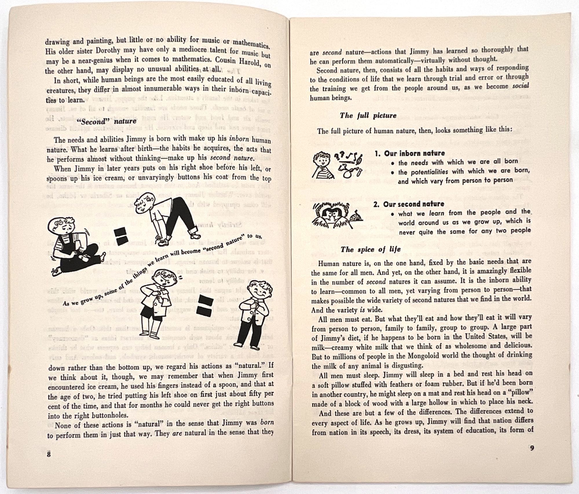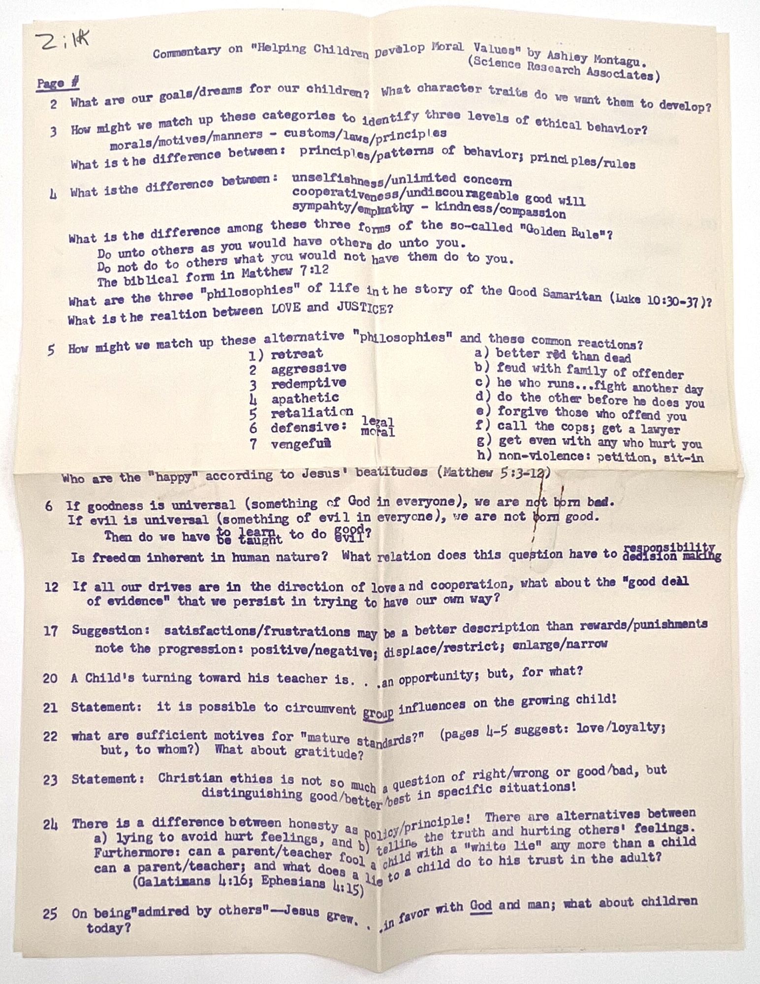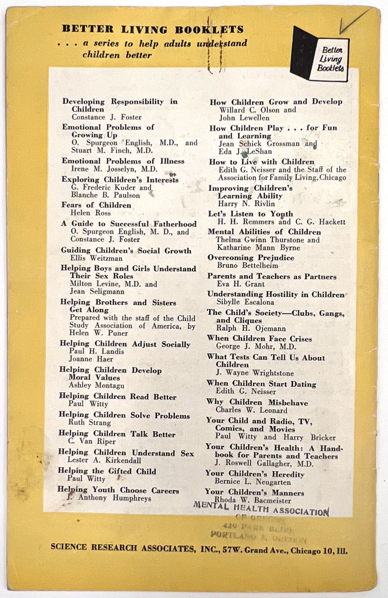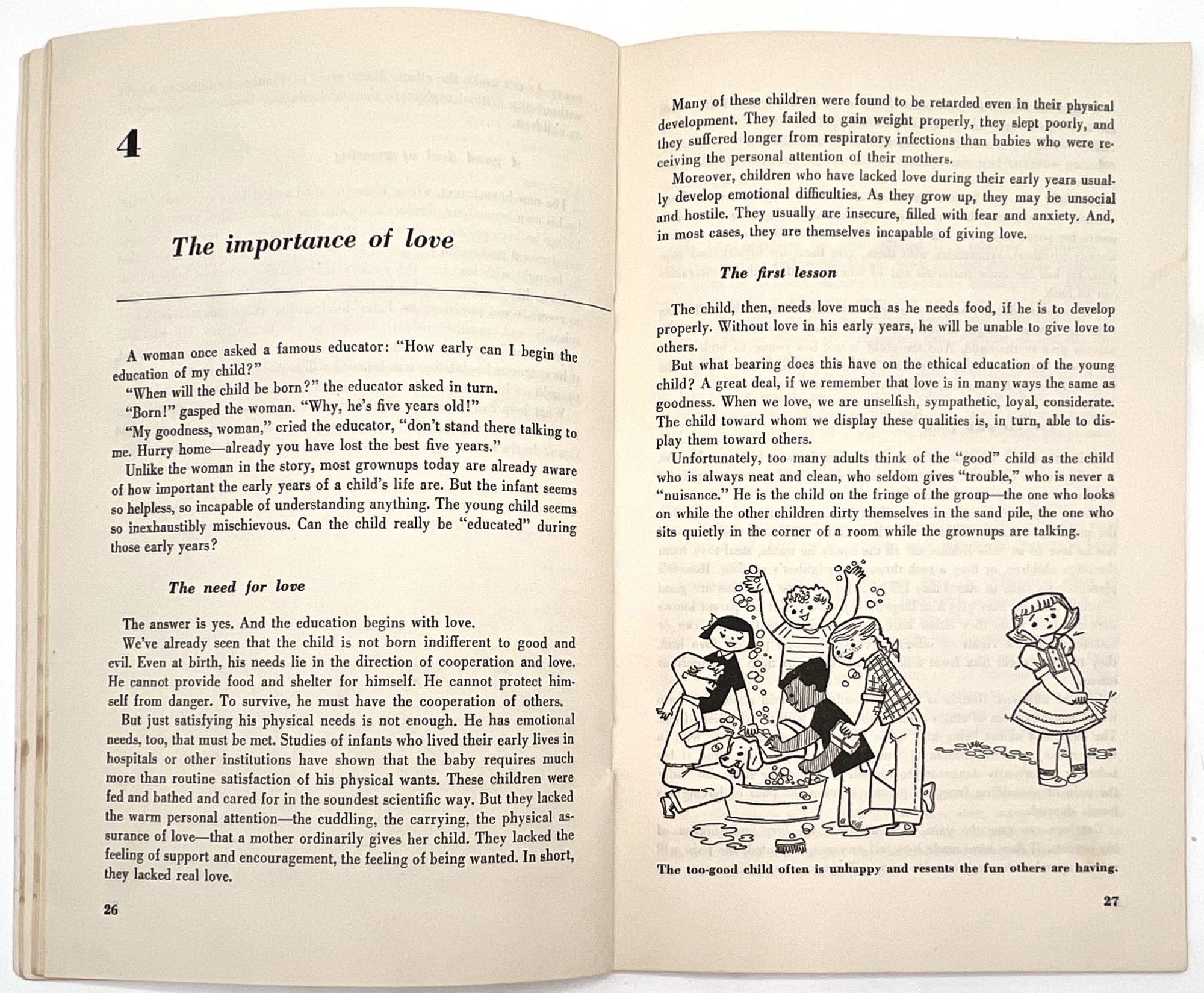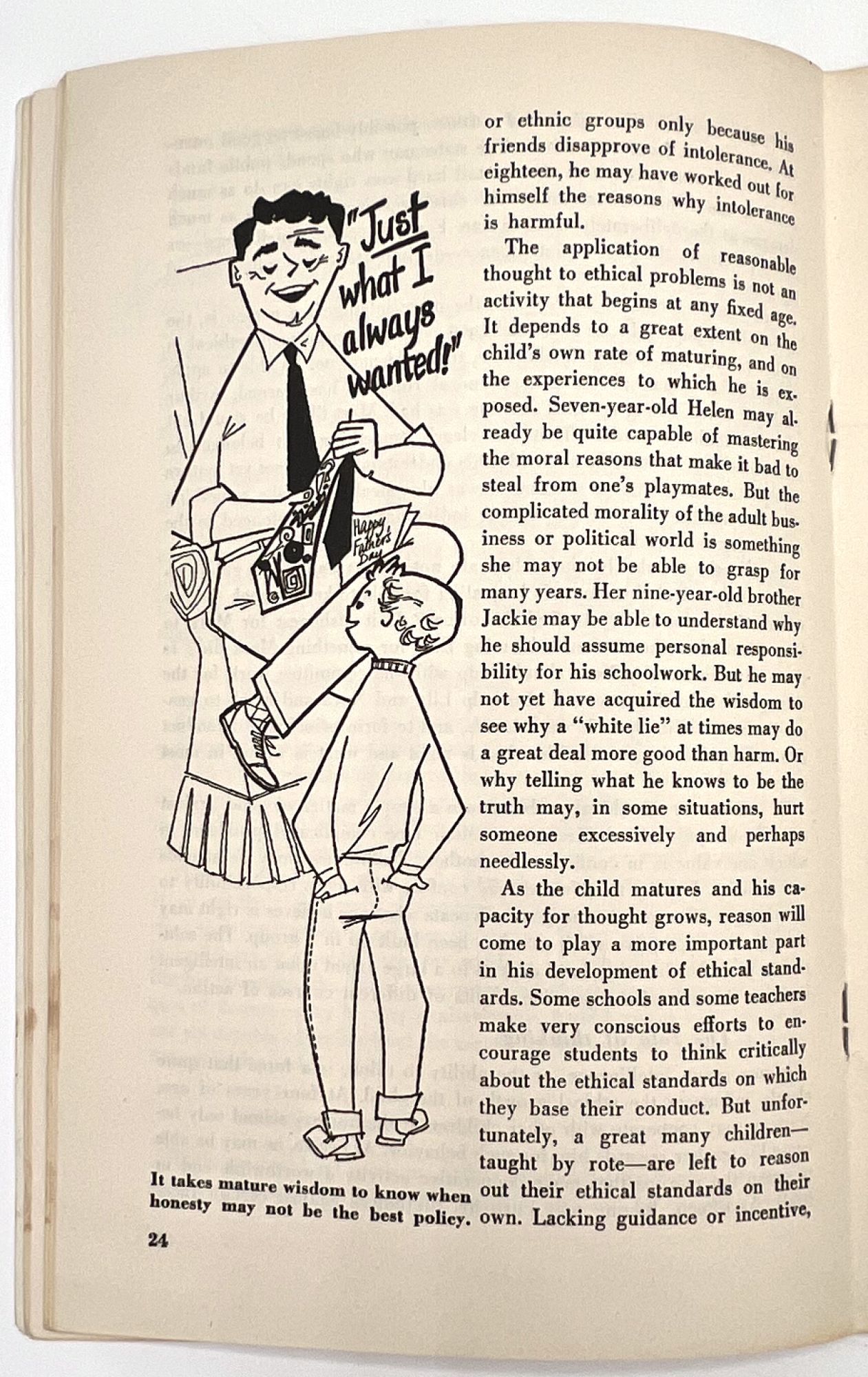 Chicago, Illinois, 1953. Very good. Minor dust soiling, a little rust staining from previous paper clip on front cover.. A parenting education booklet focusing on how to instill desirable moral values in children: "We all want our children to be 'good'. How can we know and how can we help them to know what standards of conduct to follow?" (cover). Provides valuable insight into the vales and social morays of 1953. The subjects addressed include: the meaning of goodness, and what ethics are; meeting basic human needs; growing up ethically; the importance of love; the importance of training, limits, rewards and punishment; and helping children envision a world beyond school into adulthood. Note the many friendly illustrations for parents reading, making the job of raising moral children less daunting. Single vol. (8.5" by 5.5"), pp. 48, illus., stapled in original illus. wrps depicting a boy thinking about steaming a toy plane in a shop. Ownership markings on cover. This particular copy was owned by Ruth Emerson Zilk (1924-1998), a child development researcher who earned her BA and MA degrees from Cornell before teaching there and at Oregon State University. Loosely enclosed are two typewritten pages of notes from Zilk, providing a window into her point of view and training in childhood development.