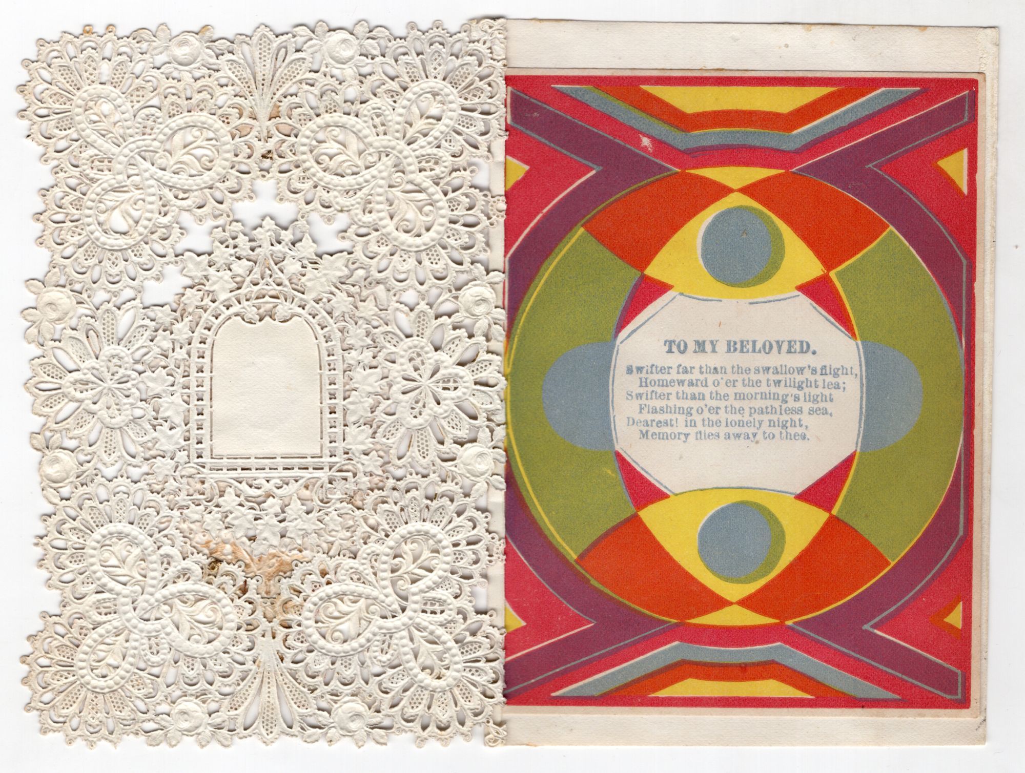 England, 1850. very good. Light toning, a little discoloration on verso of upper leaf from adhesive used.. An elaborate, bright and colorful 12mo Valentine made from gilded lace paper, embossed Victorian scrap, and a remarkably modern looking chromolithograph motto on the inside. The motto is titled "To My Beloved" and reads, "Swifter far than the swallow's flight, Homeward o'er the twilight lea; Swifter than the morning's light Flashing o'er the pathless sea, Dearest! In the lonely night, Memory flies away to thee." The surrounding design, though clearly Victorian, feels more like something that would be designed in the 1960s or 1970s. A fine and very interesting Valentine, well-preserved. Bifolium (4.75" by 3.5").