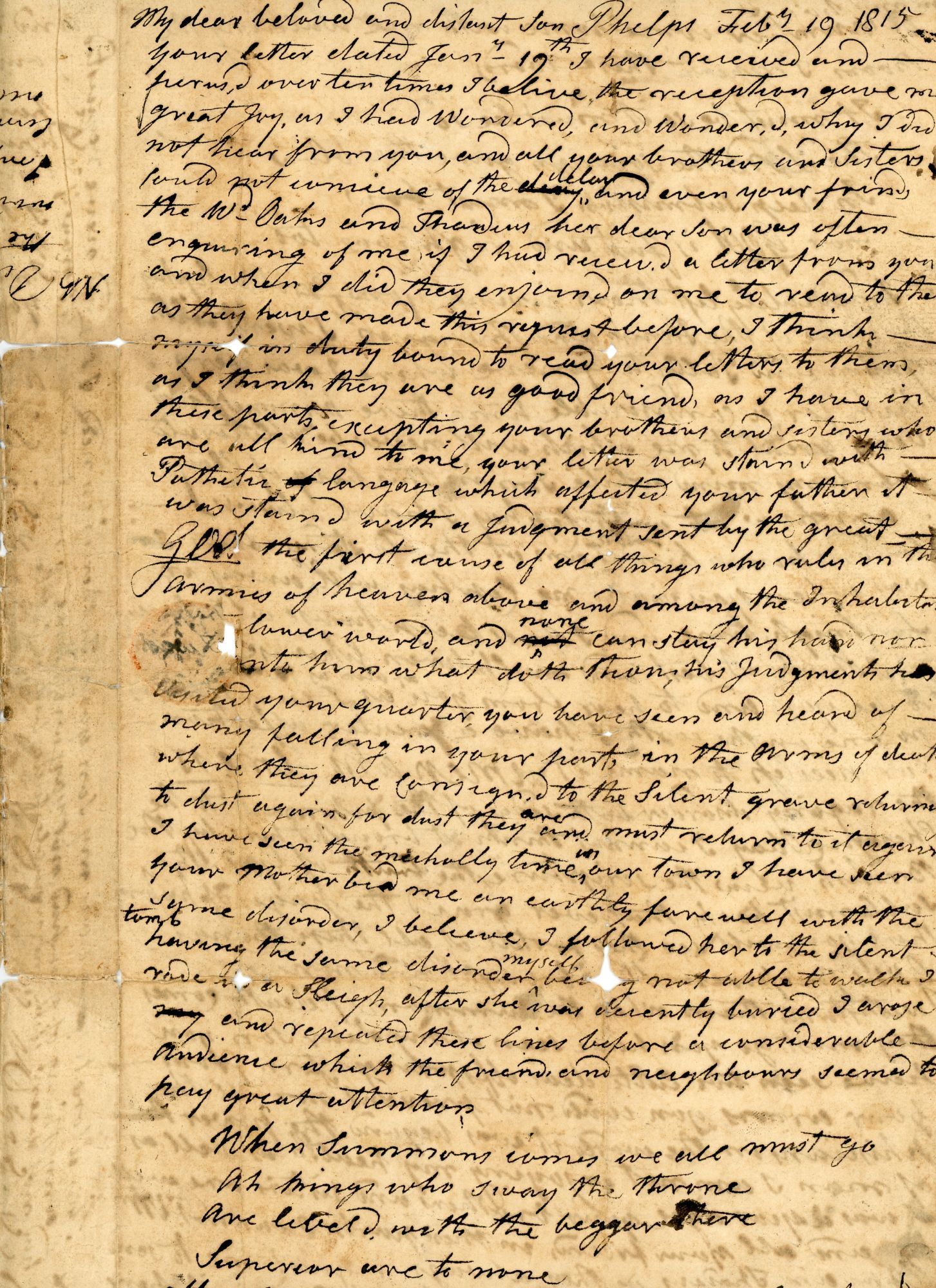 Phelps, New York, 1815. Good. Short tears, toning, dust soiling.. Addressed to "Captain Horace Field of the District of Columbia and State of Virginia" from his father, Oliver Field (1751-1820). The letter begins with a meditation on death, referencing his son's proximity to it in wartime: "You have seen and heard of many falling in your parts in the arms of death where they are consigned to the Silent grave returning to dust again ... I have seen your mother bid me an earthly farewell [as well]". He goes on to record comforting lines of verse for those who are in mourning. He discusses scripture, and reports of his own poor health, and dedicates the remainder of the letter addressing his grandson, thanking him for his letter and urging him to be a good boy. Bifolium measuring 12.5" by 7.5" Captain Horace Field (1775-1840) lived in Phelps, New York, before moving to Alexandria, Virginia in 1806 where he became engaged in the tobacco business. He commanded a company of militia during the War of 1812. He lost nearly all his property in war after it was burned by the British.