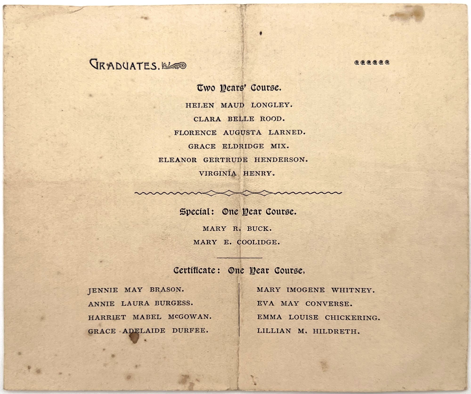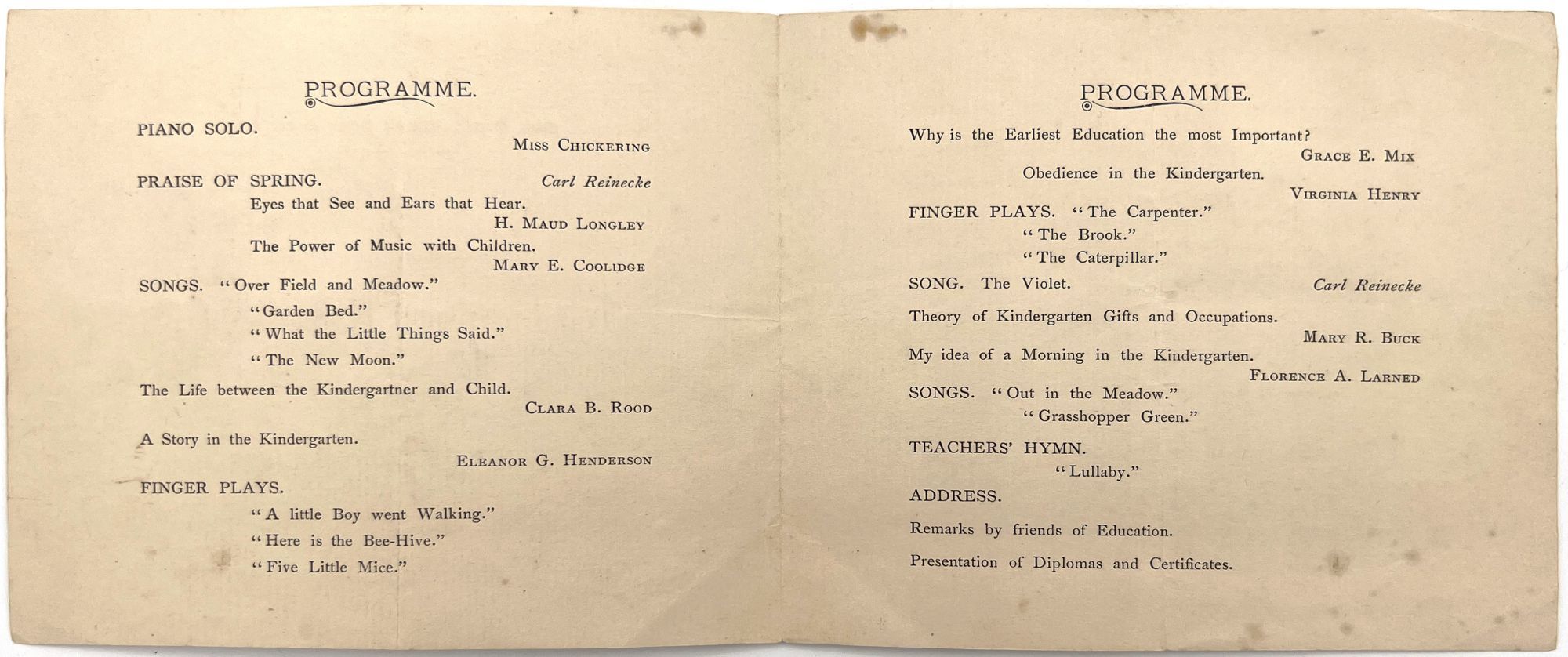 United States, 1895. Good to very good. Toning, spotting, letter folds.. Printed program for the 1895 graduating Exercises of the Kindergarten Normal Class. The program includes a charming array of children's songs. A list of the sixteen young students, all girls, graduating is included on the final page. Printed bifolium (5.25" by 6.5").