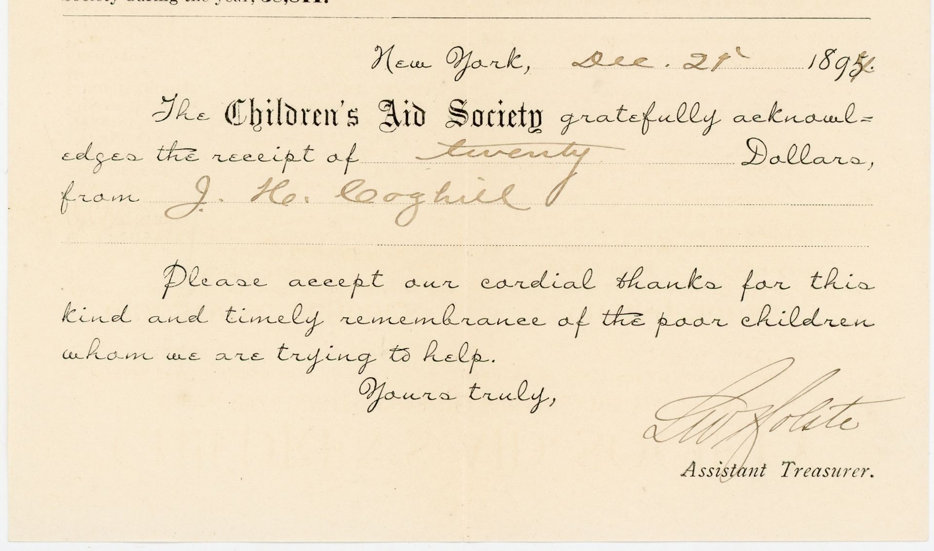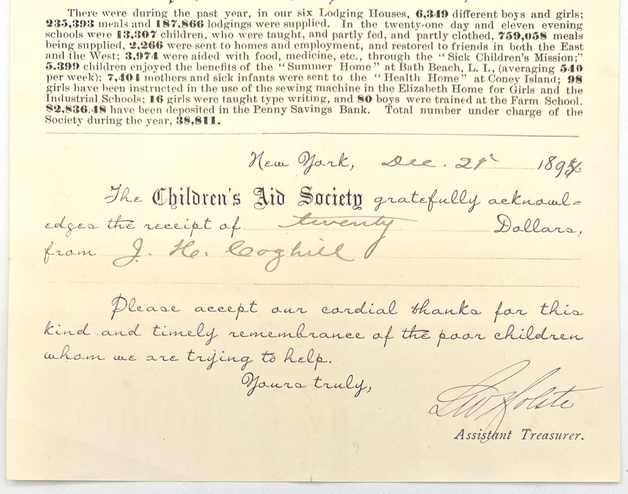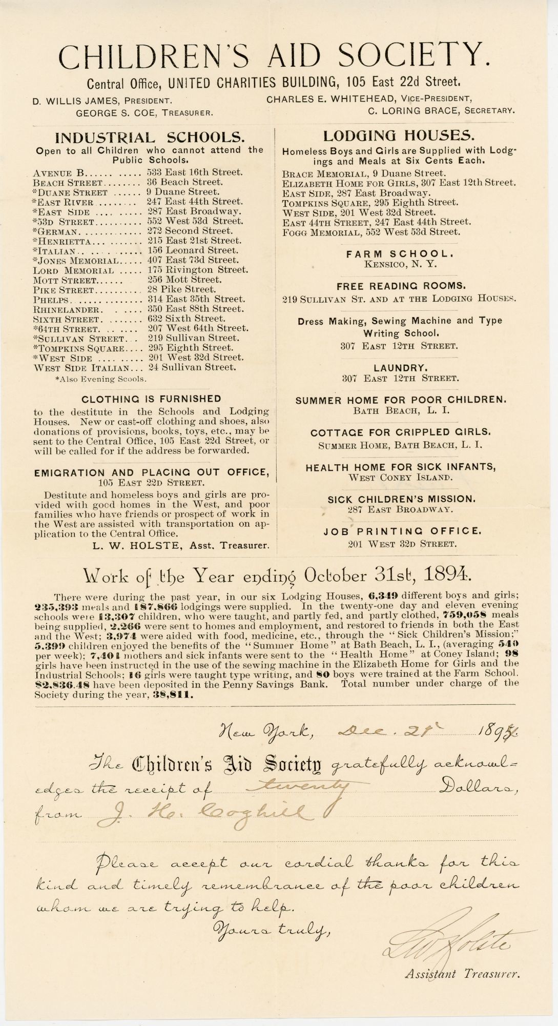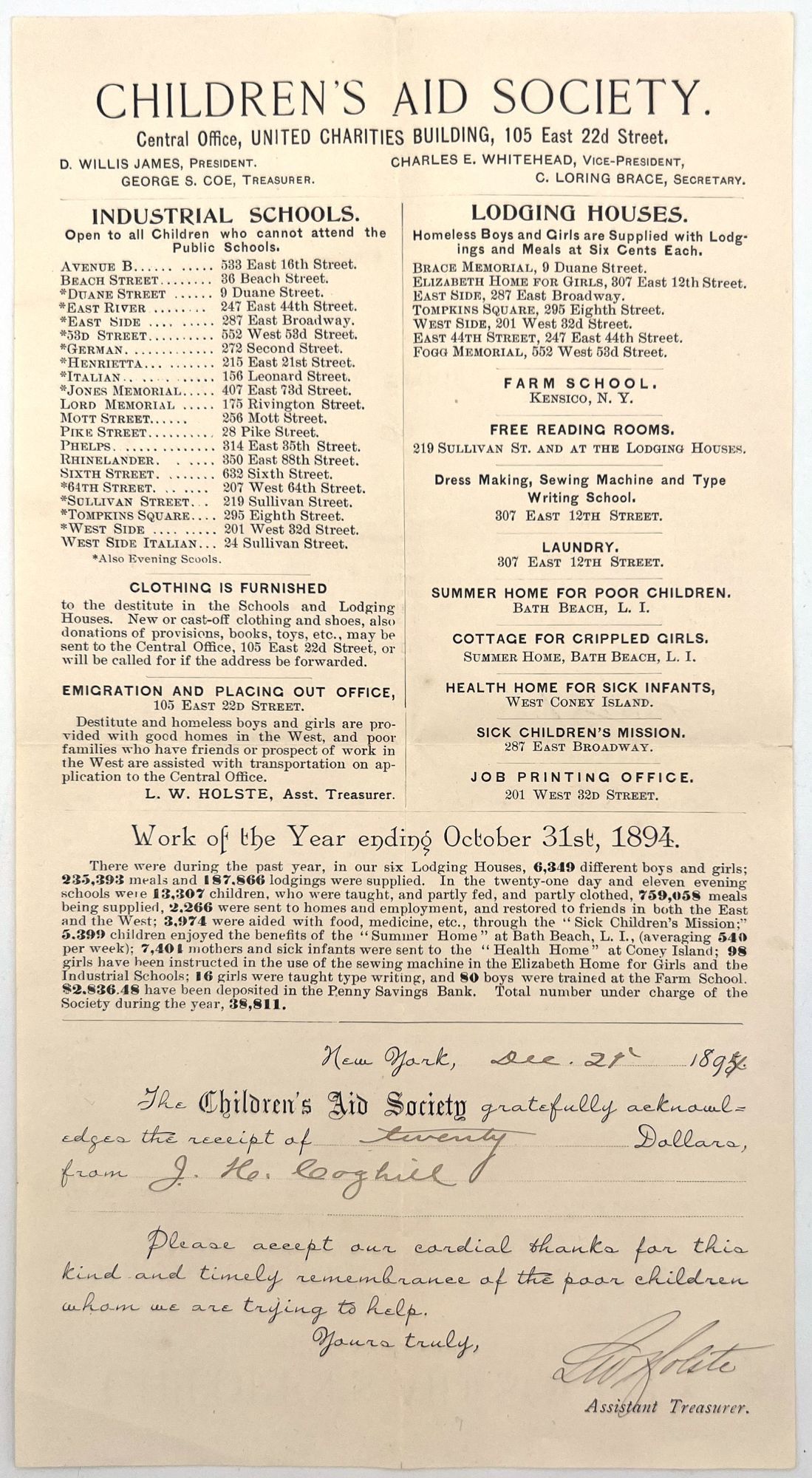 [New York, New York]: Children's Aid Society, 1894. Near-fine. Minor toning and letter folds.. Printed donation receipt and circular with valuable information about the Children's Aid Society in New York, including: a list of "Industrial Schools Open to all Children who cannot attend the Public Schools"; a list of Lodging Houses and other related work placements for children, including a farm school, laundry, job printing office, and "Cottage for Crippled Girls"; information about clothing and provisions furnished to the children; the address of the "emigration and Placing Out Office"; and a lengthy list of statistics, including such valuable figures as how many meals were served in the past year (235,393), how many girls were taught type writing (16), how many boys were trained at farm school (16), and the total number of children under charge of the Society in one form or another (38,811). The donation form below has been filled out in early ink manuscript, thanking J.H. Coghill for his donation of twenty dollars to the Children's Aid Society. Measures 11.5" by 6.25" The Children's Aid Society, established in 1857 and incorporated on 22 Sept. 1865, was the second children's aid society in the U.S. Like its predecessor, the New York Children's Aid Society, it emphasized placing dependent children in foster homes, but like the Cleveland Orphanages, it also sheltered them. It initially organized to support the Cleveland Industrial School. In 1876, when the city closed the Cleveland Industrial School, the Children's Aid Society modified its focus to house the children who formerly resided at the school, using the school's facility at 10427 Detroit Rd.