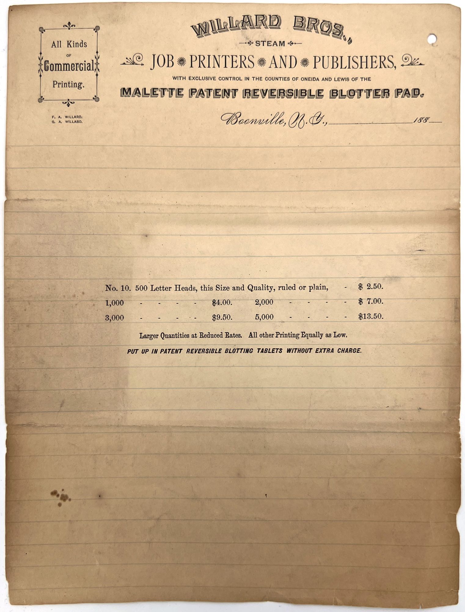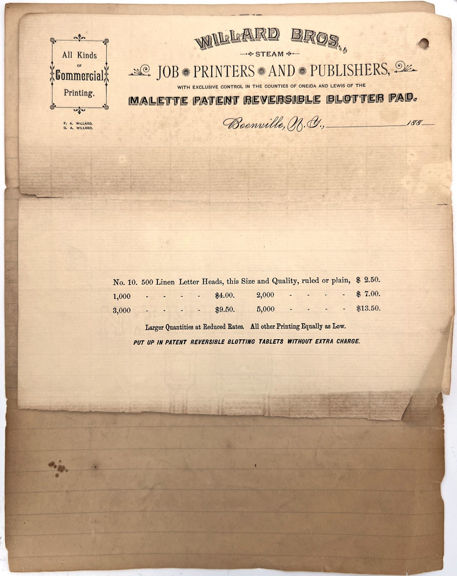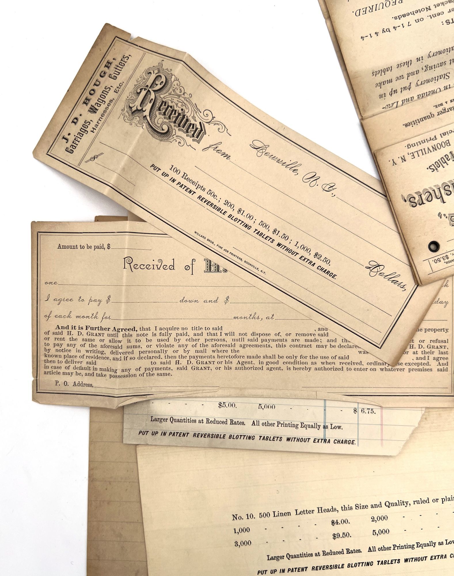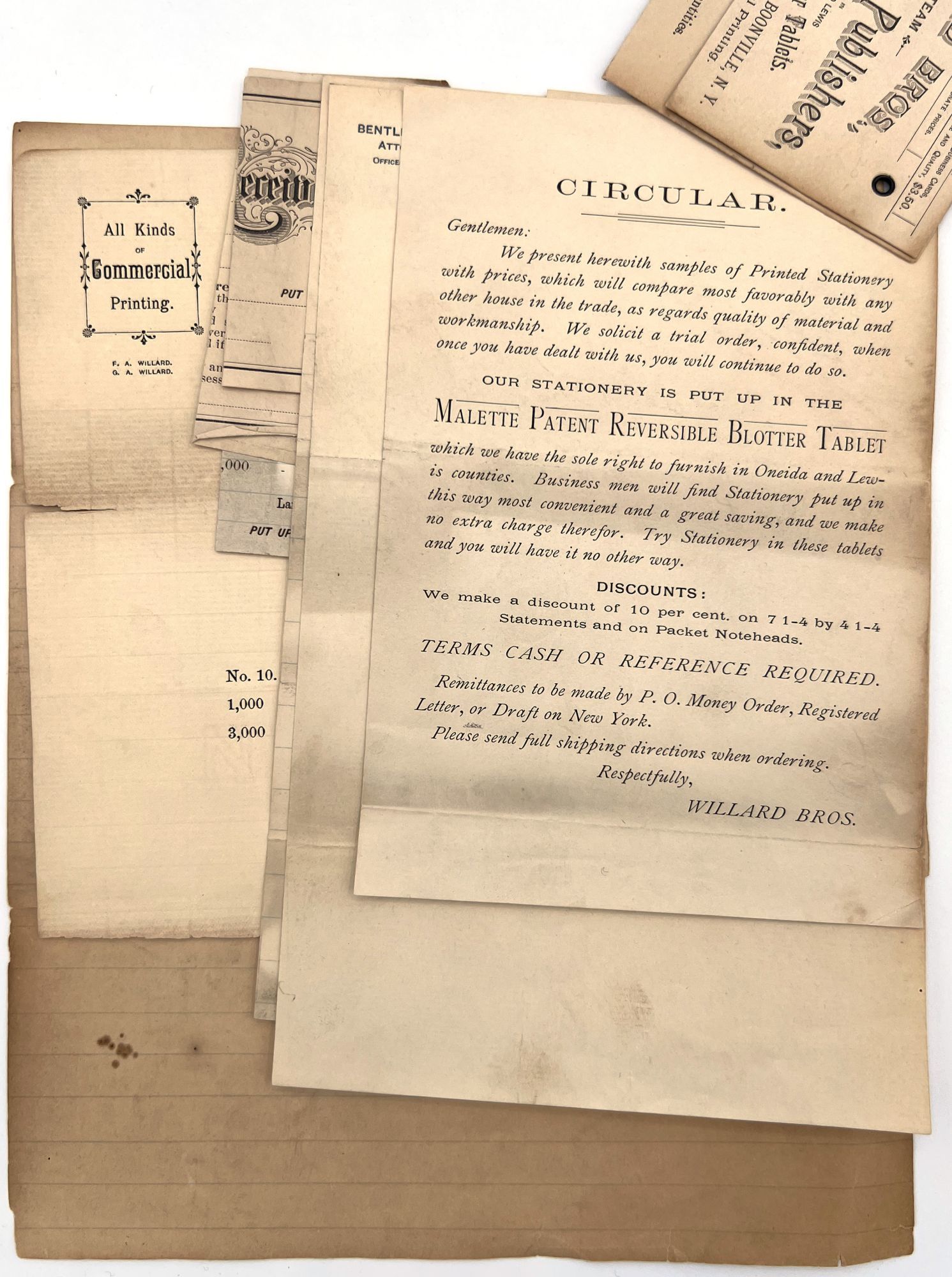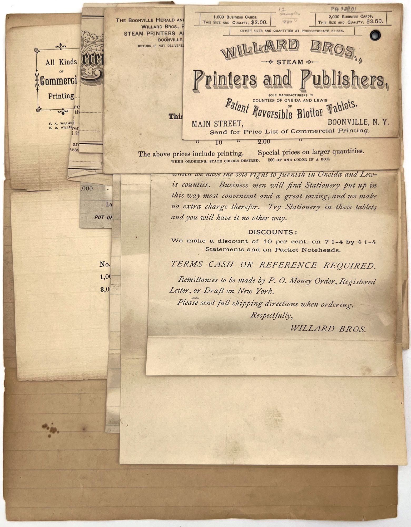 Boonville, New York: Willard Bros., Steam Printers and Publishers, 1870. Good. Toned with dust soiling, letter folds, minor short tears and chipping. Final two leaves have sometime come detached.. A salesman sample if twelve (12) samples of printing by the steam printers and publishers Willard Bros., bound in the right-hand corner with a metal grommet and used as a salesman's sample book. Provides a nice overview of the kinds of paper, printing, and products they provided; the different kinds of ephemera included are: envelope, circular, letterhead, billhead, receipt. A business card is placed on top of the grouping. Grouped together with a grommet in the upper right corner. Together the group measures approx. 10.5" by 8.5"; the smallest item measures 2.75" by 4.25