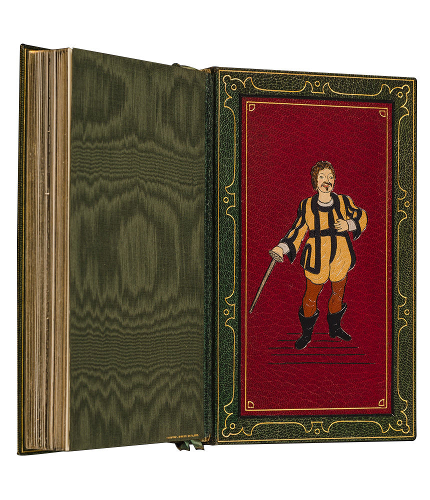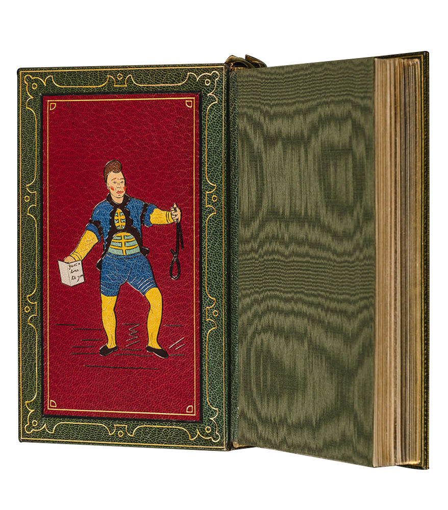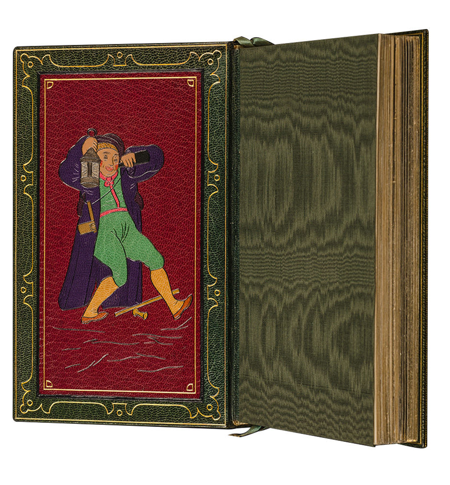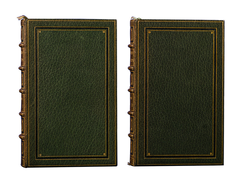 London: Richard Bentley, 1838. First edition. First issue, with no border around final plate and correct page listing in list of "Embellishments." Two octavo volumes (7 1/2 x 4 5/8 inches; 191 x 117 mm.). [i]-xix, [xx, blank], 288 pp; [i-ix, [x, blank], 263, [264, printers imprint]. Engraved frontispiece portrait in volume I, and twelve engraved plates by George Cruikshank. The frontispiece to each volume hand-colored (volume I. "Joseph Grimaldi" & Volume II. "Grimaldi's kindness to the Giant"). Extra illustrated by the insertion of forty-eight engraved plates, eighteen of which are hand colored. Six of the hand colored plates are by F.W. Pailthorpe; six by Isaac Cruikshank? and two by George Cruikshank--all three of these artists are famous Dickens illustrators. Bound ca. 1920 by Bayntun, stamp-signed in gilt "Bayntun. Binder. Bath. Eng." on rear silk endleaves. Bound in full forest green crushed levant morocco, covers triple-ruled in gilt surrounding a thin inlaid border of black morocco. Spines with five raised bands, decoratively bordered in black and gilt in compartments, gilt lettering, gilt board edges and decorative gilt turn-ins. Front and back doublures of each volume with a superb figure and background inlaid in various colored morocco's. The four inlaid designs include "Gaby Grin, The Eccentric Clown," and three other characters from the book. Green watered silk endleaves, all edges gilt. Spines very slightly darkened otherwise very fine. Housed in the original, fleece-lined, green cloth slipcase. A spectacular example of a pair of early Bayntun bindings, typical of the firm's first-rate work and use of the best materials.