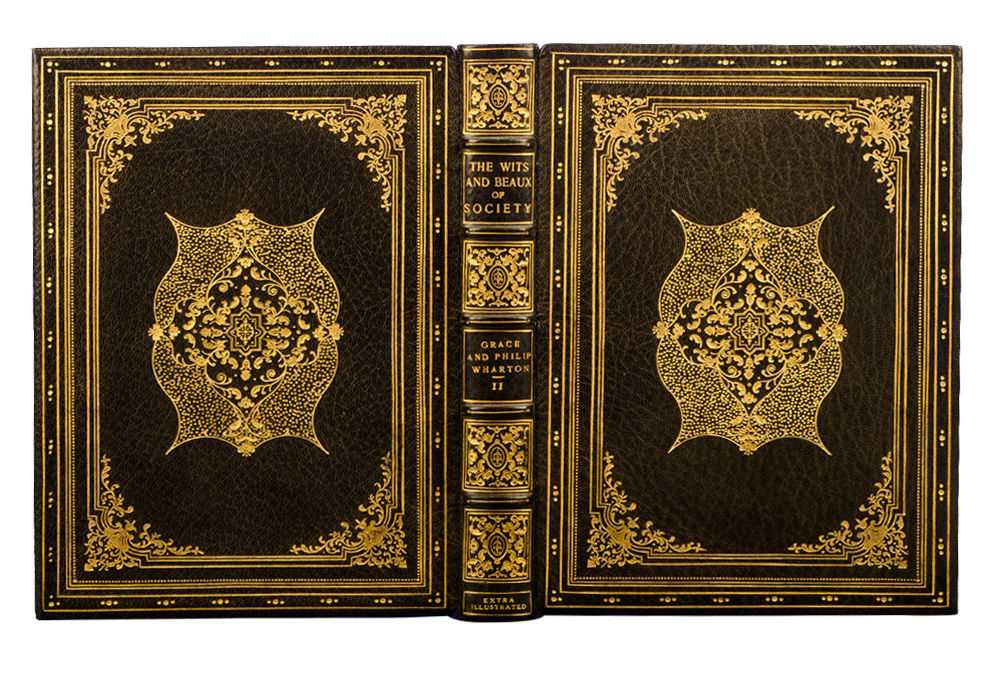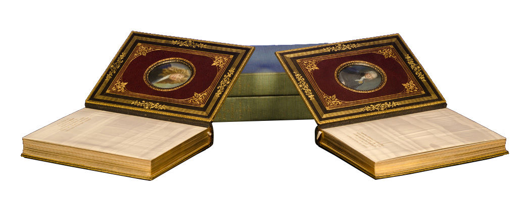 London: J.W. Jarvis & Son, 1890. New Edition. Fine. A very fine pair of Cosway-Style bindings, two large octavo volumes (9 9/16 x 7 3/16 inches; 243 x 182 mm.). xxxii, 262, (2, blank); vi, 246 pp, with two frontispieces and 14 plates by H.K. Browne and James Godwin. Extra-illustrated by the insertion of sixty-eight fine engraved portraits including one hand-colored. Bound ca. 1920 in full black crushed levant morocco, richly gilt, spines with five raised bands, decoratively tooled and lettered in gilt in compartments, gilt board edges, wide decoratively gilt tooled-turn-ins, gilt decorated maroon morocco doublures, all edges gilt, watered silk end-leaves. The first volume with an oval portrait miniature (3 1/8 x 2 1/2 inches) under glass, of William Wycherley after a painting by Sir Peter Lely. The second volume with an oval portrait miniature (3 1/8 x 2 1/2 inches) under glass, of Talleyrand after a painting by Gerard. Each volume chemised in a light green cloth slipcase, lettered in gilt on spine.