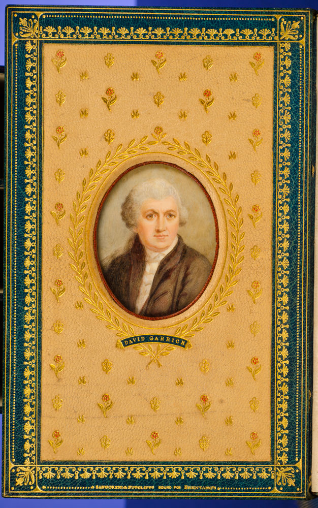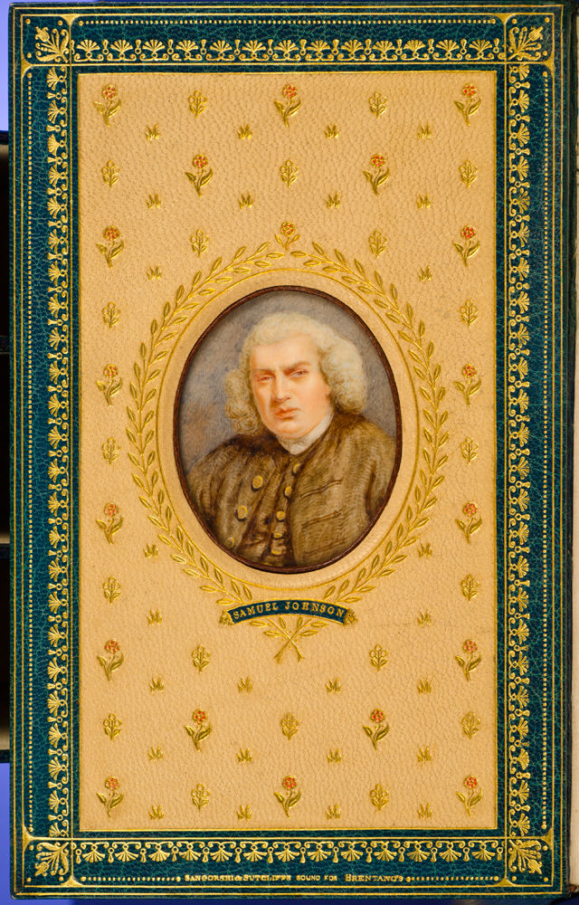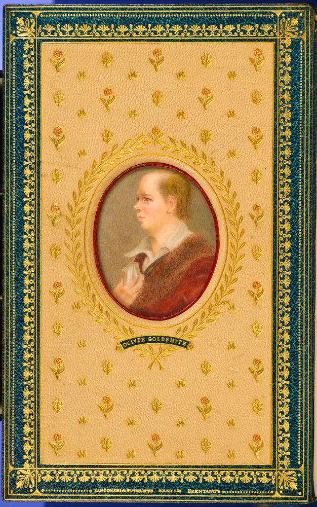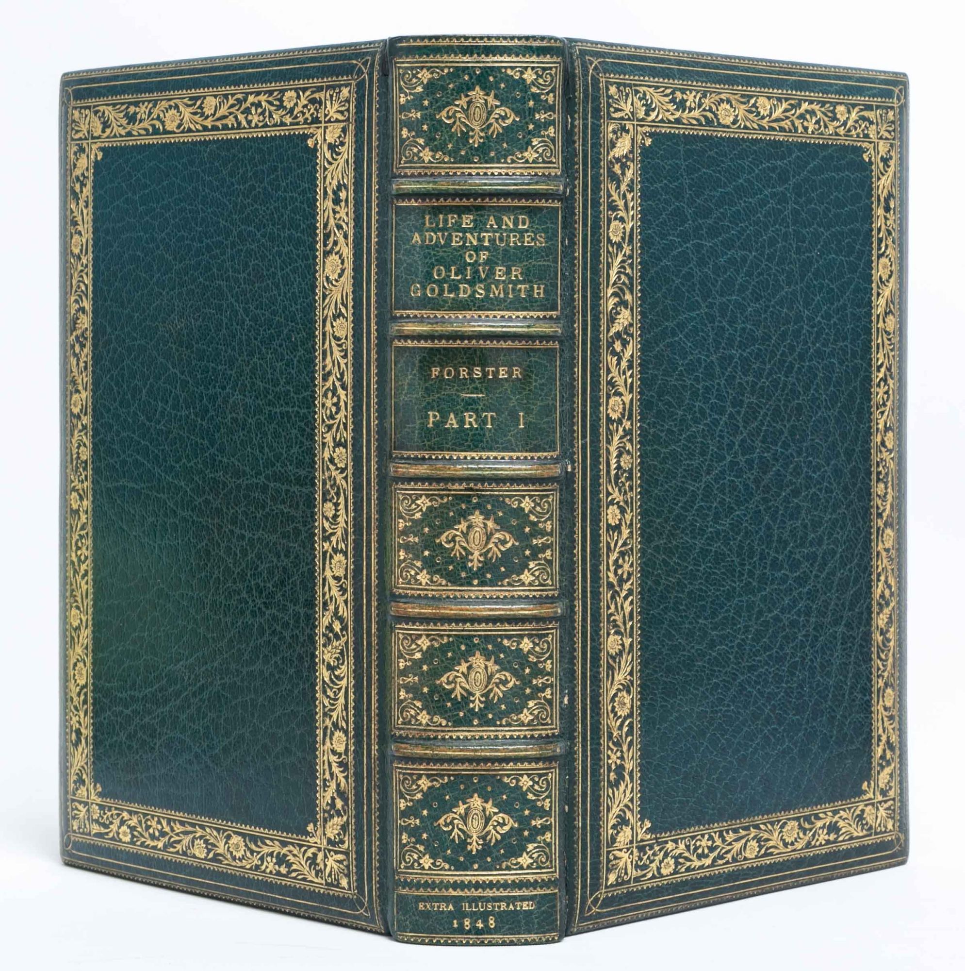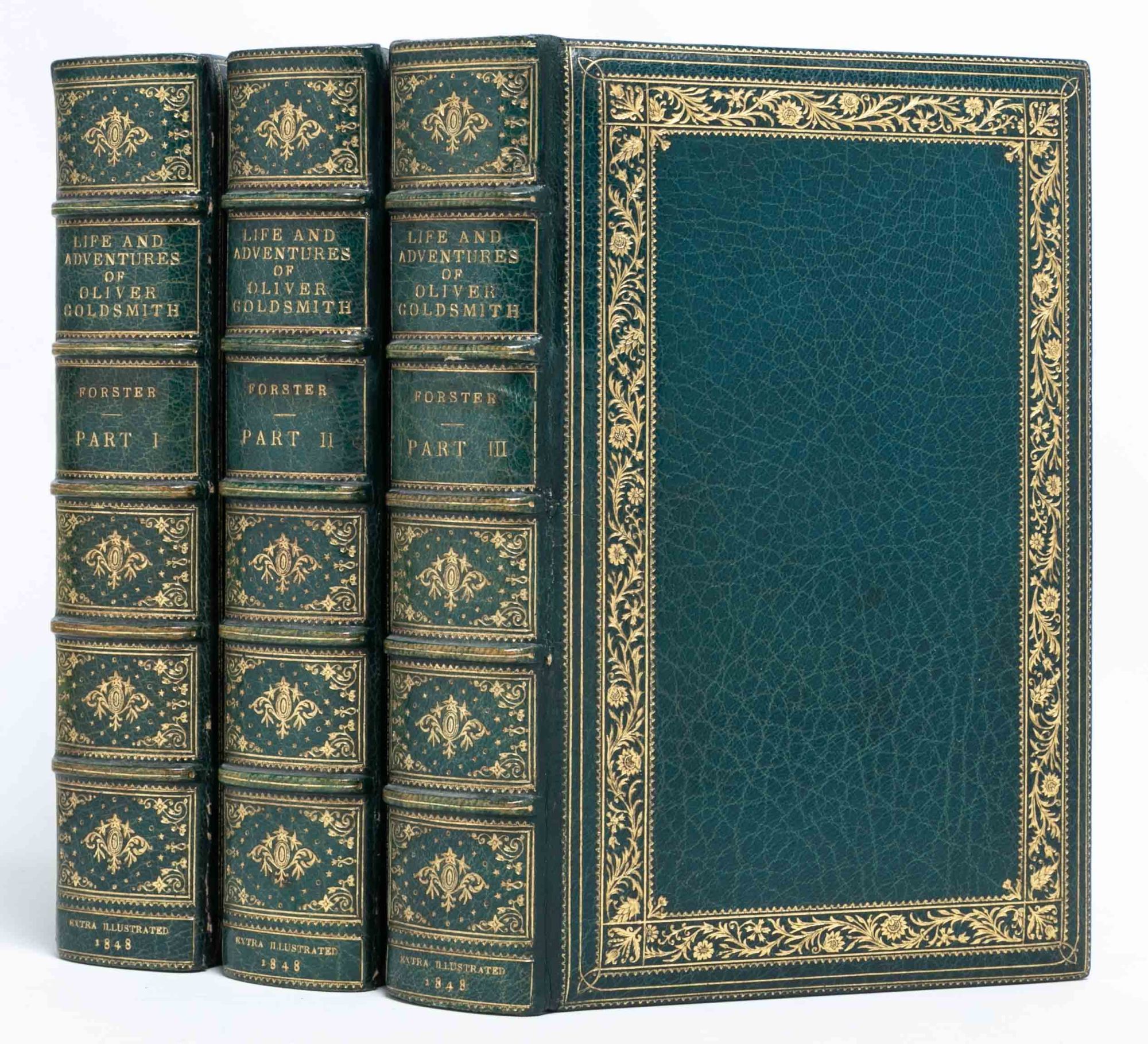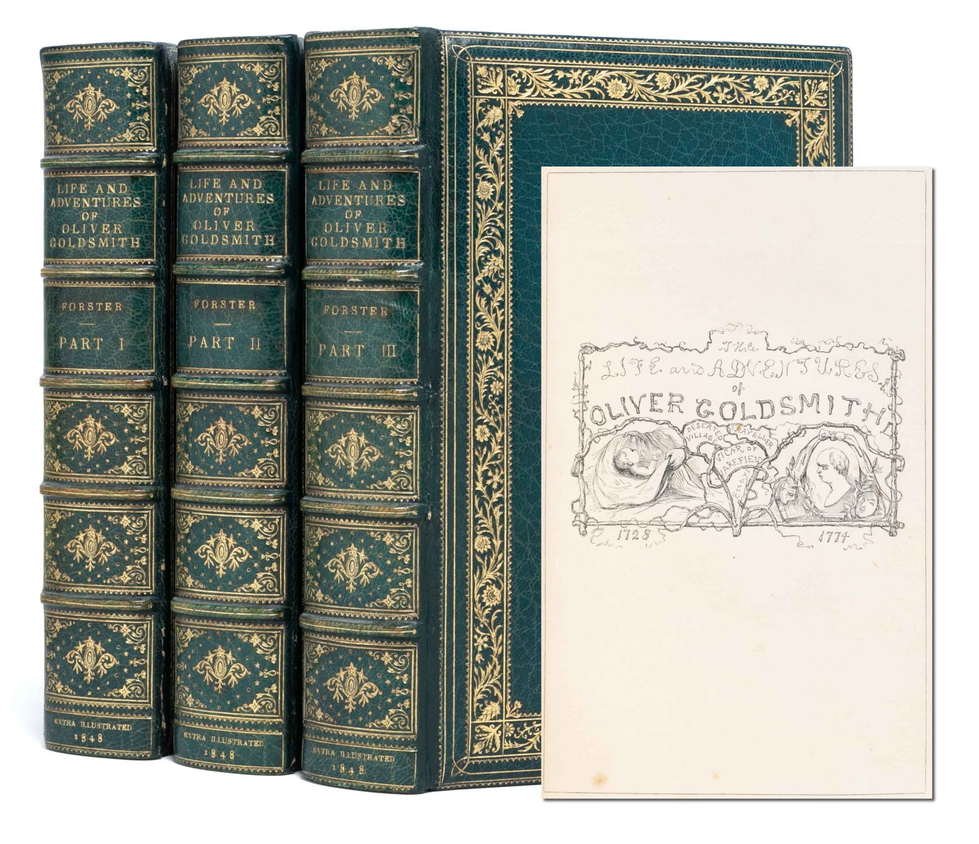London: Bradbury and Evans/Chapman & Hall, 1848. First edition. Near Fine. Three octavo volumes (8 x 4 7/8 in; 204 x 123 mm.) collating: xvii, [4], 232; 233-448; [2], 451-704 pp. A fine set with etched half-title, three additional title-pages printed in red and black, and fifty black and white text illustrations as issued, with over seventy-five extra engraved portraits and views. Bound c. 1930 by Sangorski and Sutcliffe for Brentano's (stamp-signed) in full crushed teal blue morocco over beveled boards with elaborate gilt-rolled borders and gilt-tooled frame. Spines with five raised bands elaborately decorated and lettered in gilt in compartments. Gilt-ruled board edges, broad, gilt-rolled dentelles. Gilt-tooled beige morocco doublures featuring three watercolor portraits in sunken panels bordered with red morocco under glass of Oliver Goldsmith, Samuel Johnson, and David Garrick respectively, with gilt laurels. White moiré silk flyleaves. Beveled edges. All edges gilt. Some expert repairs to the outer joints of each volume. With the bookplate of Samuel Wieder. Housed in the original felt-lined, marbled paper-covered slipcase with blue morocco edges.