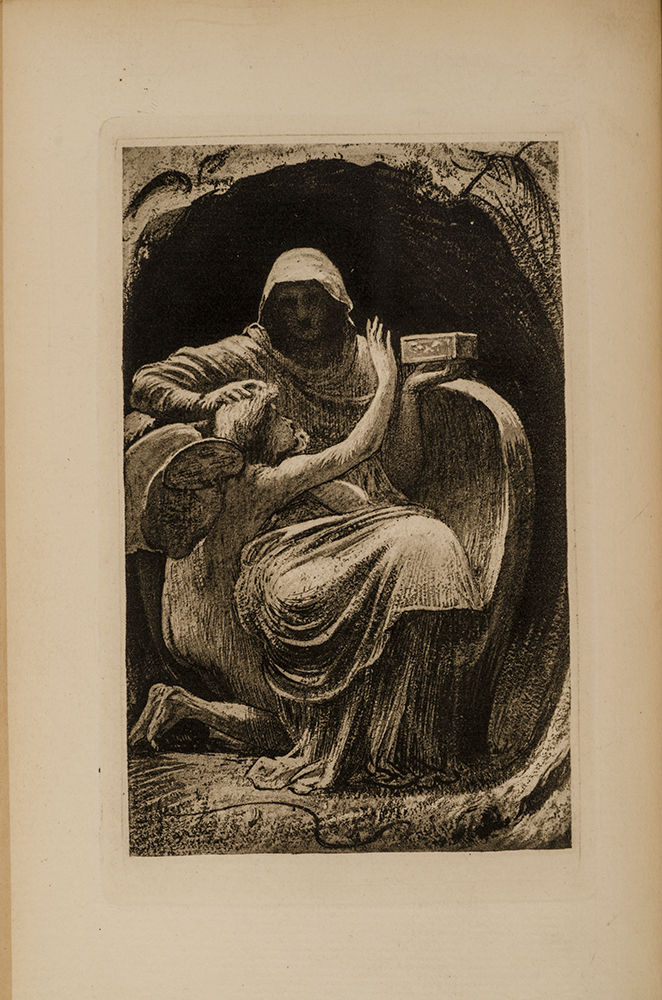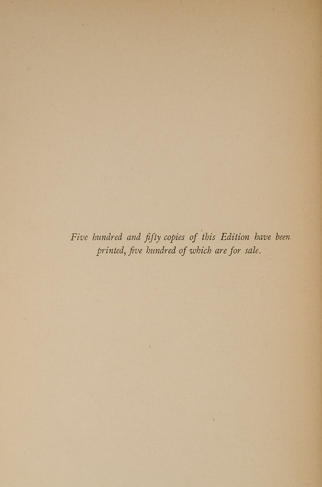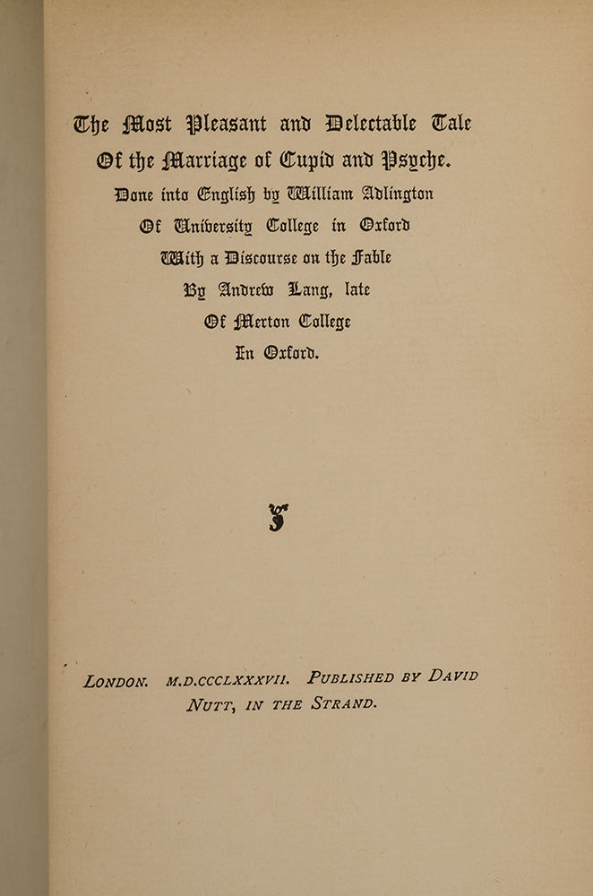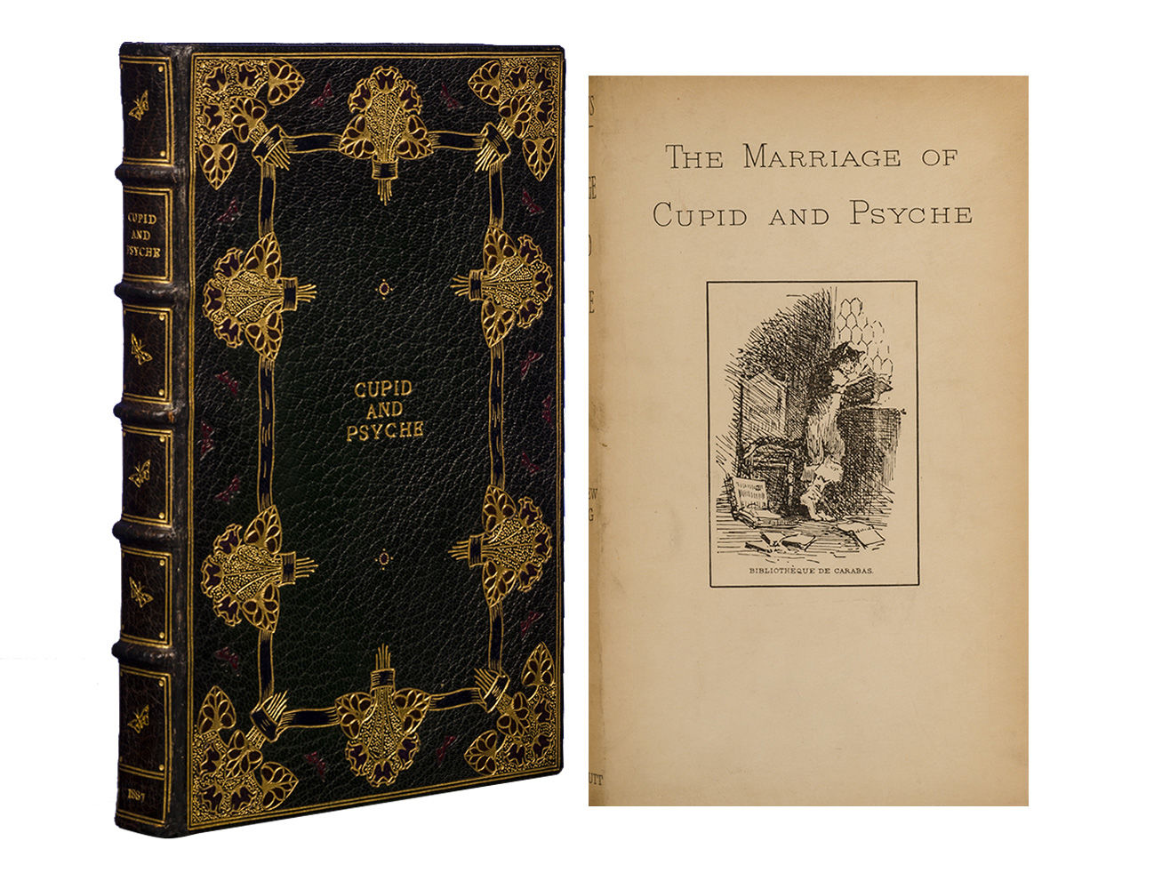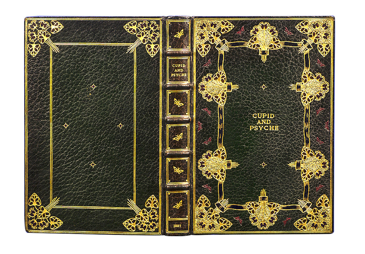 London: David Nutt, 1887. Limited edition. Fine. Limited to five hundred and fifty copies. Octavo (7 5/8 x 5 inches; 193 x 125 mm.).[ii], [lxxxvi], [1,], [1, blank], 65, [1, blank]. With a Pre-Raphaelite engraved frontispiece, a wonderful etched engraving of Venus and the Sea-Gull by Scottish Artist Vereker Monteith Hamilton (1856-1931), and a small engraved vignette on the last leaf. Original front wrapper bound in at end. Bound ca. 1910 by Alfred De Sauty (stamp-signed "De Sauty" in gilt on front turn-in) in an Arts and Crafts style binding of full dark green morocco. Front cover with double gilt ruled border surrounding ten floral clusters with maroon morocco inlaid bouquets and fine pointillé, all joined together by a decorative gilt bordered inlaid dark blue morocco gilt decorated branch. In addition there are fourteen inlaid red morocco butterflies and two small gilt decorated inlaid red morocco circles. The center of the front cover is lettered in gilt "Cupid and Psyche". Rear cover with double gilt ruled border surrounding four similar 'corner-piece' floral clusters with maroon morocco inlaid bouquets. There is a central rectangular panel surrounded by a double gilt border enclosing four small gilt decorated inlaid red morocco circles. Spine with five raised bands, decoratively paneled and lettered in gilt in compartments with five decorative gilt butterflies, gilt ruled board-edges, triple gilt ruled turn-ins, top edge gilt, others uncut. Spine ends expertly and almost invisibly repaired. A superb and understated example of the genius of Alfred De Sauty.