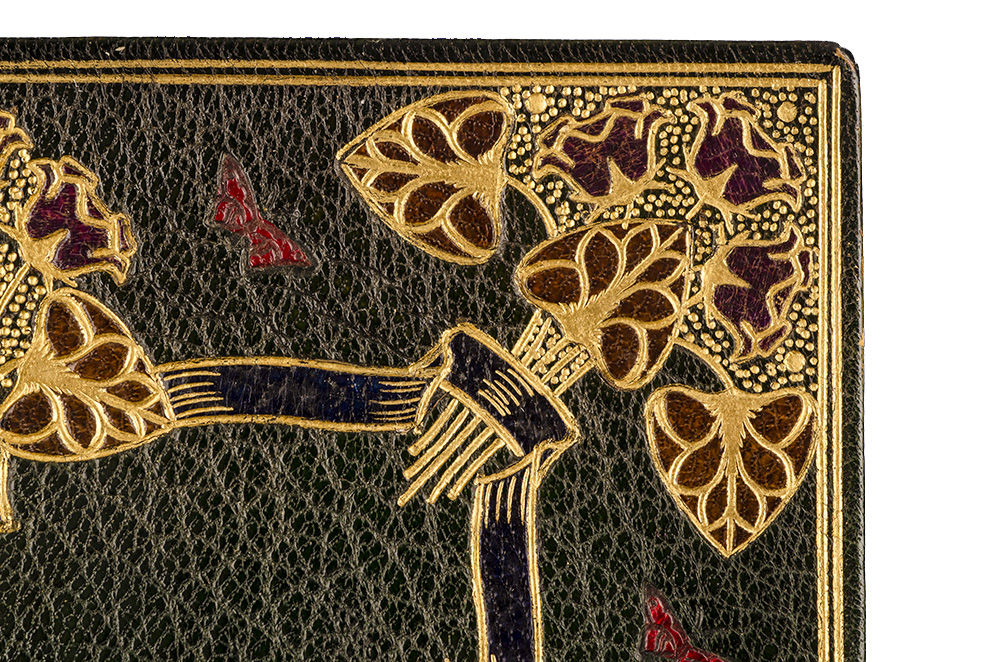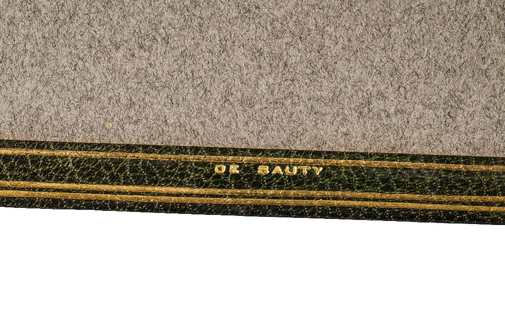 The work of bookbinder Alfred de Sauty (1870-1949) is appreciated for its delicate tooling. Although little is known about his life he worked in both London (1898 to 1923) and Chicago (1923 to 1935). “For instance, scholars are unsure whether, when in London, de Sauty worked independently, for the firm of Riviere & Sons, or both. While in London, he may also have been a designer for the Hampstead Bindery and a teacher at the Central School of Arts and Crafts” (Harvard) as works he bound during this period are signed "de S" or "De Sauty." De Sauty’s career in Chicago working for the hand bindery of R. R. Donnelley & Sons is better documented; bindings made here use the name R. R. Donnelly. “He signed his work at the foot of the front doublure, if present, and at the center of the bottom turn-in of the front upper board, if not” (Harvard). Fine.