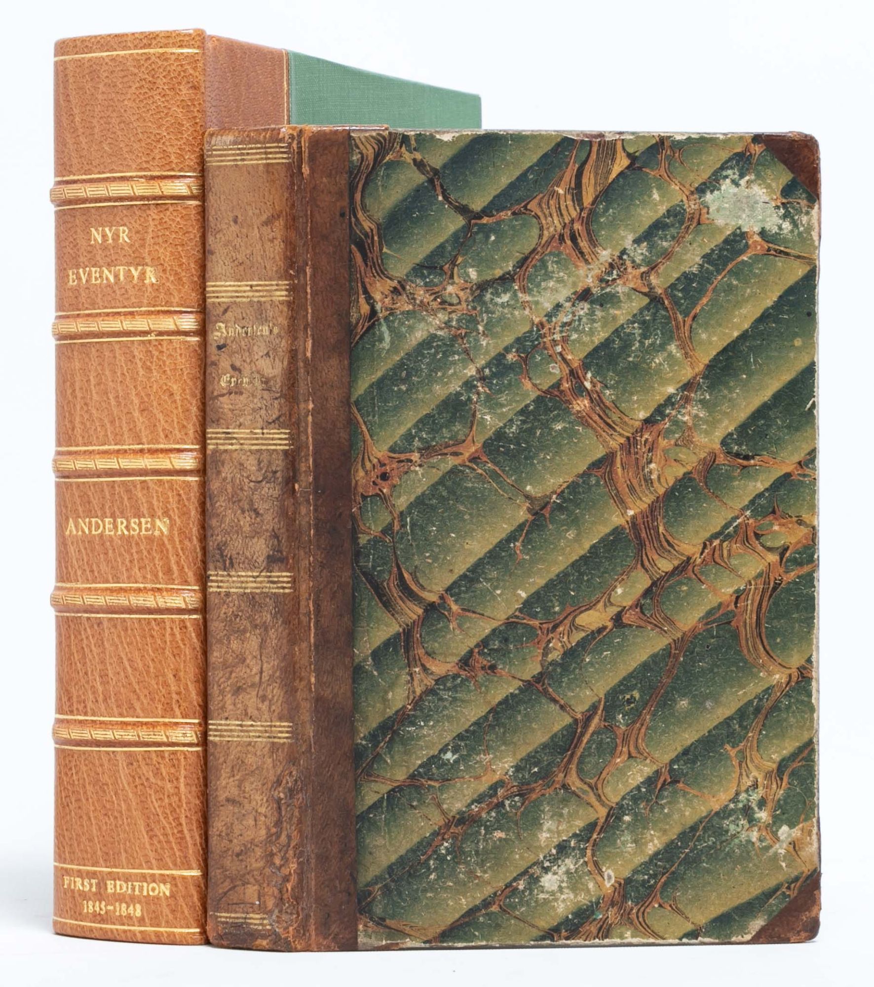 Kjøbenhavn: C.A. Reitzel, 1845. First editions. First edition, complete, two volumes (collections) bound together, of Anderson's second series of fairy tales, the first issue of Collection Two, the second issue of Collection One. Small octavo (6 1/4 x 4 in; 157 x 103 mm). Collection One: 47, [1, blank]; 68; 52 pp. Collection Two: 72; 60 pp. Two leaves, comprised of table of contents and dedication page to Collection Two, have been misbound out of sequence. Otherwise, complete with half titles for each volume, both shared title pages, both shared contents leaves, all dedication leaves, all half titles for each fairy tale, and all five regular title pages. Contemporary quarter calf over marbled boards, and marbled edges. Some light scattered foxing and toning, and an occasional inkspot. Otherwise a very nice copy. Housed in a quarter morocco clamshell case.