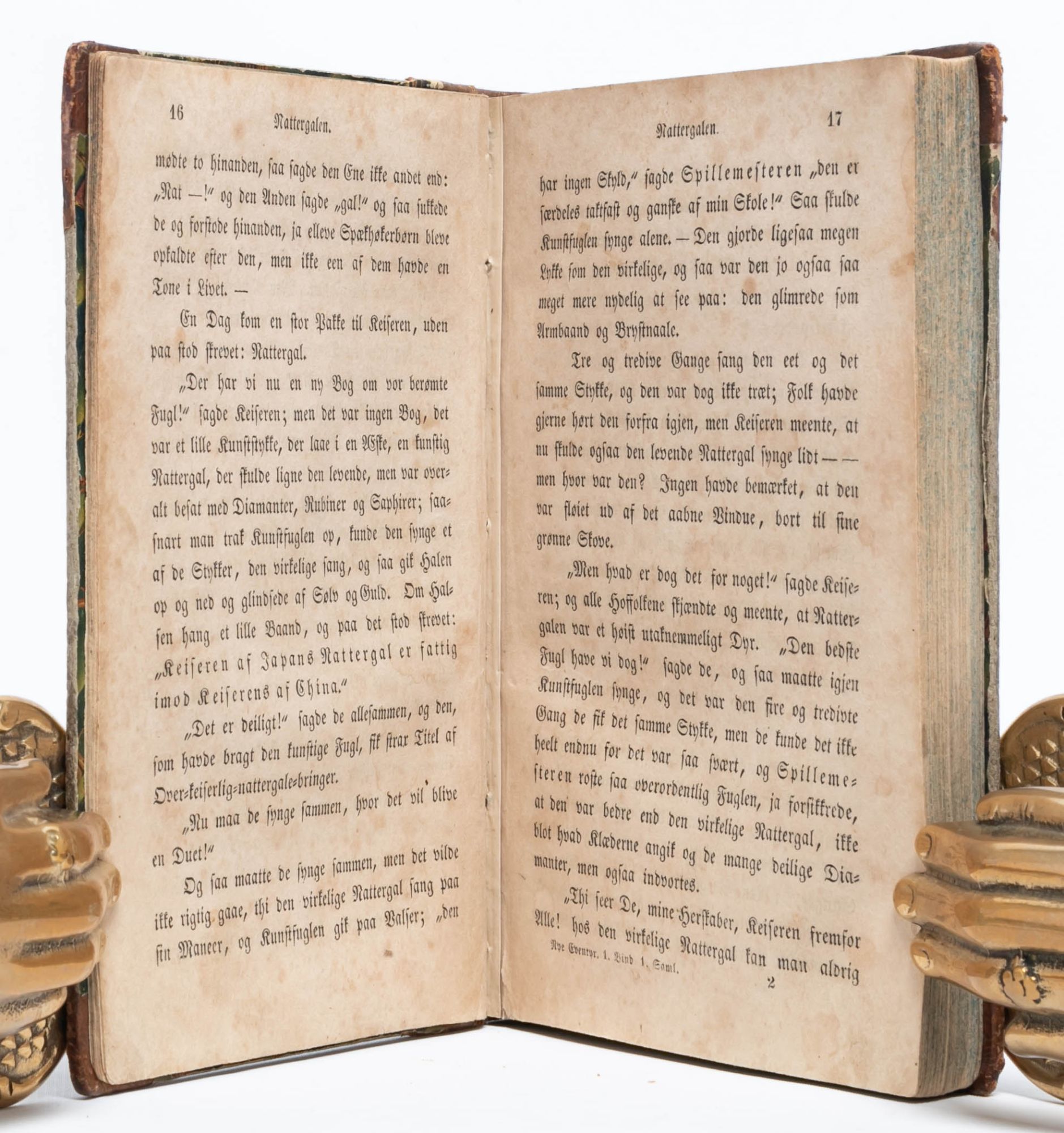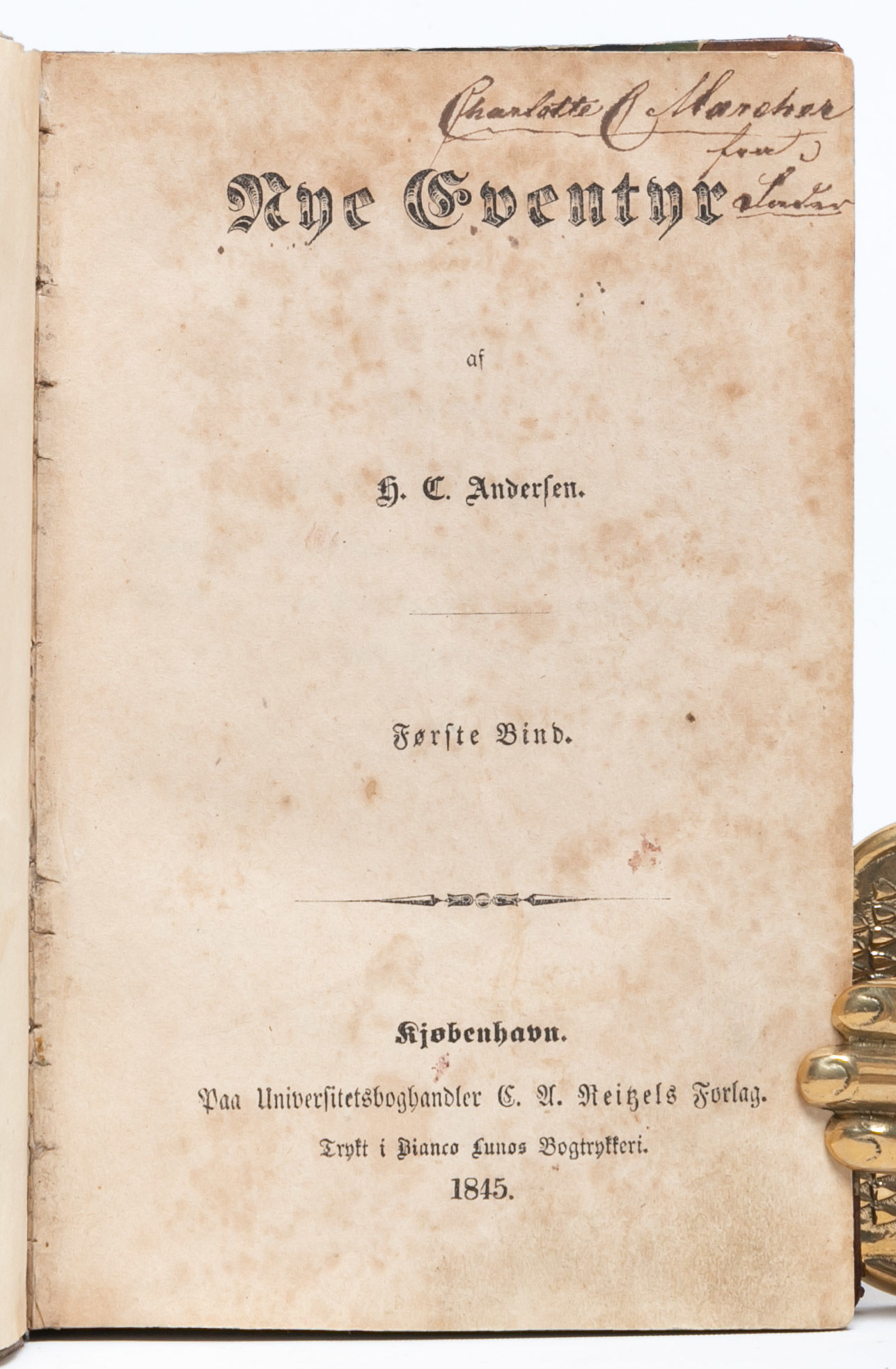 Nye Eventyr (trans. New Fairy Tales), Andersen’s second collection of stories, contains some of his most significant original texts including "The Nightingale," "The Ugly Duckling," "The Snow Queen," "The Red Shoes," and "The Little Match Girl." Unlike Charles Perrault and the Brothers Grimm, who were primarily compilers, here Andersen “moved away from traditional folk material towards creating tales that came from his imagination. The words ‘told for children’ were omitted from the new title as Andersen sought to engage adults and children alike. He had found a genre in which he had a unique voice” (British Library Online Gallery). These brilliant and imaginative stories have become the cornerstones of Western children's literature, and the characters eternal psychological archetypes. Originally issued in parts; very few have survived in that state. The publisher, Reitzel, collected the individual parts in their original printings, added tables of contents, and published them in anthologies.