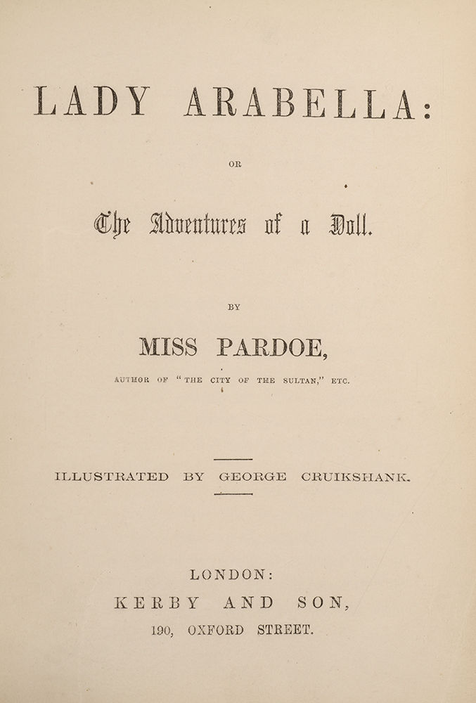 "Julia Pardoe (1806-1862), was an English poet, novelist, historian and traveler. She was born at Beverley, Yorkshire, and showed an early interest in literature. She became a prolific and versatile writer, producing in addition to her lively and well-written novels many books on travel, and others dealing with historical subjects. She was a keen observer, and her travel to the East gave her an accurate and deep knowledge of the peoples and manners of the East. To modern readers she is probably best known for her books on her travels in Turkey, which are some of the earliest works by a woman on this area. In 1836 she traveled to Constantinople with her father, Major Thomas Pardoe. This voyage inspired her book The City of the Sultan (1836). Later she collaborated with the artist William Henry Bartlett to produce The Beauties of the Bosphorus (1839), an illustrated account of Constantinople" (A Short Biographical Dictionary of English Literature). Lady Arabella; or The Adventures of a Doll would appear to have been her only children's book.
