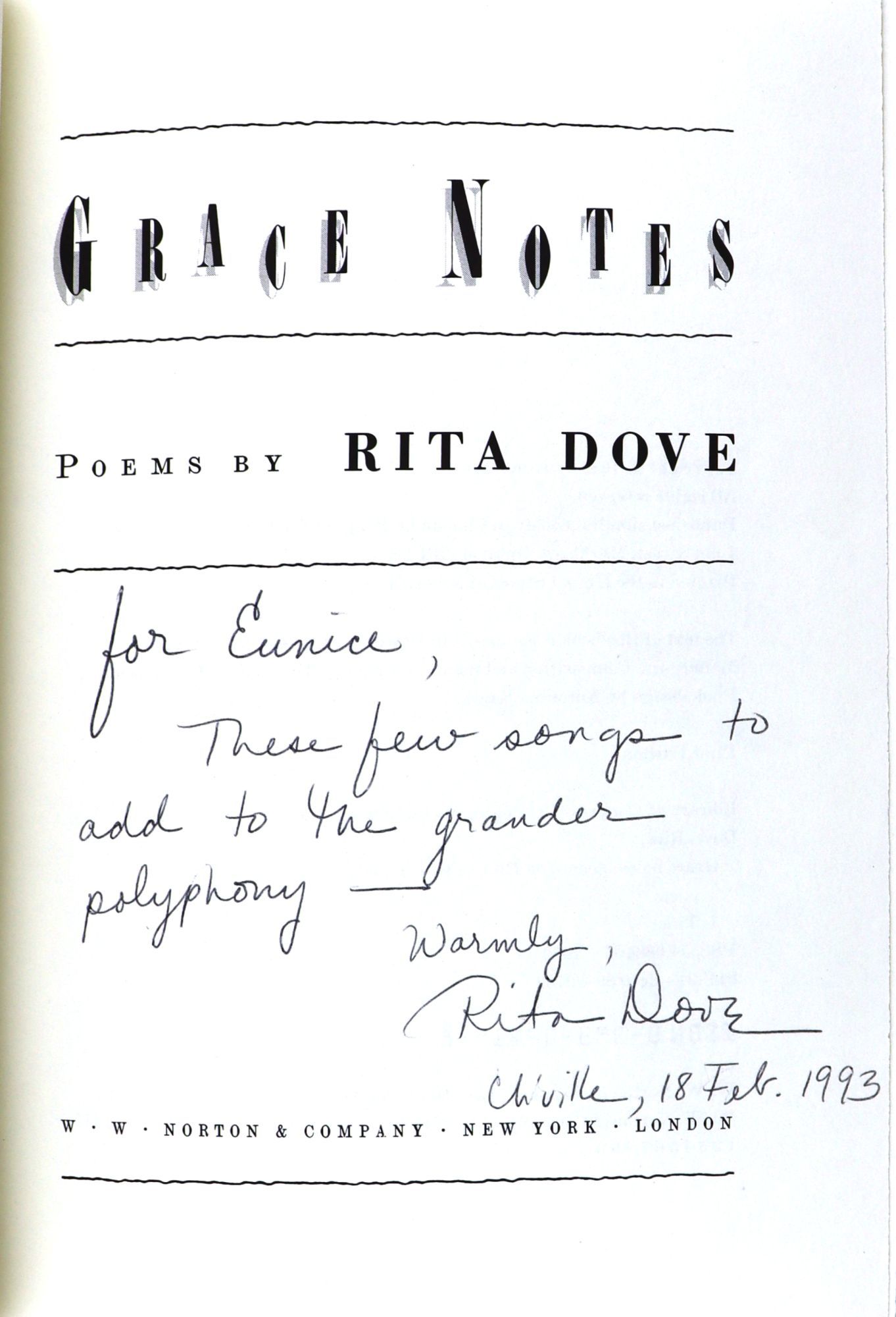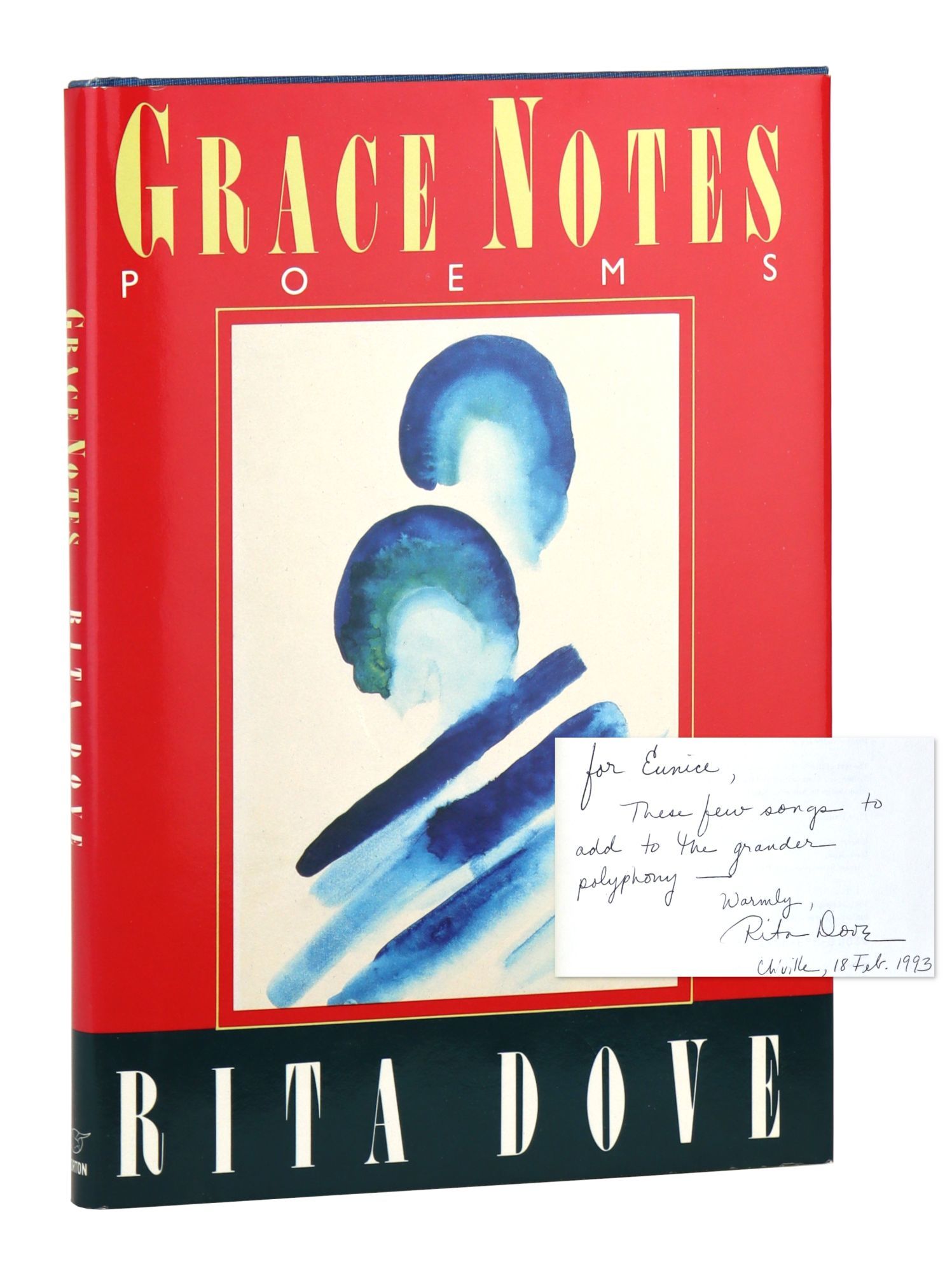 New York: W.W. Norton & Company, 1989. Very Good +/Very Good +. New York: W.W. Norton & Company, 1989. First Edition. Signed by Rita Dove at title page with inscription, "for Eunice, These few songs to add to the grander polyphony -- warmly, Rita Dove." Octavo. 73 pp. Illustrated dust jacket. Blue boards stamped in gilt and silver. Unclipped dust jacket gently rubbed along edges. Boards show mild shelfwear at extremities; dark blue stain to front joint. Binding sound and interior unmarked. A Very Good or better copy of Dove's fourth book of poems.