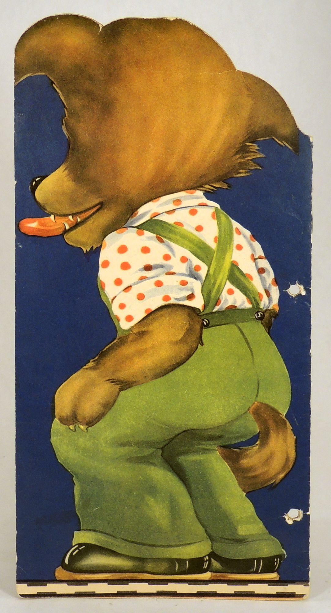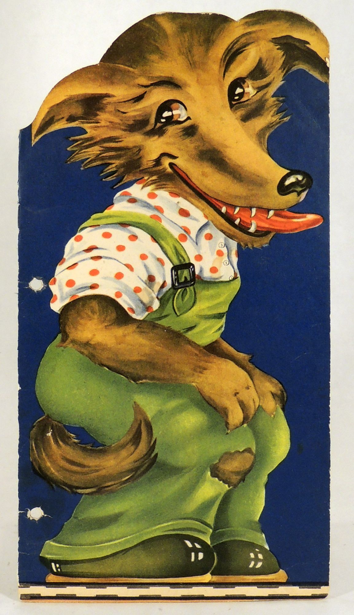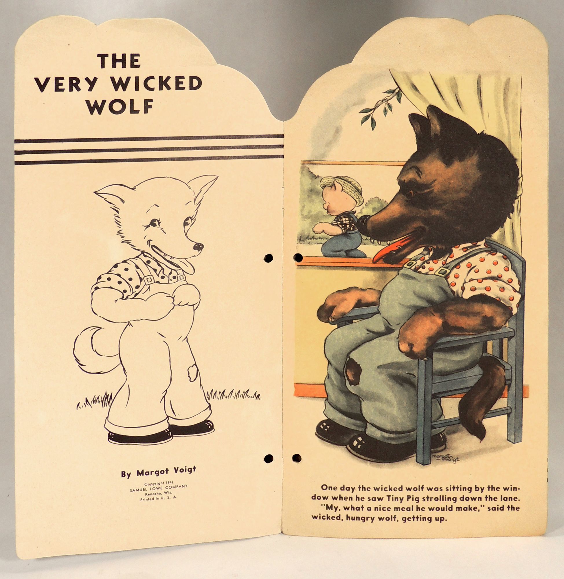Kenosha, WI: Samuel Lowe Company, 1941. Paperback. Very Good. Paperback. An uncommon shape book. The tale of the three little pigs, but from the perspective of the wolf. After failing to blow down the brick house of the third pig, he goes down the chimney and lands in a boiling pot of water. He vows to never again be mean to pigs and begins reading a book titled "How To Be A Good Wolf." Margot Voight wrote several children's books, typically versions of popular tales, and is perhaps best remembered for her tale about kittens: "Fluffy, Puffy, and Muffy." Full color stiff paper wrappers with four full color interior illustrations. Side-stapled and hole punched with two holes as issued. Wear along the holes and spine crease. Light crease marks to covers, but unusually clean and bright. Unpaginated. [12 pages.] Size: 1.5 x 5.5 inches. CHILD/062524.