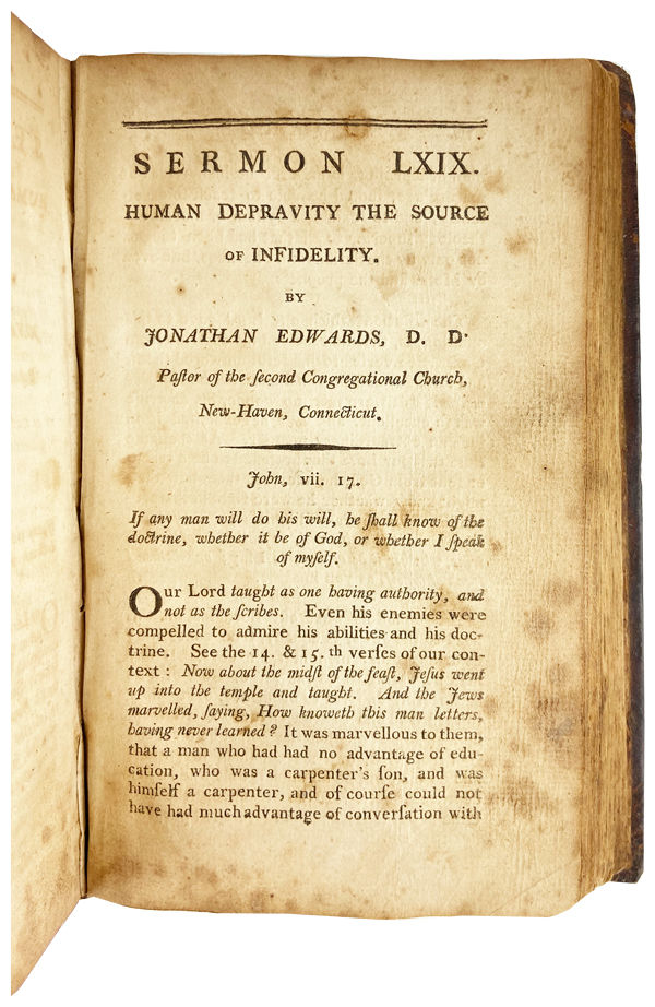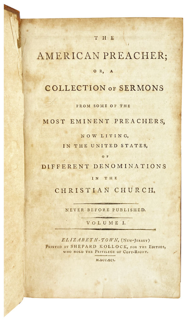 Elizabeth-Town, New Jersey / New Haven, CT: Printed by Shepard Kollock / Abel Morse, for the Editors, who Hold the Privilige of Copy-Right, 1793. Very Good. Elizabeth-Town, New Jersey / New Haven, CT: Printed by Shepard Kollock / Abel Morse, for the Editors, who Hold the Privilege of Copy-Right, 1791-1793. First Edition, "Never Before Published" according to the publisher. Four small quarto volumes, first three published in 1791 and fourth follow-up volume first published in 1793, as here. 396; 403; 416; 391pp., collated and complete and with errors in pagination present: v. 2, p. 230, 385 mis-numbered 330, 383; v. 4, p. 238 mis-numbered 138. Bound in contemporary calf with leather labels stamped in gilt at spines; fourth volume a darker quality of leather. Boards worn and scuffed; exposure to joints of each volume with professional repair; volume four with heavier scuffing and wear and chipping to crown. Bindings sound. Front free endpaper of volume I a bit loose but attached; loss to bottom front corner of front free endpaper of volume III. Regular age-toning and spotting to interiors; heavier to volume IV; else a Very Good and sound set, scarcely found in retail together. Includes "Virtuous Woman" James Muir, "Human Depravity the Source of Infidelity" by Jonathan Edwards, and "The Barren Fig-Tree" by Alexander McWhorter, among many others.