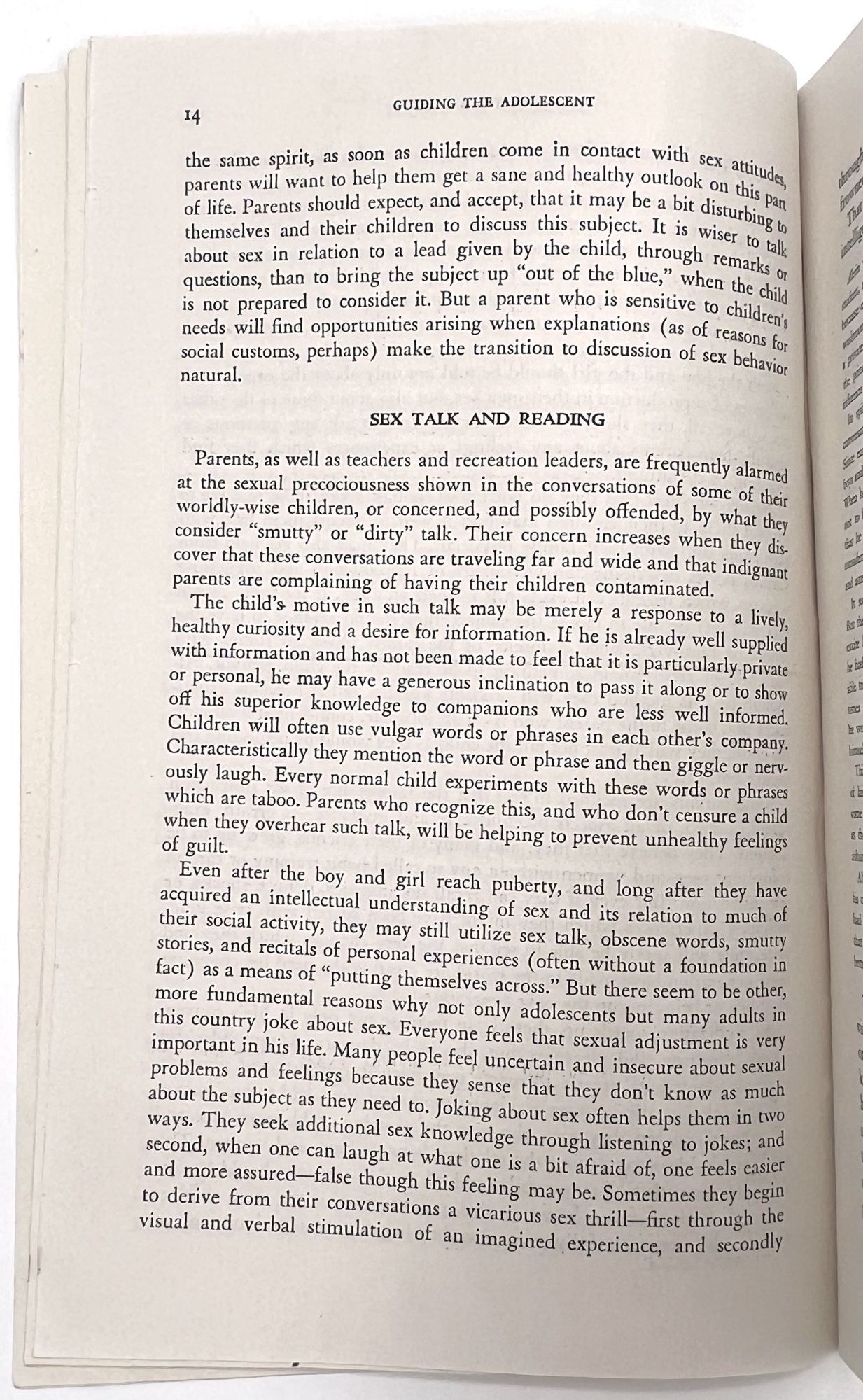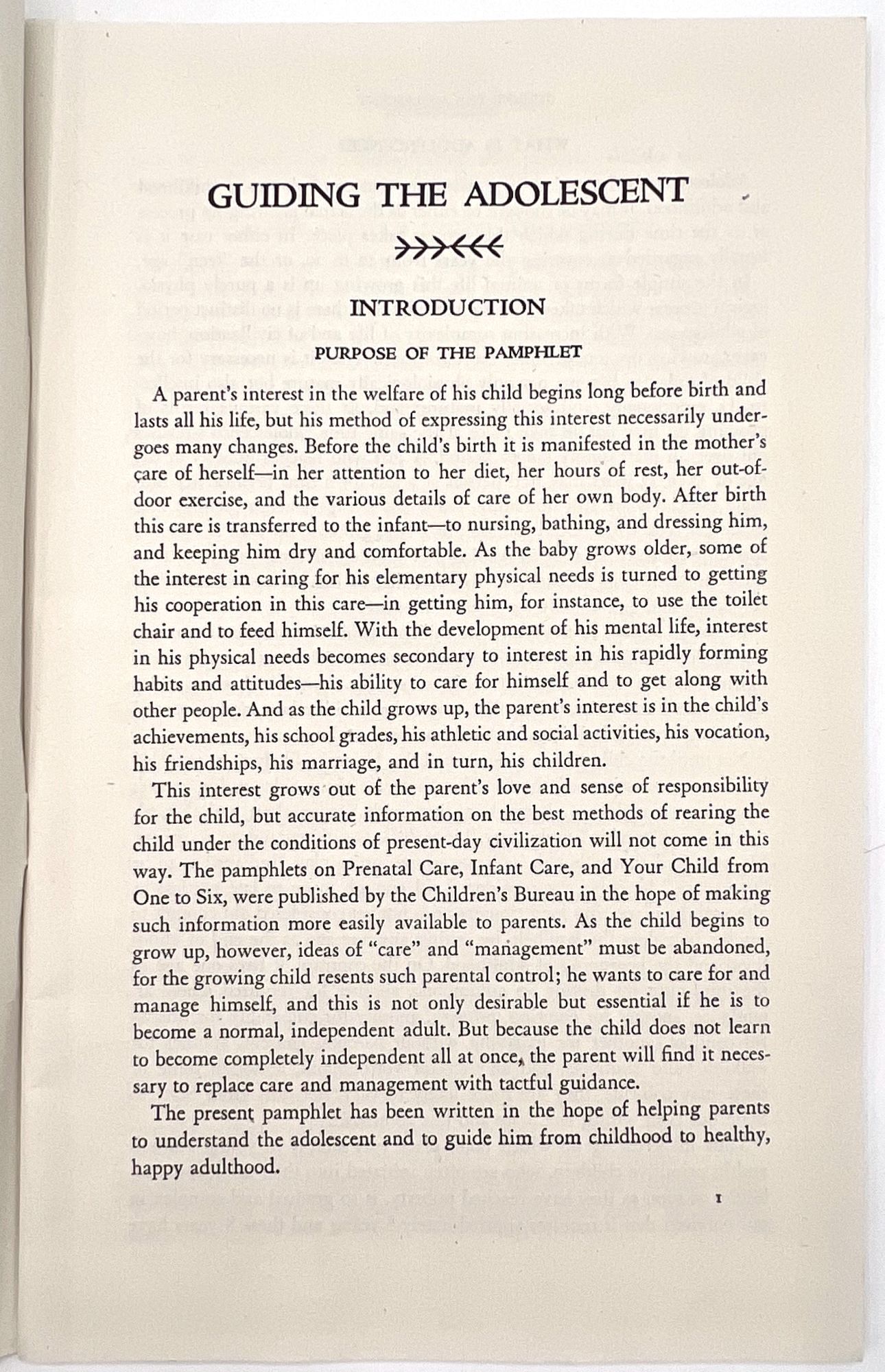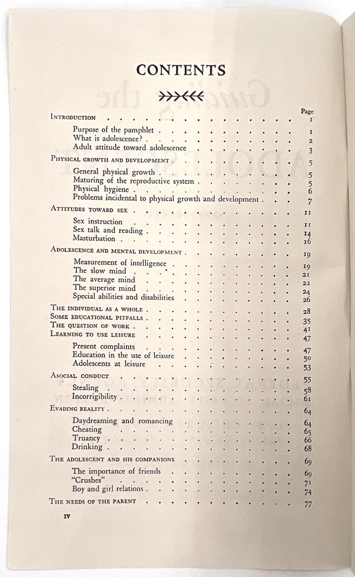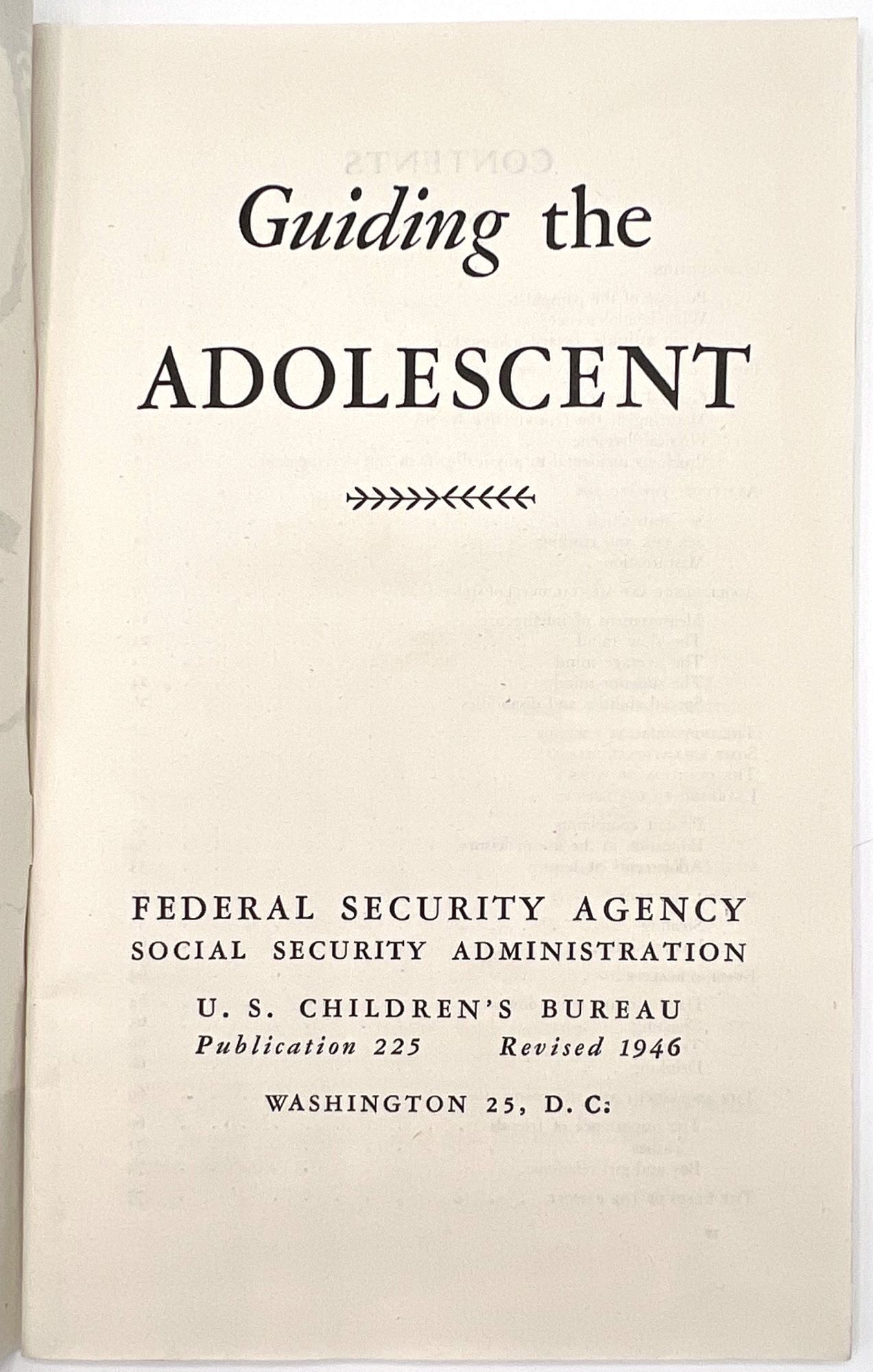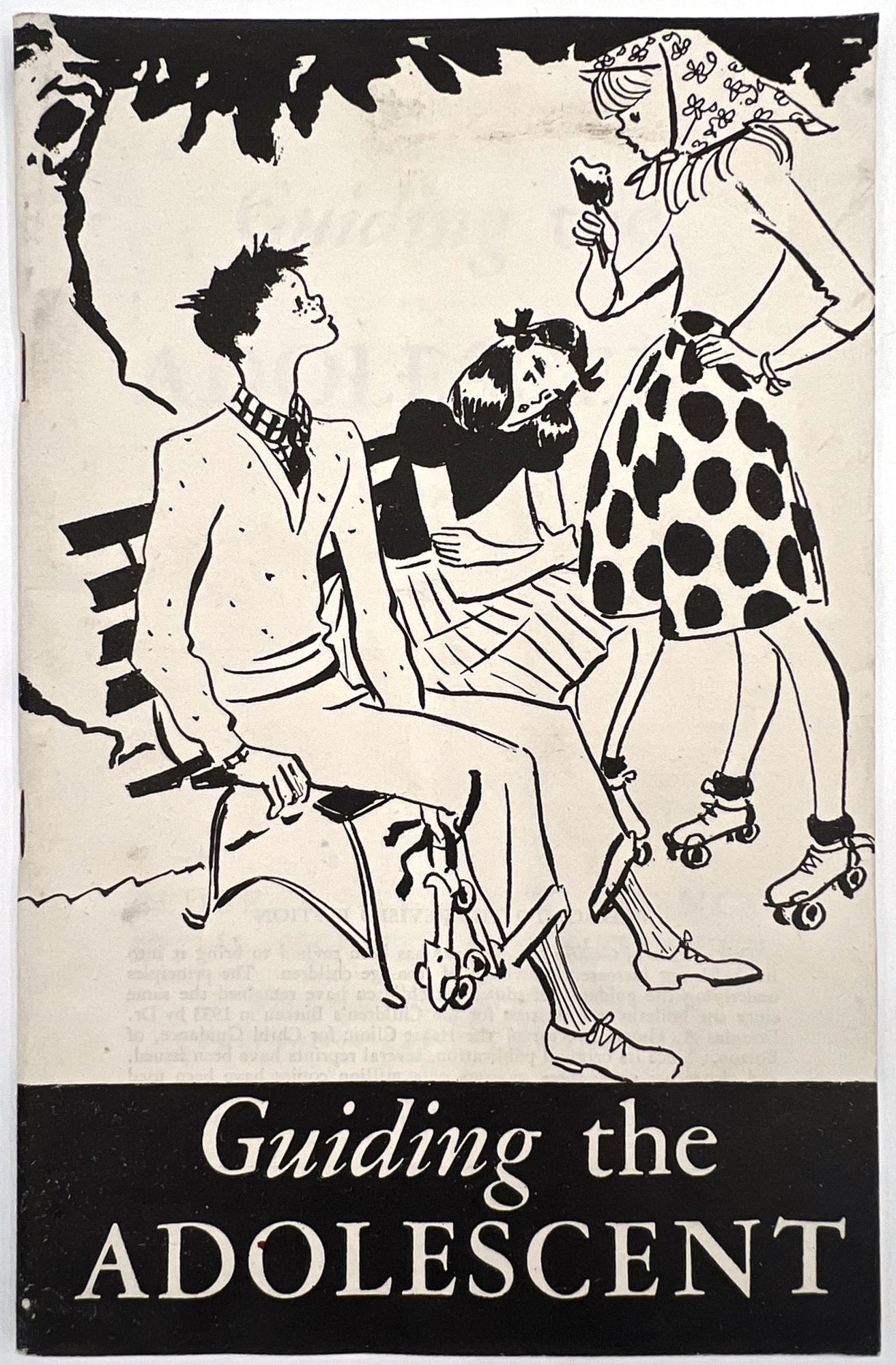 Washington, D.C.: Children's Bureau of the Social Security Administration, 1946. Very good to near-fine. Minor dust soiling.. Revised edition, published by the Children's Bureau of the Social Security Administration, of an educational booklet for American parents and families, guiding them through the turbulent teen years. Includes sections introducing adolescence, physical growth and changes, sex education, mental development (interestingly, broken into three sections: "slow", "average", and "superior"), productive leisure time, the importance of friends and how to handle "boy girl relations". Includes two interesting chapters titled "Asocial Conduct" and "Evading Reality" which advise parents on how to handle stealing, "incorrigibility", cheating, truancy, and underage drinking. "Daydreaming and romancing" is dismissed as "harmful to healthy mental development. Boys and girls should be helped to realize that they can win the recognition they desire through active effort in some given field rather than through such unsatisfactory methods as romancing and daydreaming" (p.65). Concludes which a brief section on the needs of parents, and encourages them to persist in trying to understand their teens, Single vol. (9.25" by 5.75"), pp. 84, in original illus. self wrps depicting teens roller skating and talking on a park bench. Note the booklet's attitude towards sexually active young women: "The girl who permits promiscuous petting with unlimited privileges gets the reputation of being 'easy' and 'common'. As a social asset, she is less valuable..." (p.76).