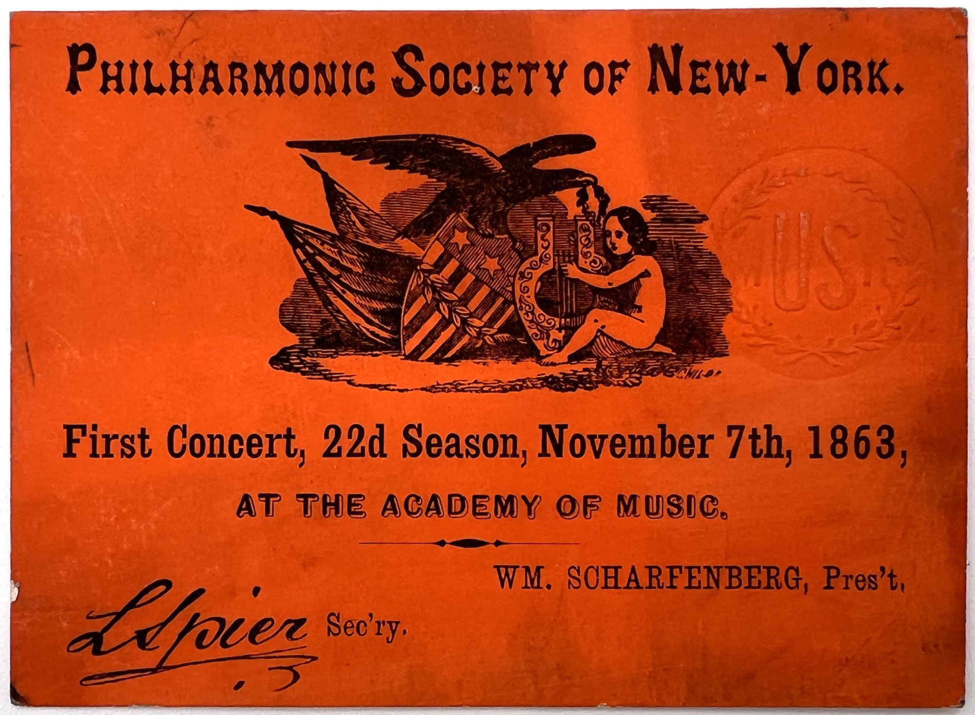New York, New York: Philharmonic Society of New York, 1863. Very good. Minor dust soiling.. Printed ticket for the first concert of the 1863 season of the Philharmonic Society of New York. Includes pro-Union allegorical imagery of an eagle and American flags, appropriate given the concert was given in New York during the Civil War. Printed on orange card with embossed seal reading "mUSic" on right-hand margin, verso blank, measures 3" by 4