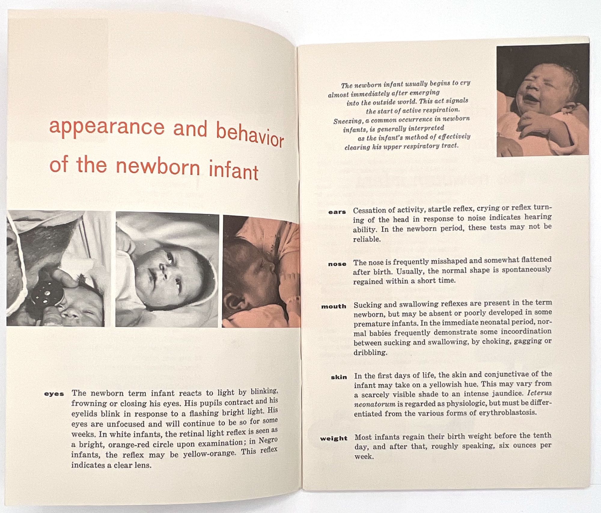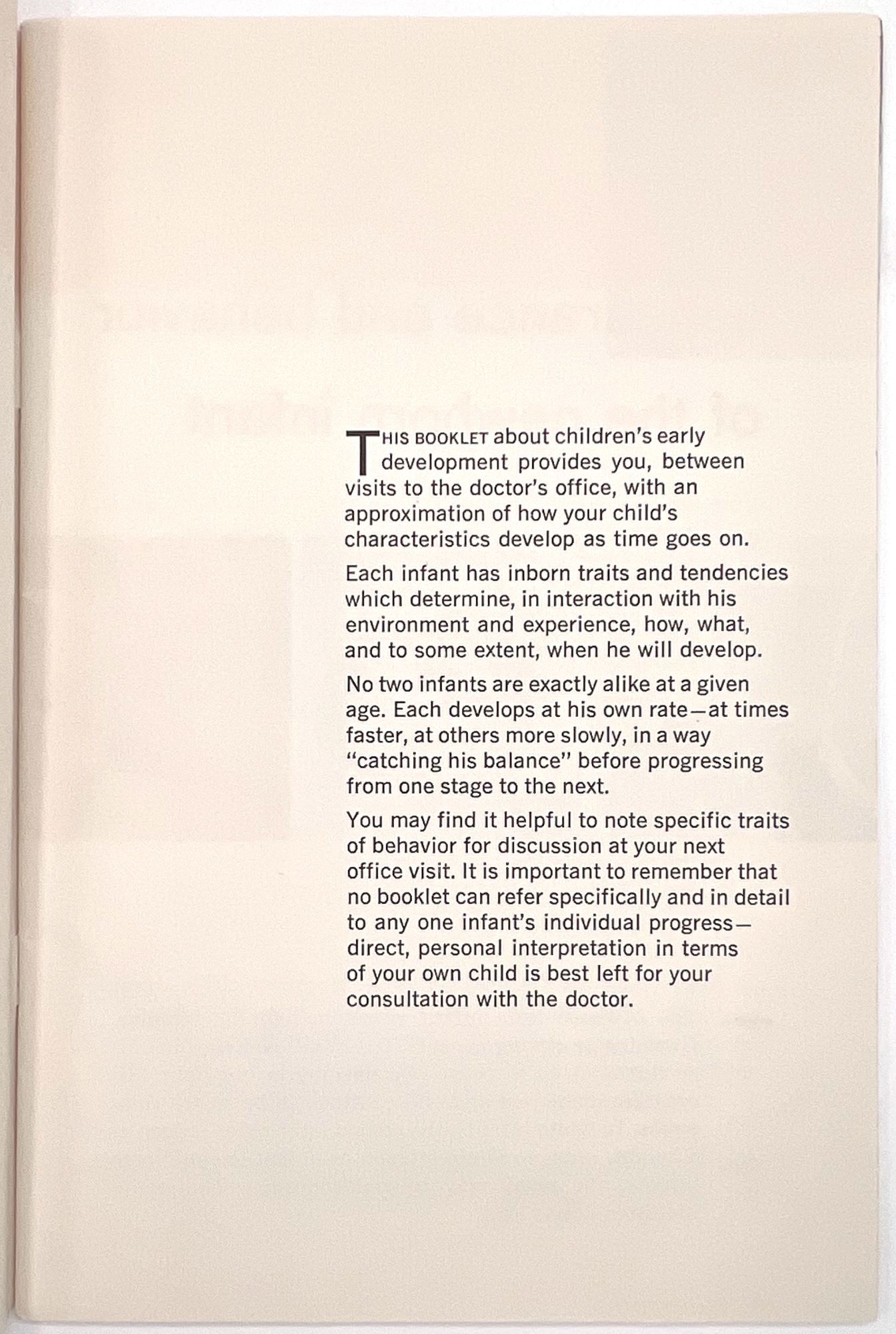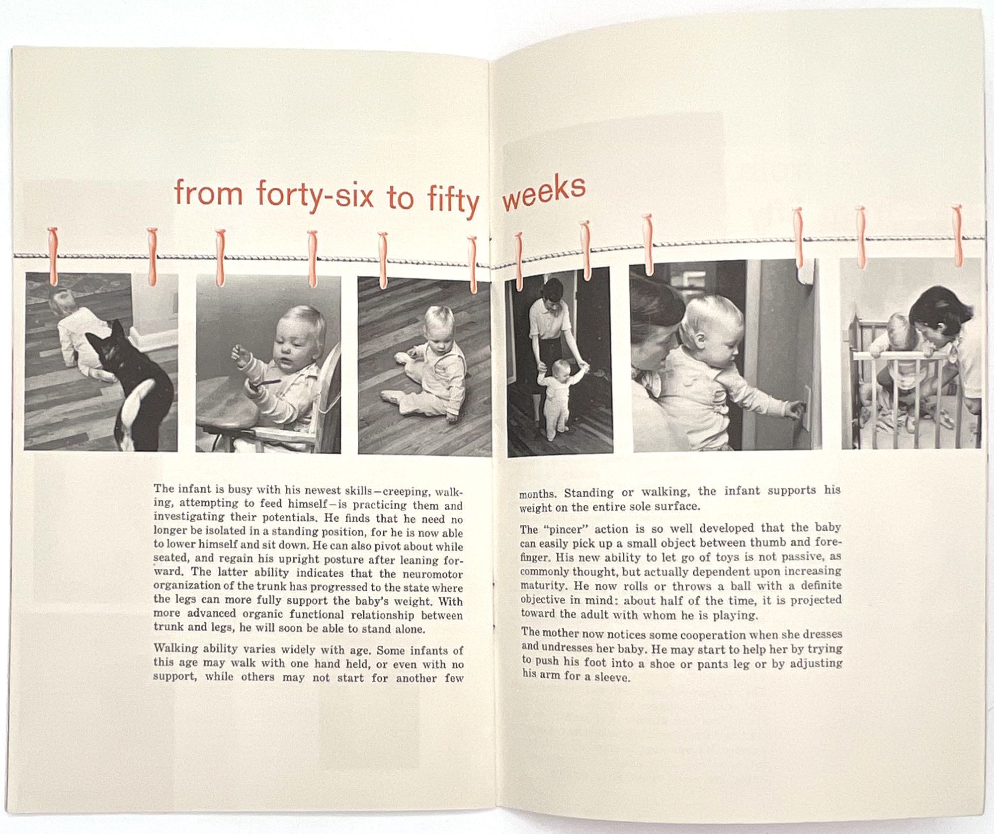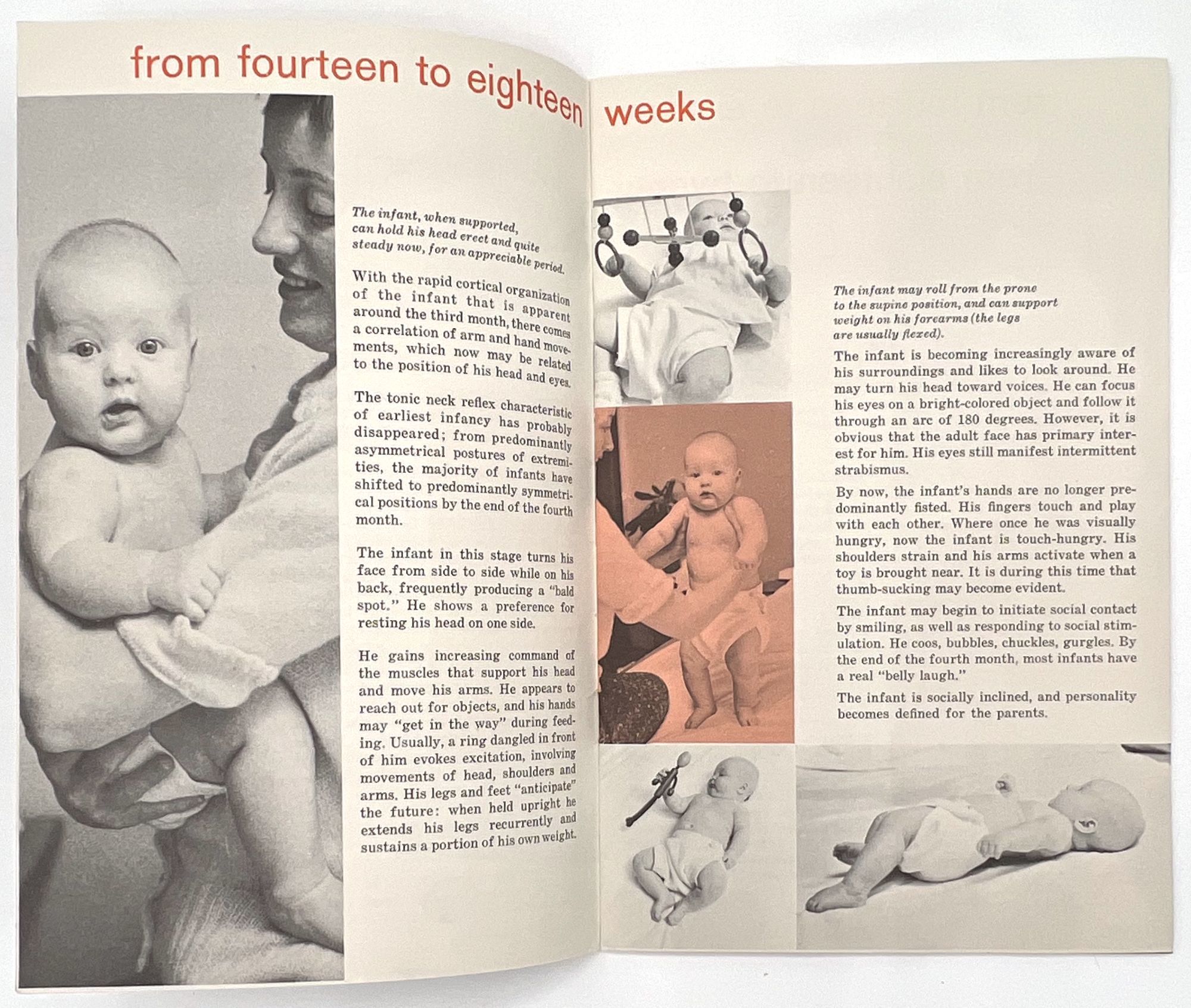 [Columbus, Ohio]: Ross Laboratories, 1959. Very good to near-fine.. A detailed guide for new parents offering insight into child development and psychology. The booklet marks expected milestones, sometimes down to the week, between the baby's birth and the twenty-four month mark, giving a view into how an infant grows into a toddler. Covers physical changes (e.g. when the baby begins to roll over or crawl) as well as social and psychological changes (e.g. when they may respond to games like peek-a-boo, or initiate social contact by smiling). Single vol. (8.5" by 5.5"), pp. [36], photo illustrated, stapled in original illus. wrps. with illustration of a young child's profile. Offered here with the original accompanying five (5) at-a-glance schedule cards for babies aged five weeks through two years, measuring approx. 8.5" by 5.5", and one (1) printed leaf of "Instructions for the Newborn" with direct advice for bath time, feedings, and nutrition for the post-partum mother (8.25" by 5.5"). Ross Laboratories was founded in 1903, and produced infant formula from 1925; it would later be mass-produced as "Similac" infant formula.