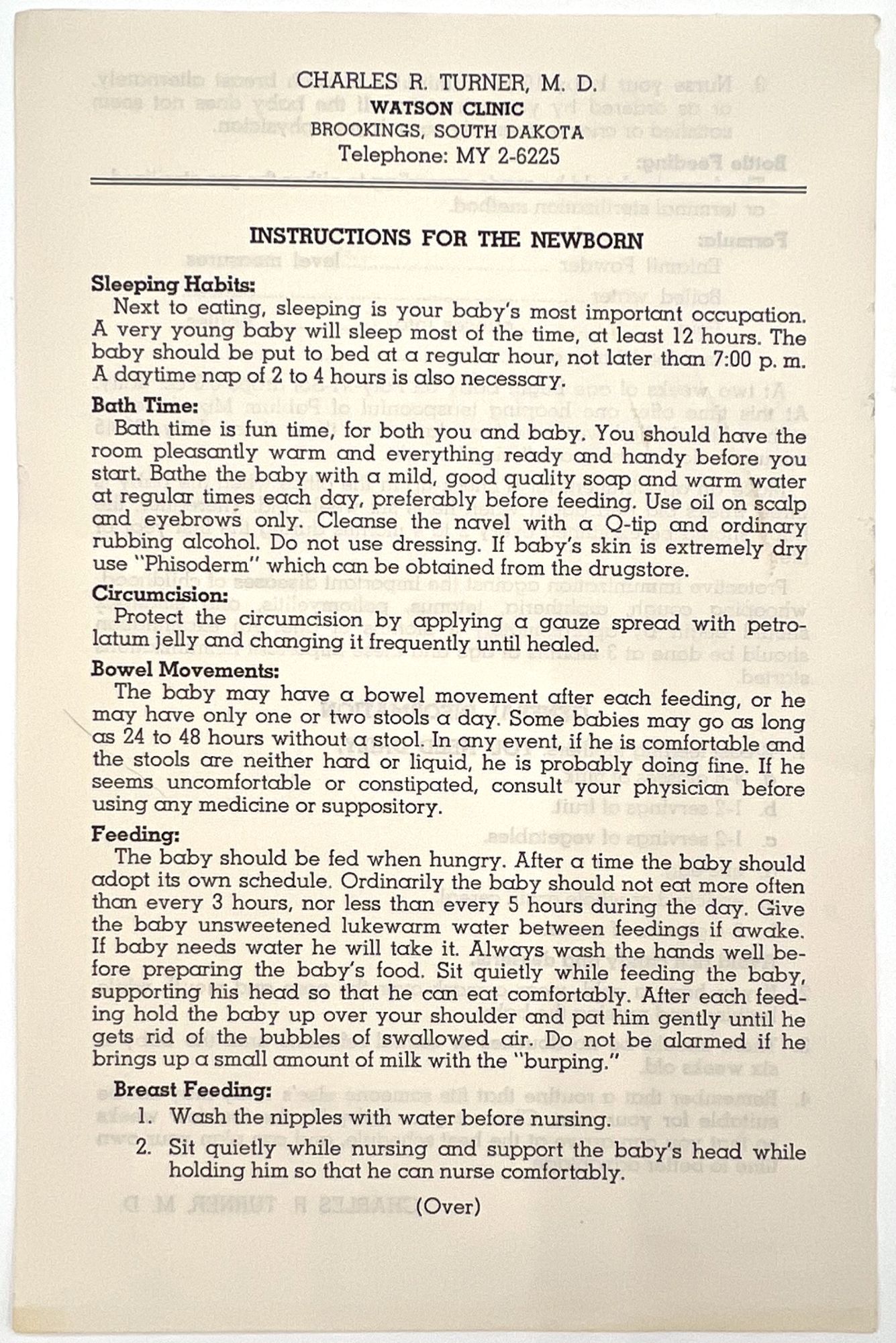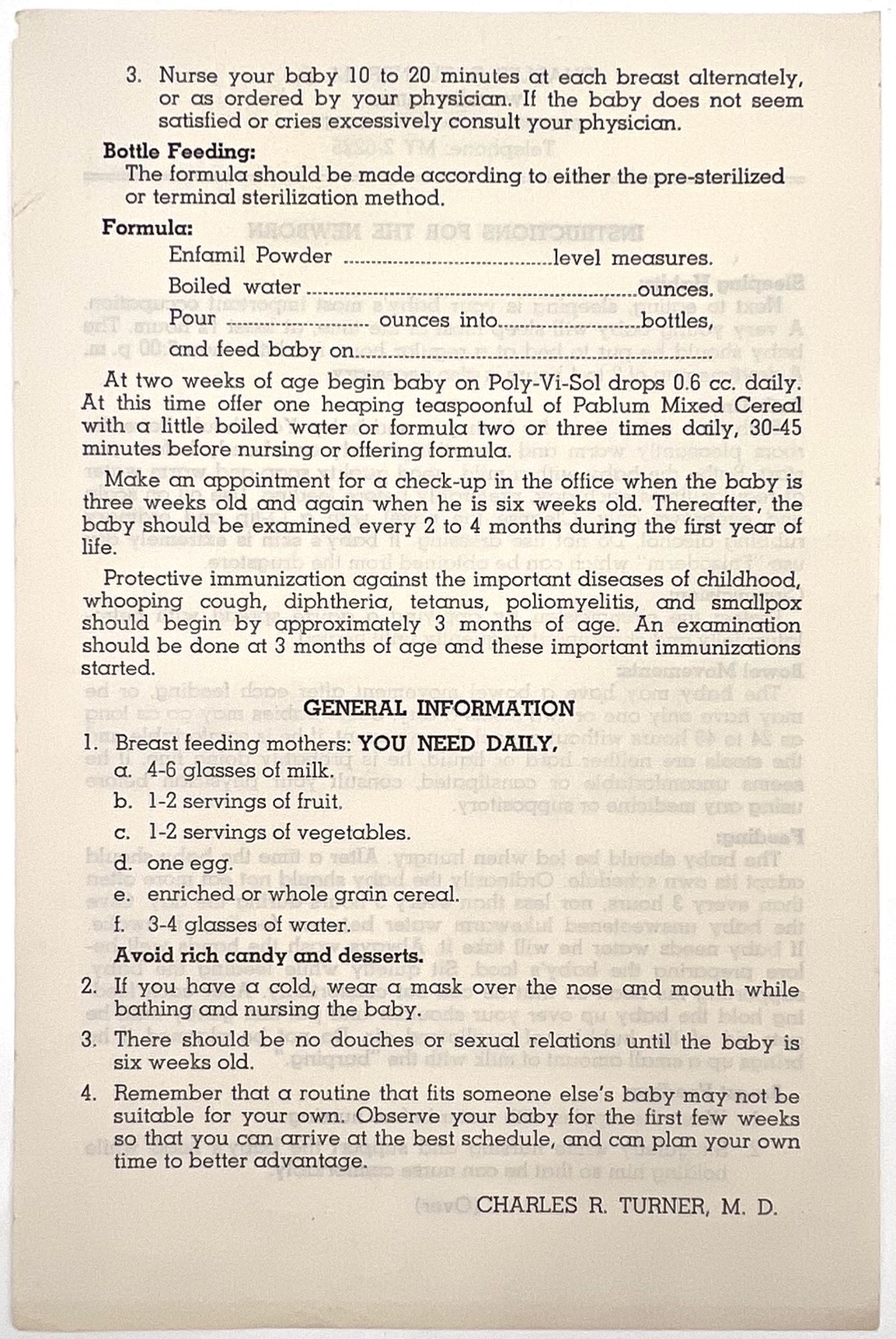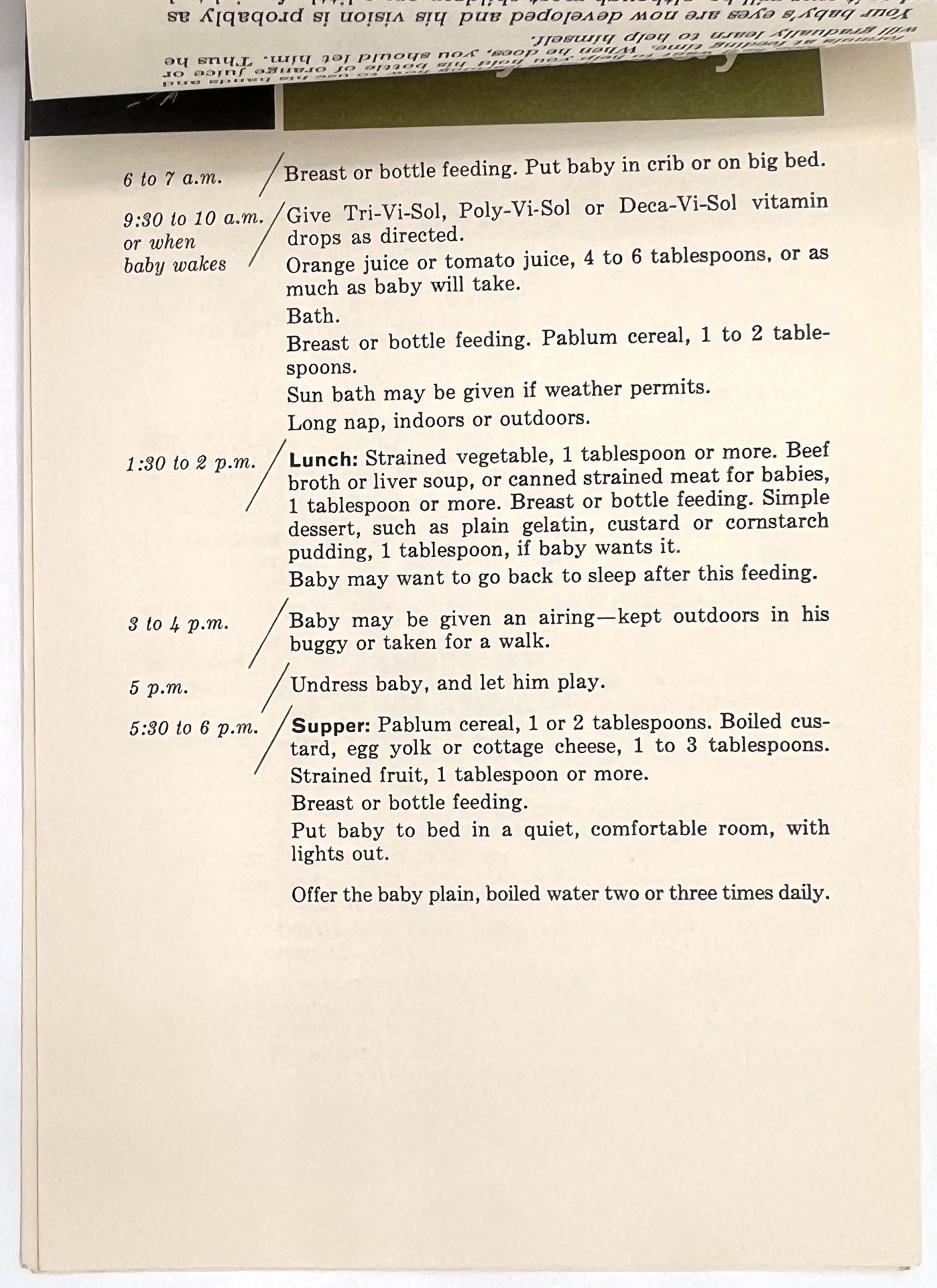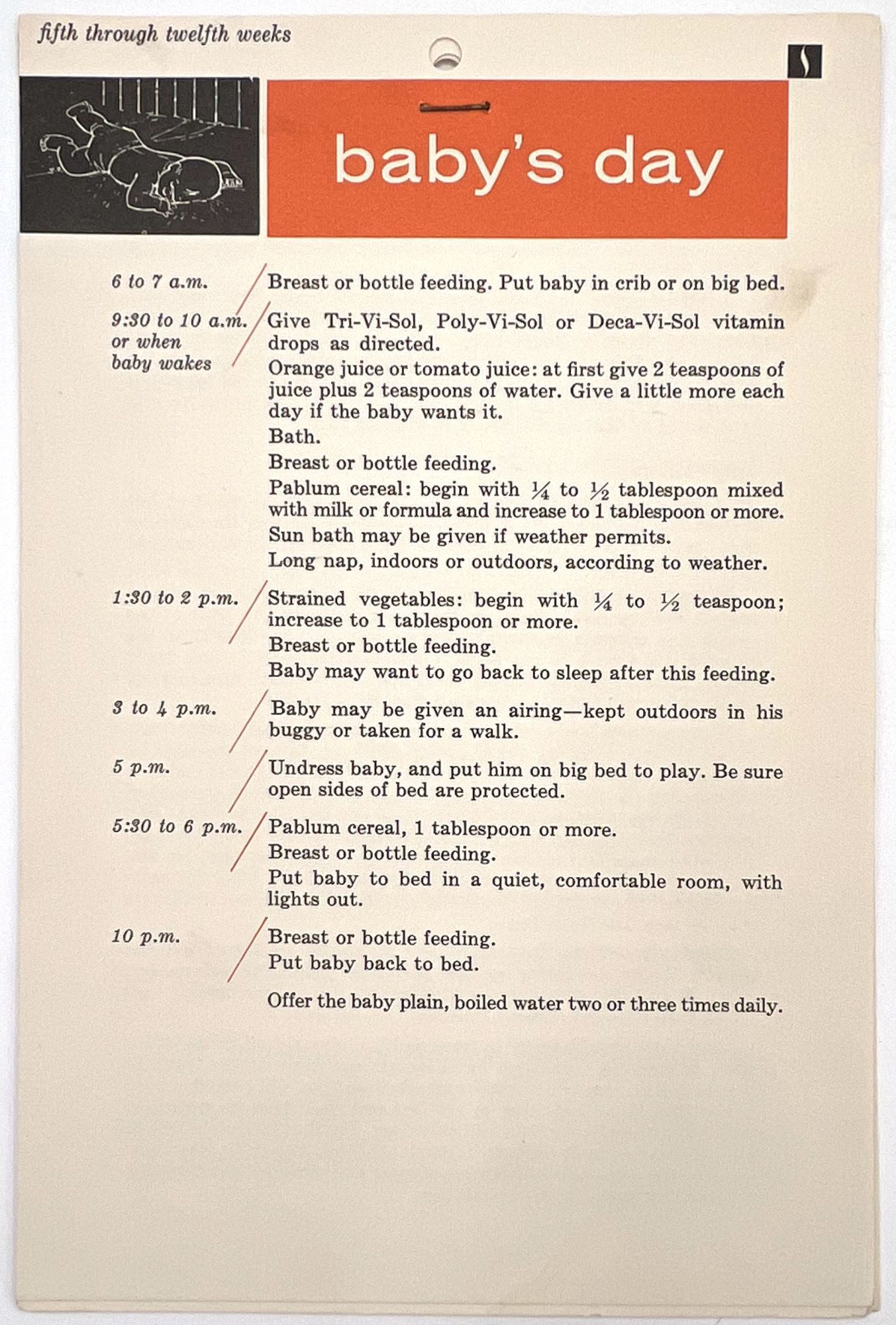 [Columbus, Ohio]: Ross Laboratories, 1959. Very good to near-fine.. A detailed guide for new parents offering insight into child development and psychology. The booklet marks expected milestones, sometimes down to the week, between the baby's birth and the twenty-four month mark, giving a view into how an infant grows into a toddler. Covers physical changes (e.g. when the baby begins to roll over or crawl) as well as social and psychological changes (e.g. when they may respond to games like peek-a-boo, or initiate social contact by smiling). Single vol. (8.5" by 5.5"), pp. [36], photo illustrated, stapled in original illus. wrps. with illustration of a young child's profile. Offered here with the original accompanying five (5) at-a-glance schedule cards for babies aged five weeks through two years, measuring approx. 8.5" by 5.5", and one (1) printed leaf of "Instructions for the Newborn" with direct advice for bath time, feedings, and nutrition for the post-partum mother (8.25" by 5.5"). Ross Laboratories was founded in 1903, and produced infant formula from 1925; it would later be mass-produced as "Similac" infant formula.