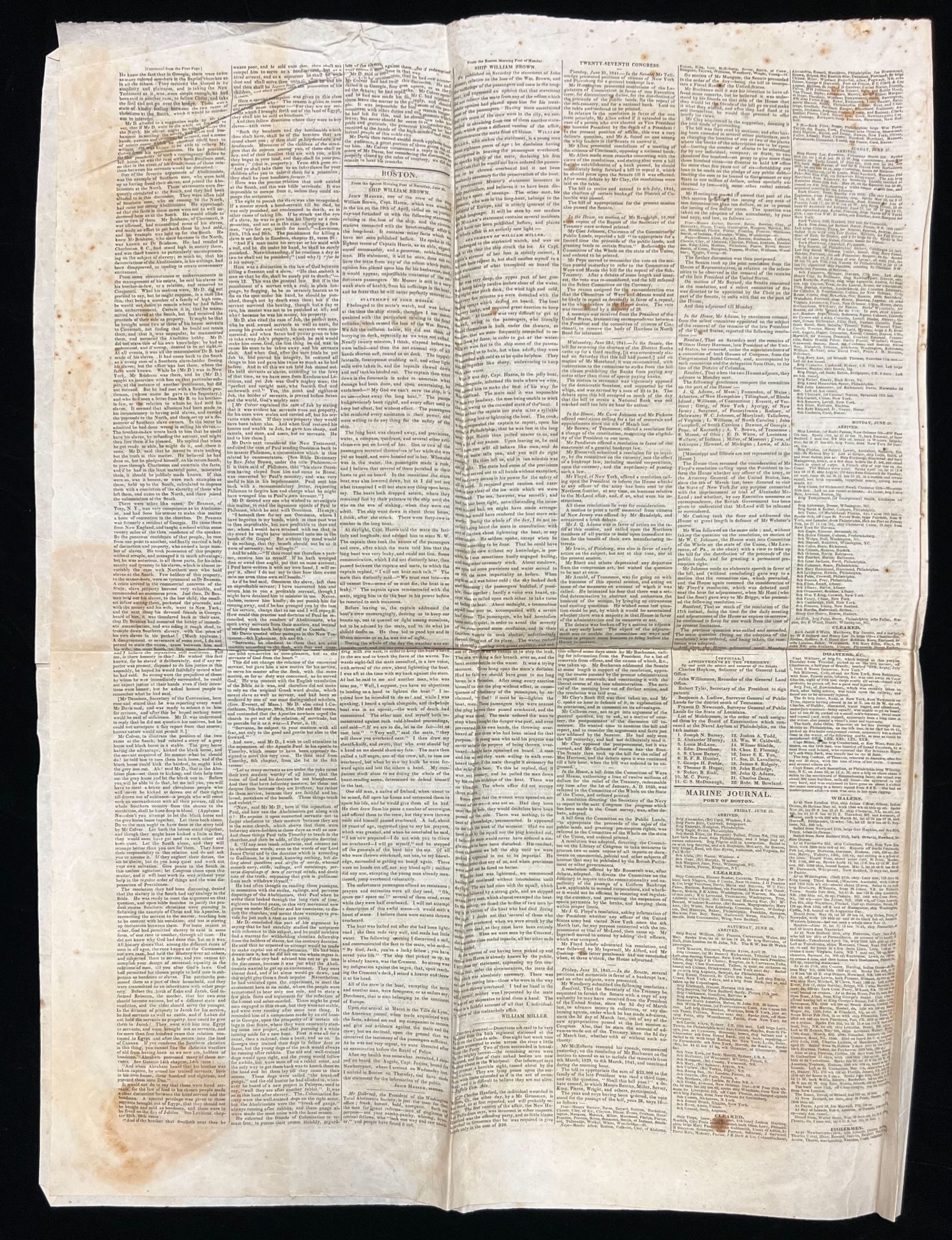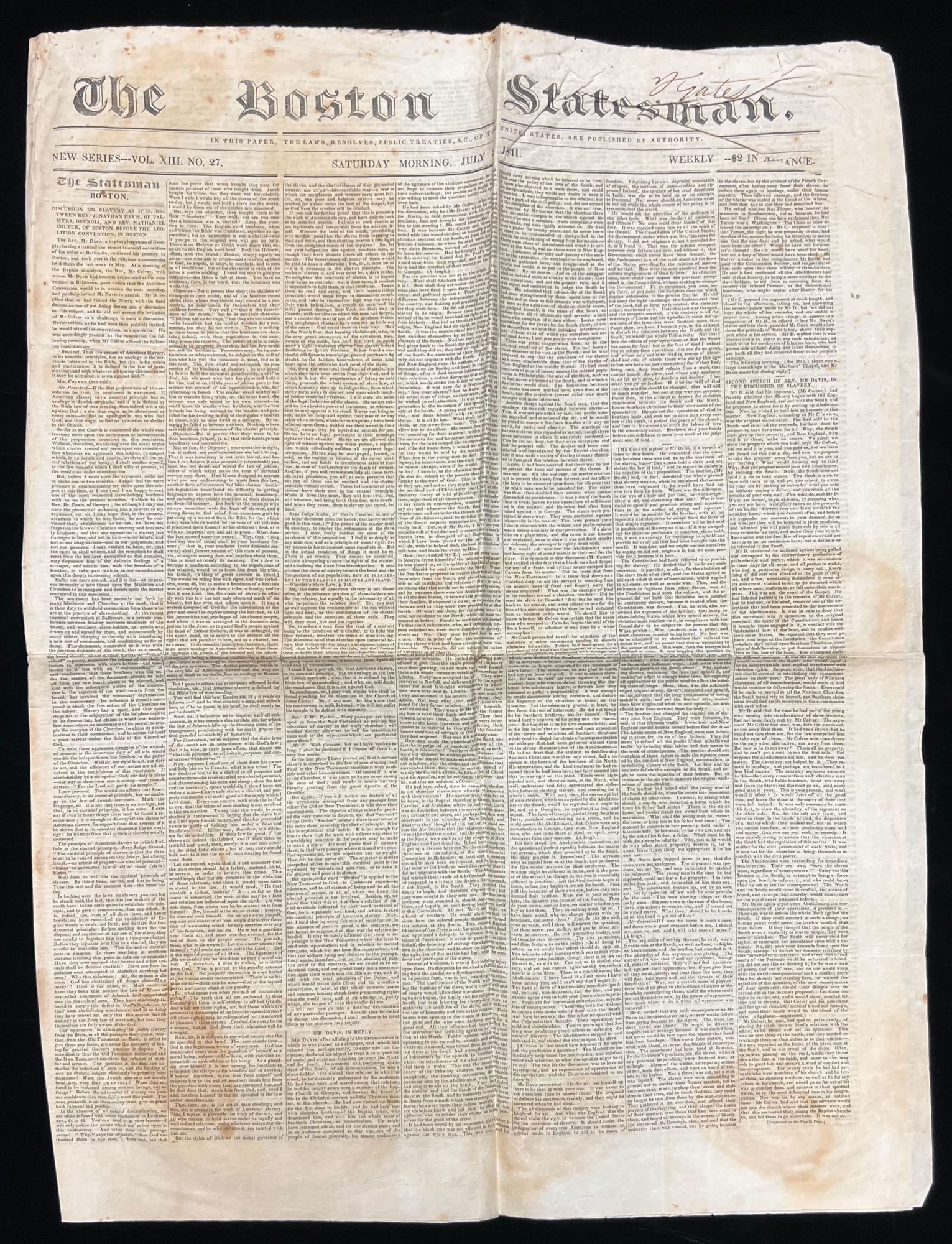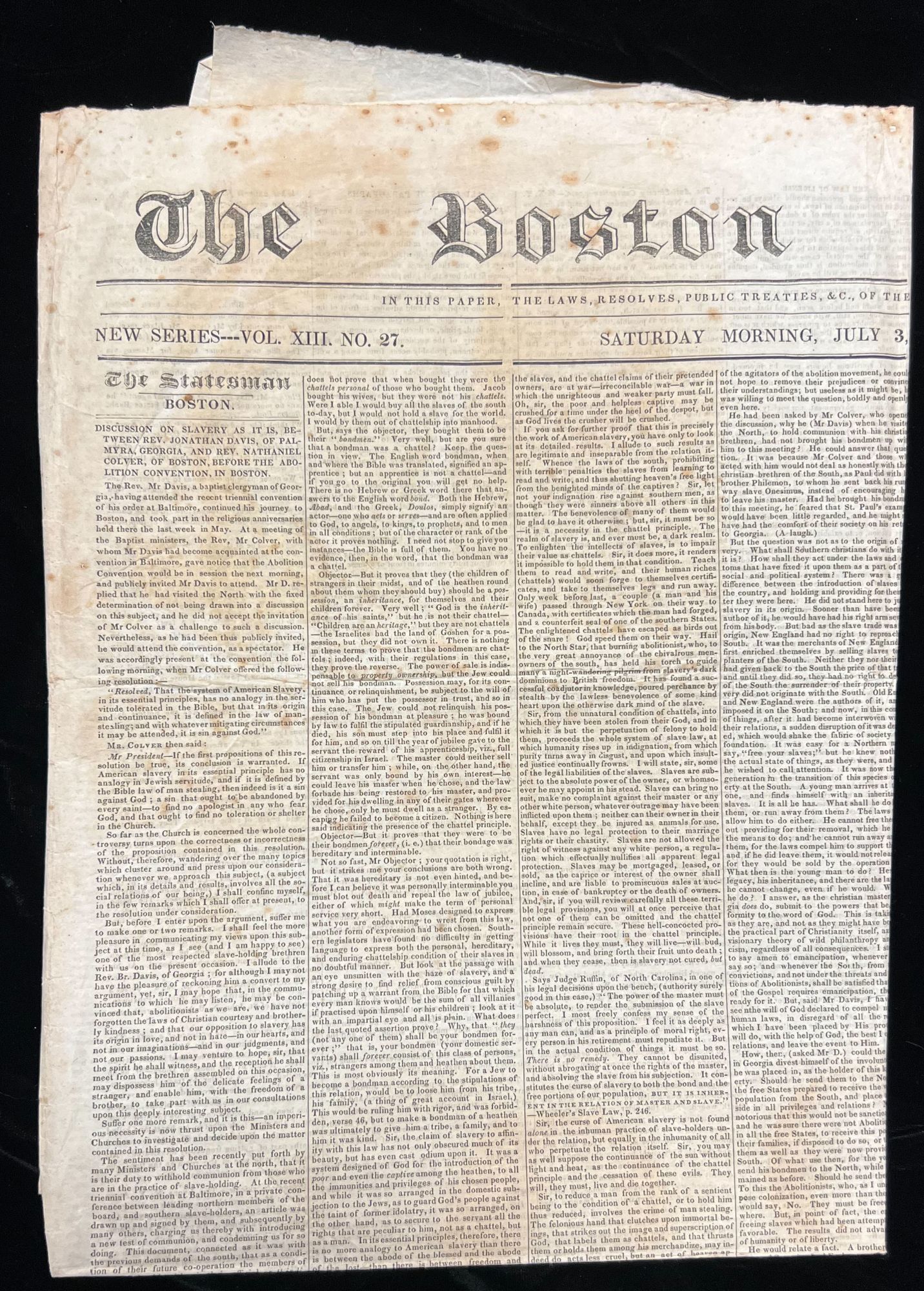 Boston, Massachusetts: The Boston Statesman, 1841. Very good. Minor spotting, creasing, staining. One or two chips or short tears. Lightly toned. Letter creases.. The July 3rd, 1841 issue of the Boston Statesman, featuring an important account of the Abolition Convention in Boston in which the Rev. Jonathan Davis of Palmyra, Georgia (pro-slavery), faced off against the Rev. Nathaniel Colver of Boston (anti-slavery). The remainder of the issue is dedicated to the following topics: general politics and news; marriage announcements; arrivals to the Port of Boston, including a record of goods received; prices current of everything from Ashes to Wool; and other related trade and naval news. The article is detailed and fills the entirety of the first and a part of the fourth page. Large printed bifolium measuring 27" by 20.5". Early ink signature to head of first page.
