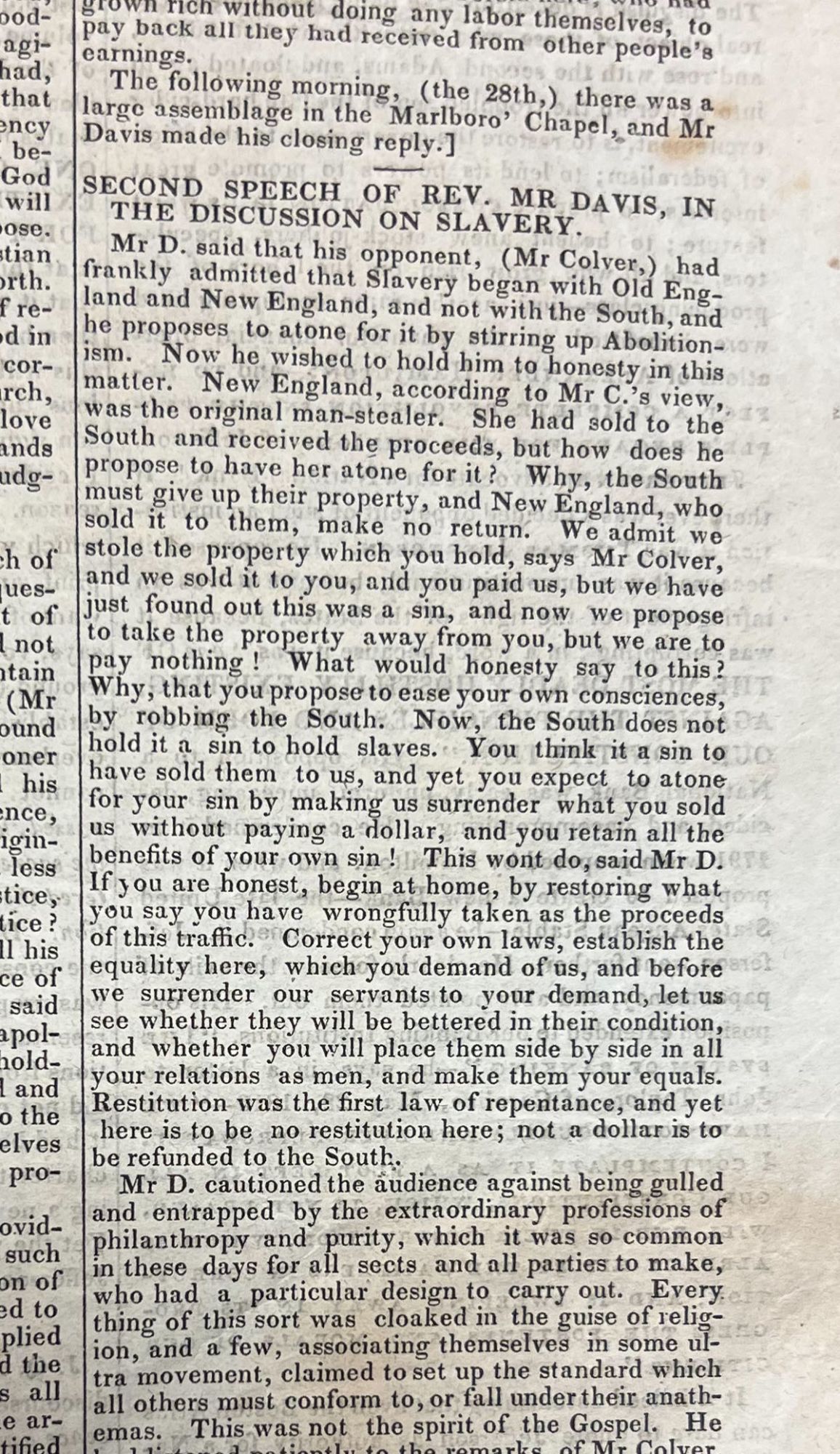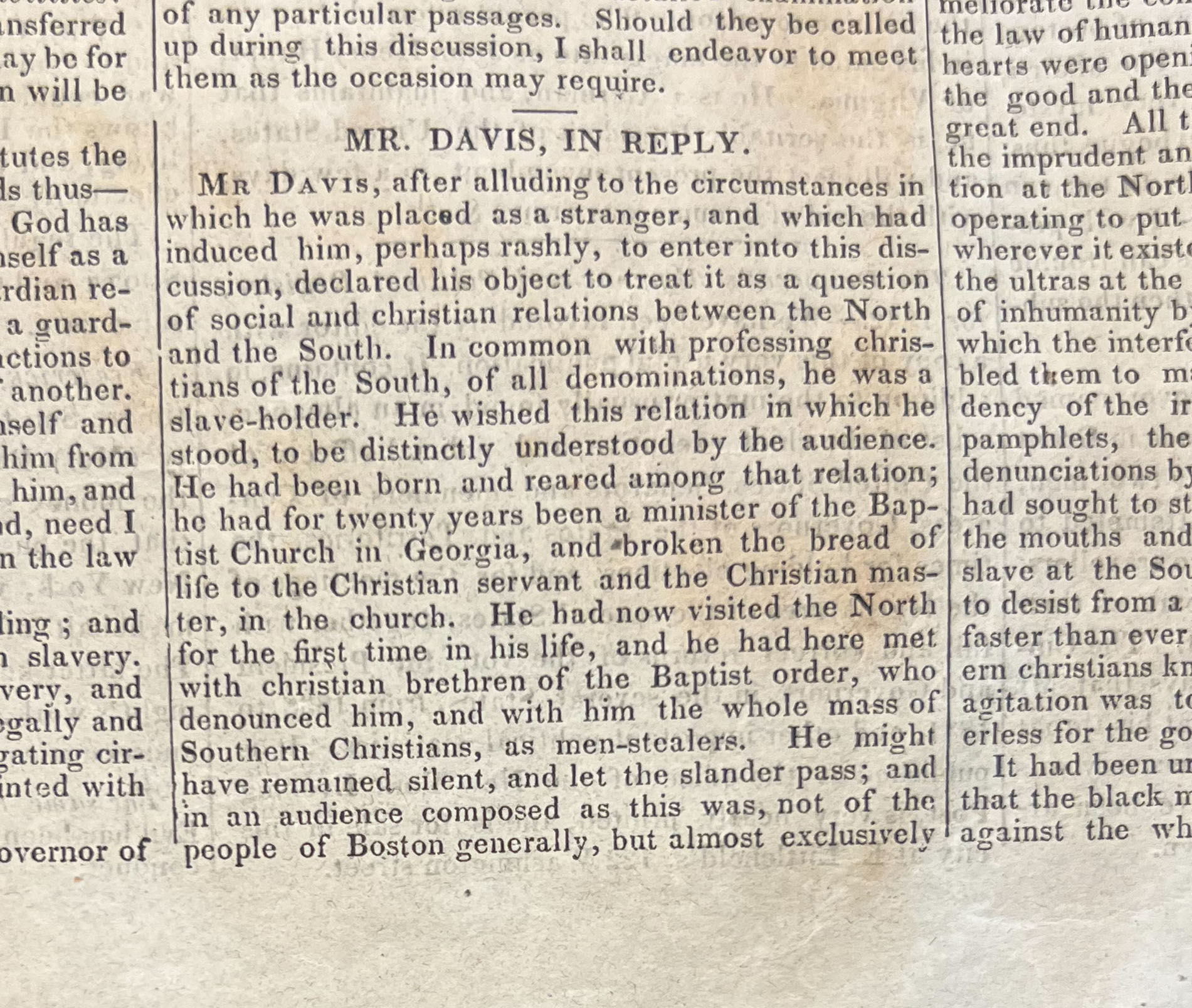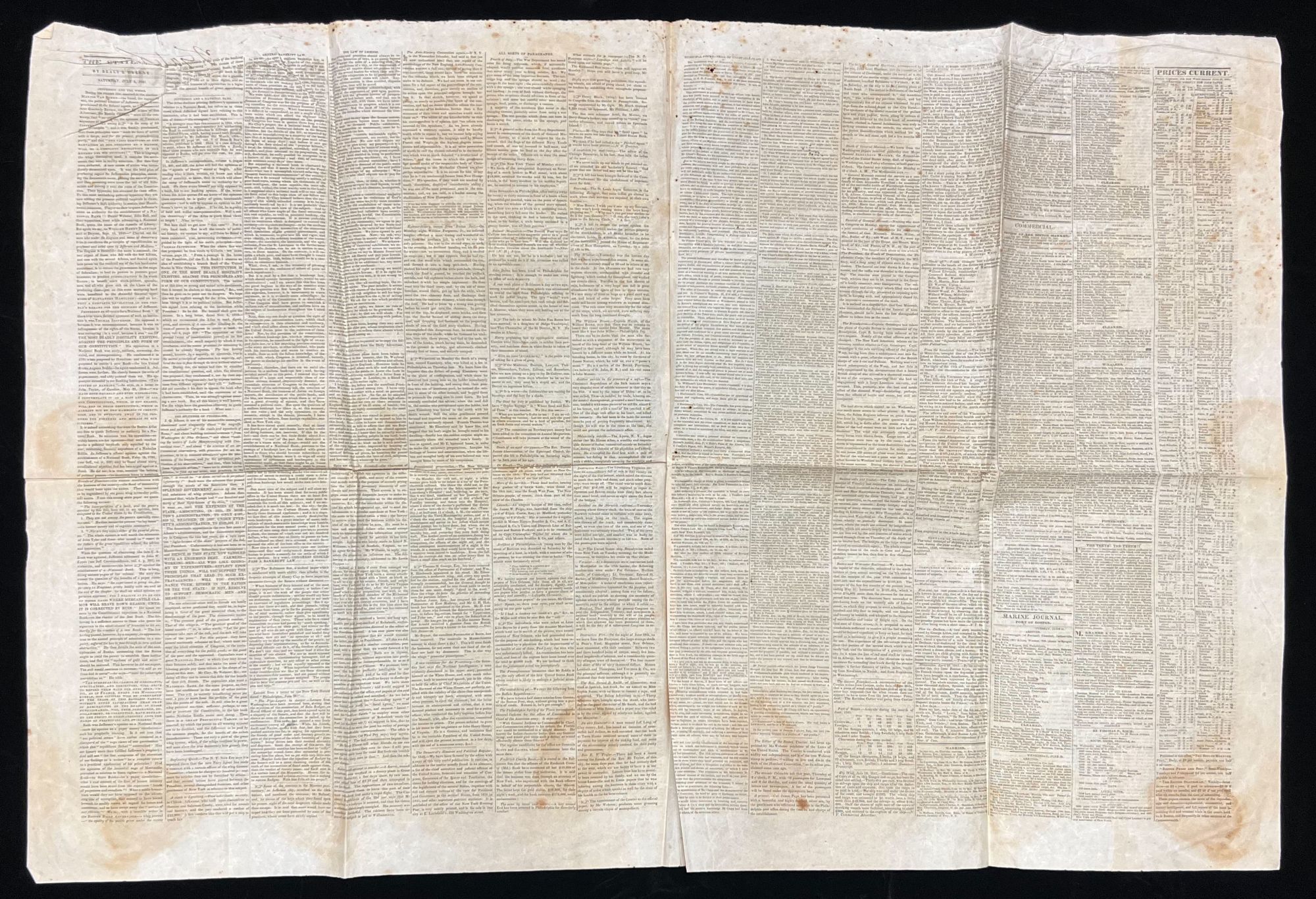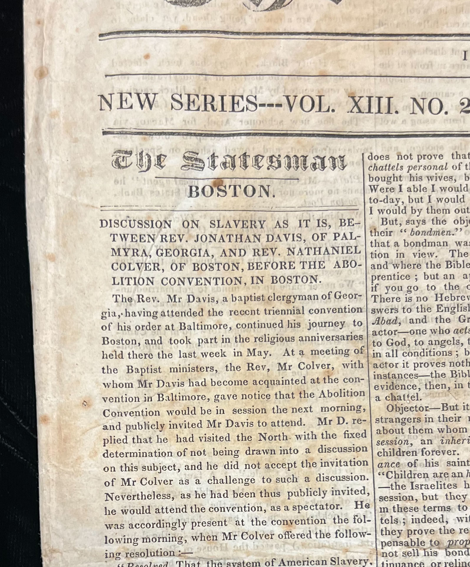 Boston, Massachusetts: The Boston Statesman, 1841. Very good. Minor spotting, creasing, staining. One or two chips or short tears. Lightly toned. Letter creases.. The July 3rd, 1841 issue of the Boston Statesman, featuring an important account of the Abolition Convention in Boston in which the Rev. Jonathan Davis of Palmyra, Georgia (pro-slavery), faced off against the Rev. Nathaniel Colver of Boston (anti-slavery). The remainder of the issue is dedicated to the following topics: general politics and news; marriage announcements; arrivals to the Port of Boston, including a record of goods received; prices current of everything from Ashes to Wool; and other related trade and naval news. The article is detailed and fills the entirety of the first and a part of the fourth page. Large printed bifolium measuring 27" by 20.5". Early ink signature to head of first page.