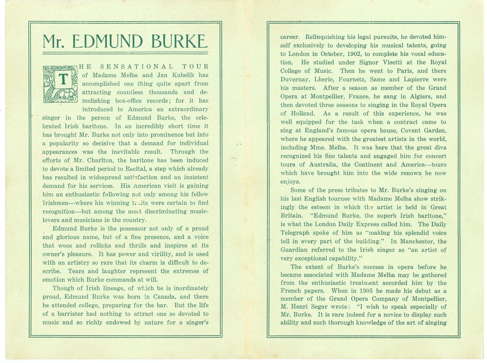 Printed Souvenir Program for Performance by Edmund Burke, "the celebrated Irish baritone