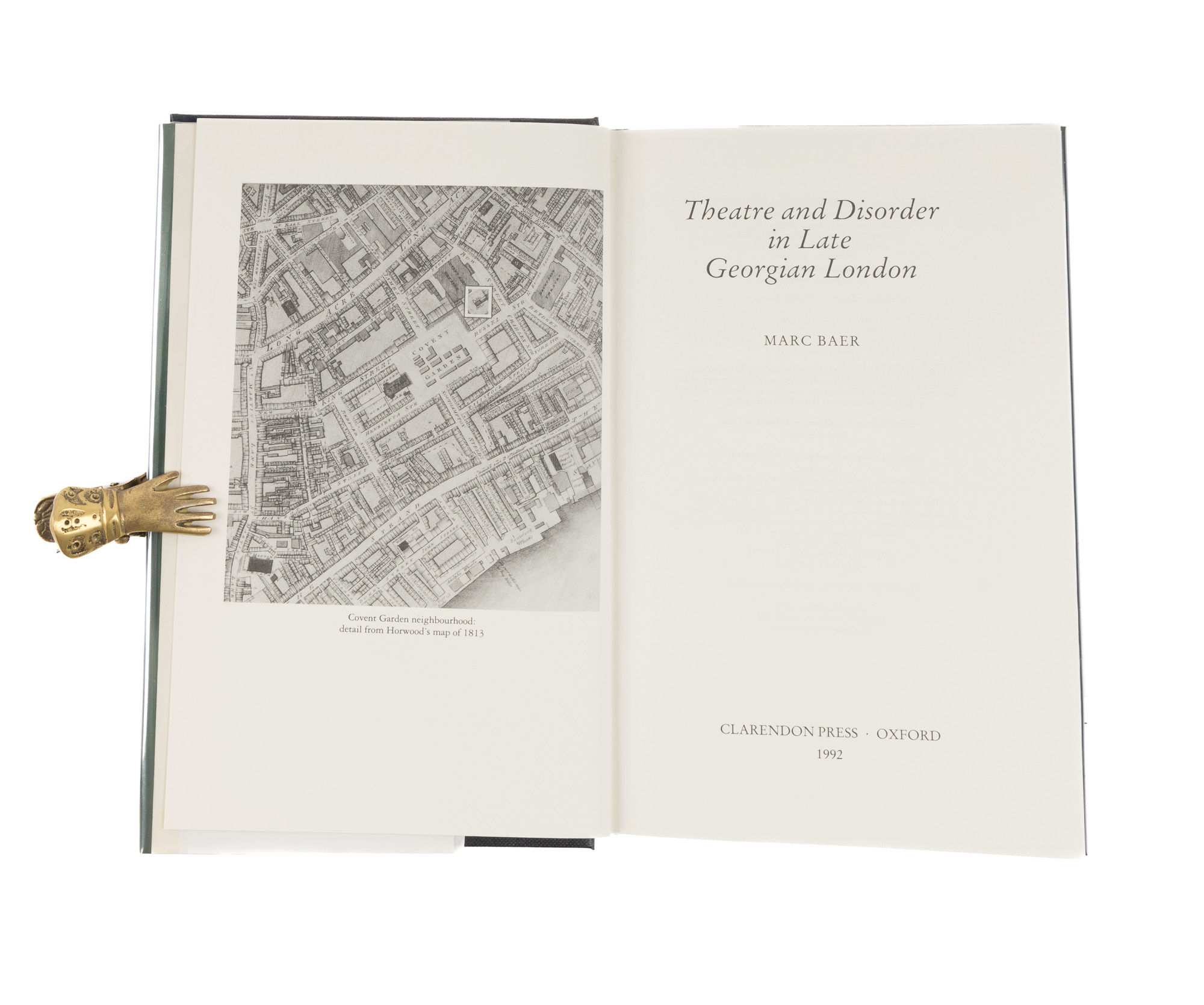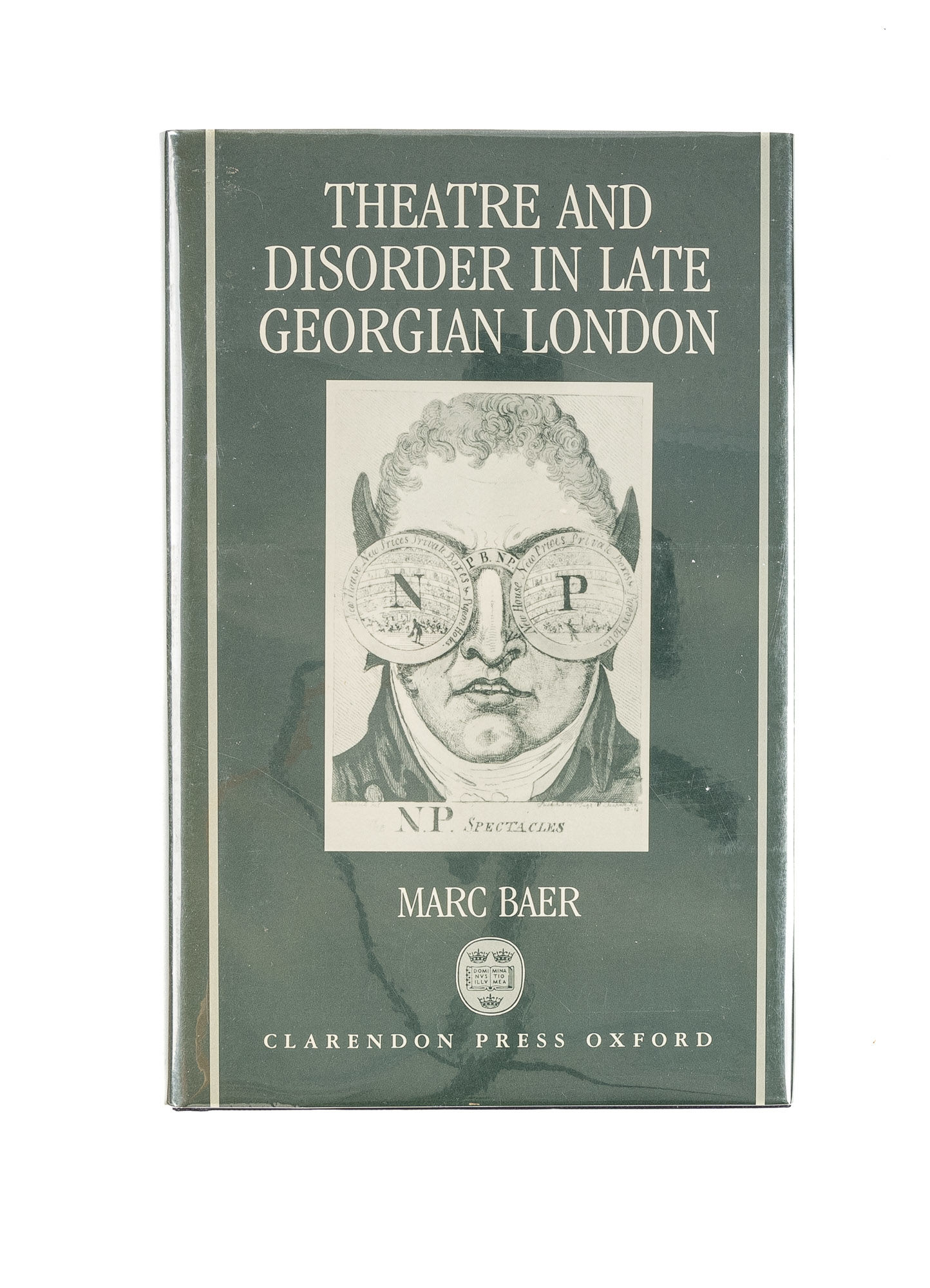 1992. Baer, Marc. Theatre and Disorder in Late Georgian London. Oxford [England]: Clarendon Press; New York: Oxford University Press, 1992. xii, 291 pp., frontispiece, illustrations, maps. Publisher's navy cloth, with gilt stamped spine. Fine, as new, in a very good dust jacket. $45. * In September of 1809 during the opening night of Macbeth at the newly rebuilt Covent Garden theatre the audience rioted over the rise in ticket prices. Disturbances took place on the following sixty-six nights that autumn and the Old Price riots became the longest running theatre disorder in English history. This book describes the events in detail, sets them in their wider context, and uses them to examine the interpenetration of theatre and disorder. Previous understandings of the riots are substantially revised by stressing populist rather than class politics. Baer concentrates on the theatricality of audiences, the role of the stage in shaping English self-image and the relationship between contention and consensus. In so doing, theatre and theatricality are rediscovered as explanations for the cultural and political structures of the Georgian period. Based on meticulous research in theatre and governmental records, newspapers, private correspondence, and satirical prints and other ephemera, this study is an unusually interesting and original contribution to the social and political history of early 19th-century Britain. (Publisher's description).