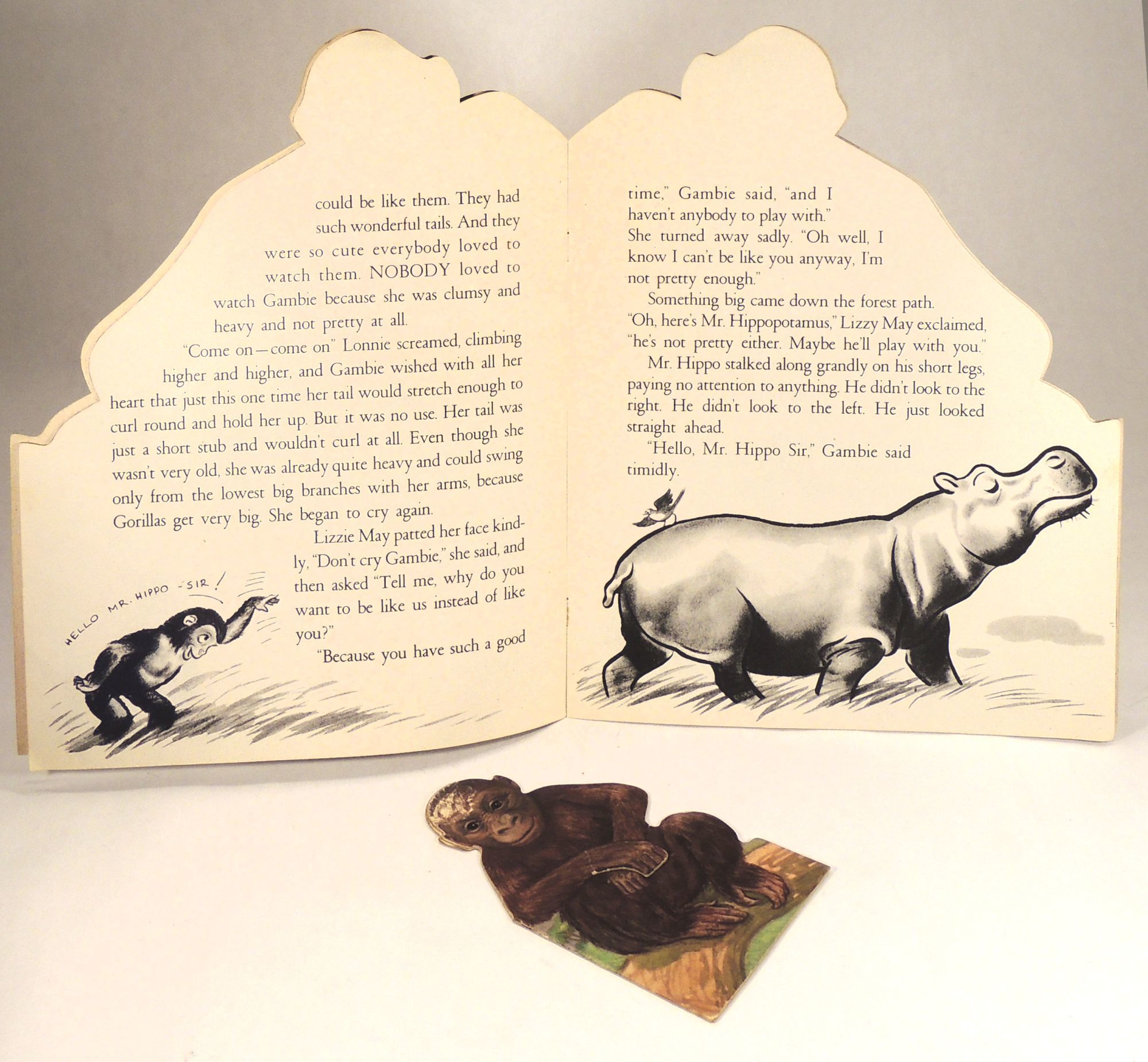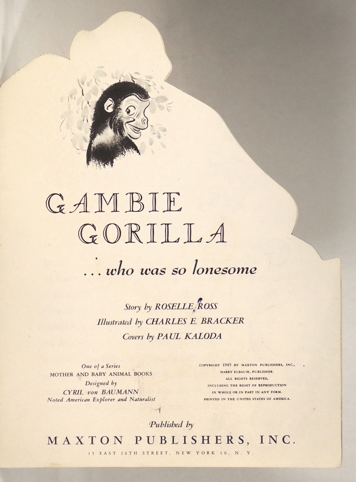 New York: Maxton Publishers, Inc, 1945. Paperback. Very Good. Paperback. One of a series: Mother and Baby Animal Books. Designed by Cyril von Baumann, noted American Explorer and Naturalist. A sweet story about a lonley baby gorilla who tries to play with other animals, but doesn't fit in. When she gets a baby sister, she learns to accept herself. This shape book features a mommy gorilla with a slit cut to hold a removable baby gorilla. Bound in side stapled stiff paper wrappers. Creasing to head of mother gorilla and a few chips to edges of wrappers and to arm cutout. Short closed tear to edge of arm seam. Chip to rear cover on head of gorilla and small chip to corner on bottom front cover. Rubbing to baby gorilla, wear to edges, and crease to forearm. Short blue pen marking to title page, short brown pen marking to inside front cover, and a few scattered spots of foxing, else clean. Size: 12 x 9 inches. [16 pages.] CHILD/062624.