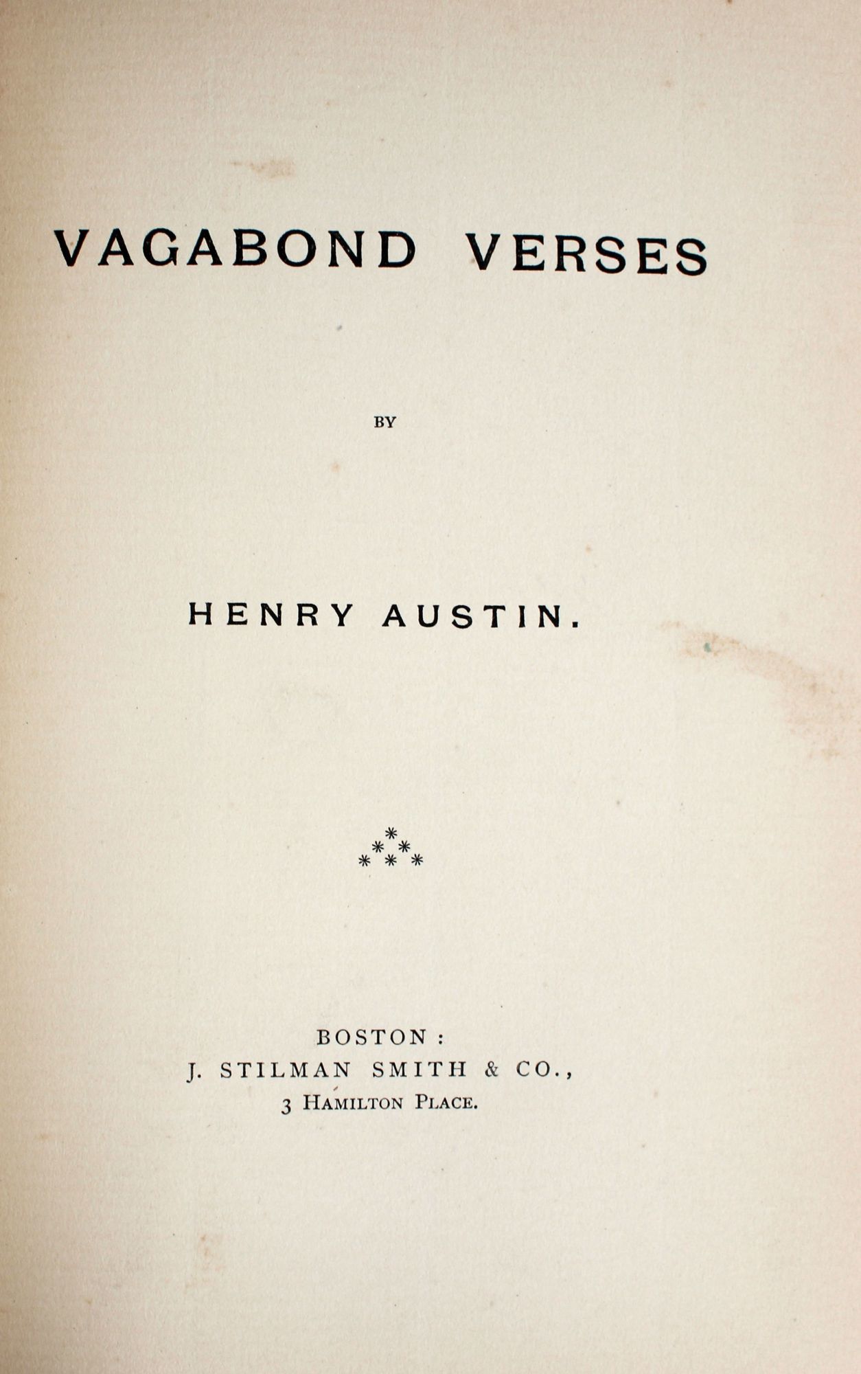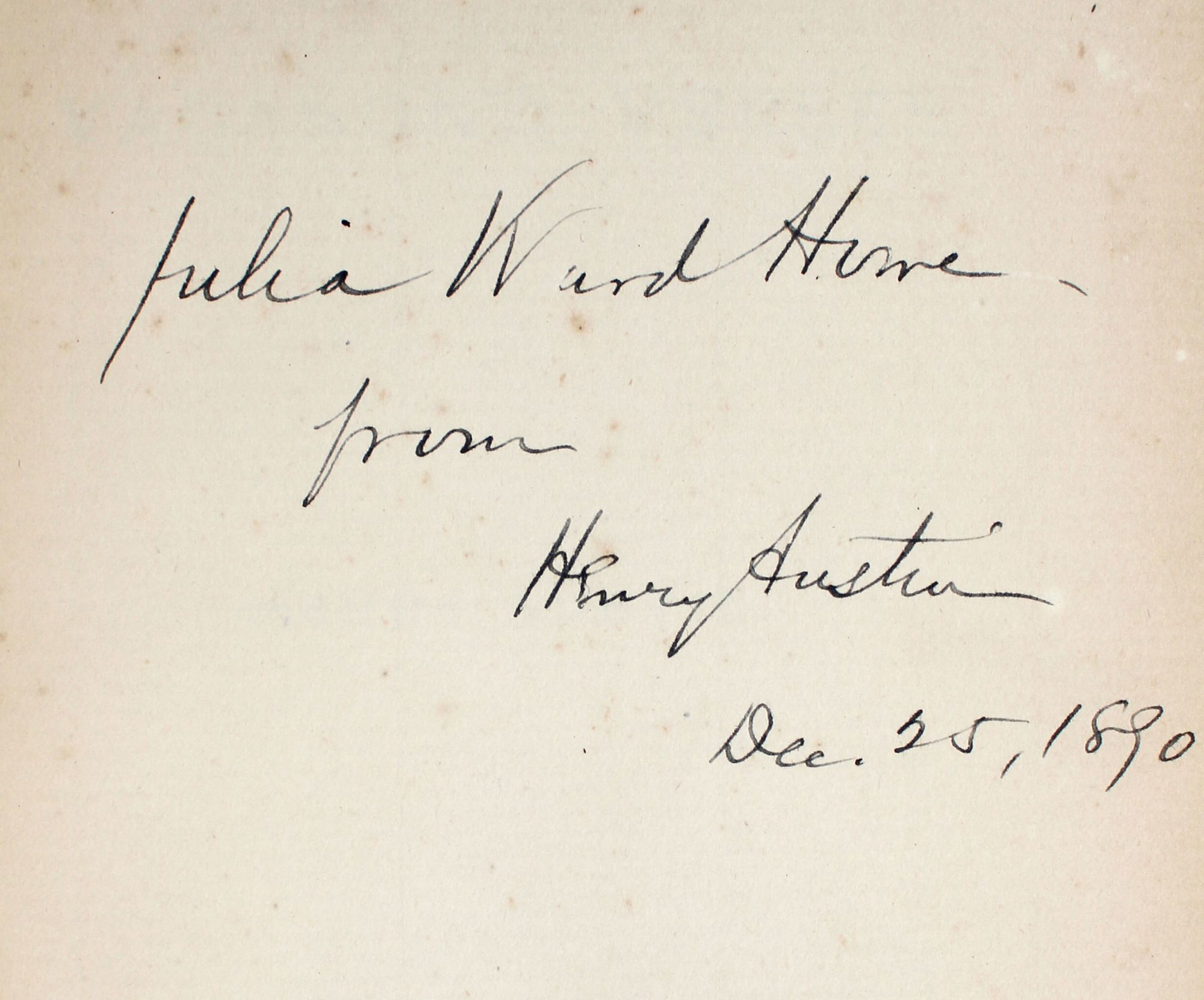 Boston: J. Stilman, Smith & Co, 1890. First edition. Presentation copy inscribed by Austin to Julia Ward Howe. [2], iii, [3, blank], 100pp. 8vo. Publisher's russet cloth, upper cover lettered in gilt. First edition. Presentation copy inscribed by Austin to Julia Ward Howe. [2], iii, [3, blank], 100pp. 8vo. Among the Poems are verses to Julia Ward Howe, as well as James Whitcomb Riley and Wendell Phillips. Henry Willard Austin (1858-1912) was a Massachusetts man of letters who, as editor of The Nationalist, published Charlotte Perkins Gilman's first poem, "Similar Cases