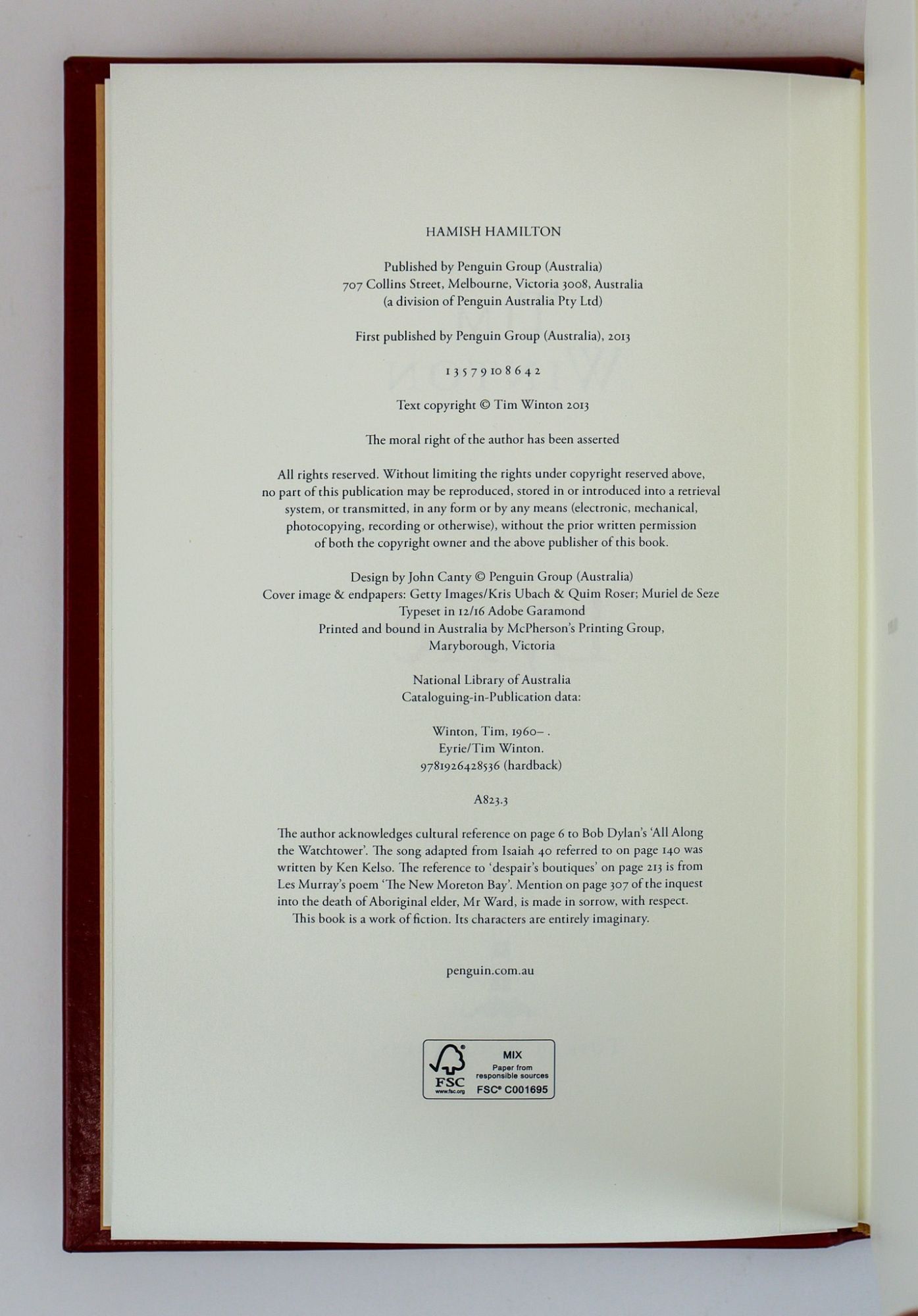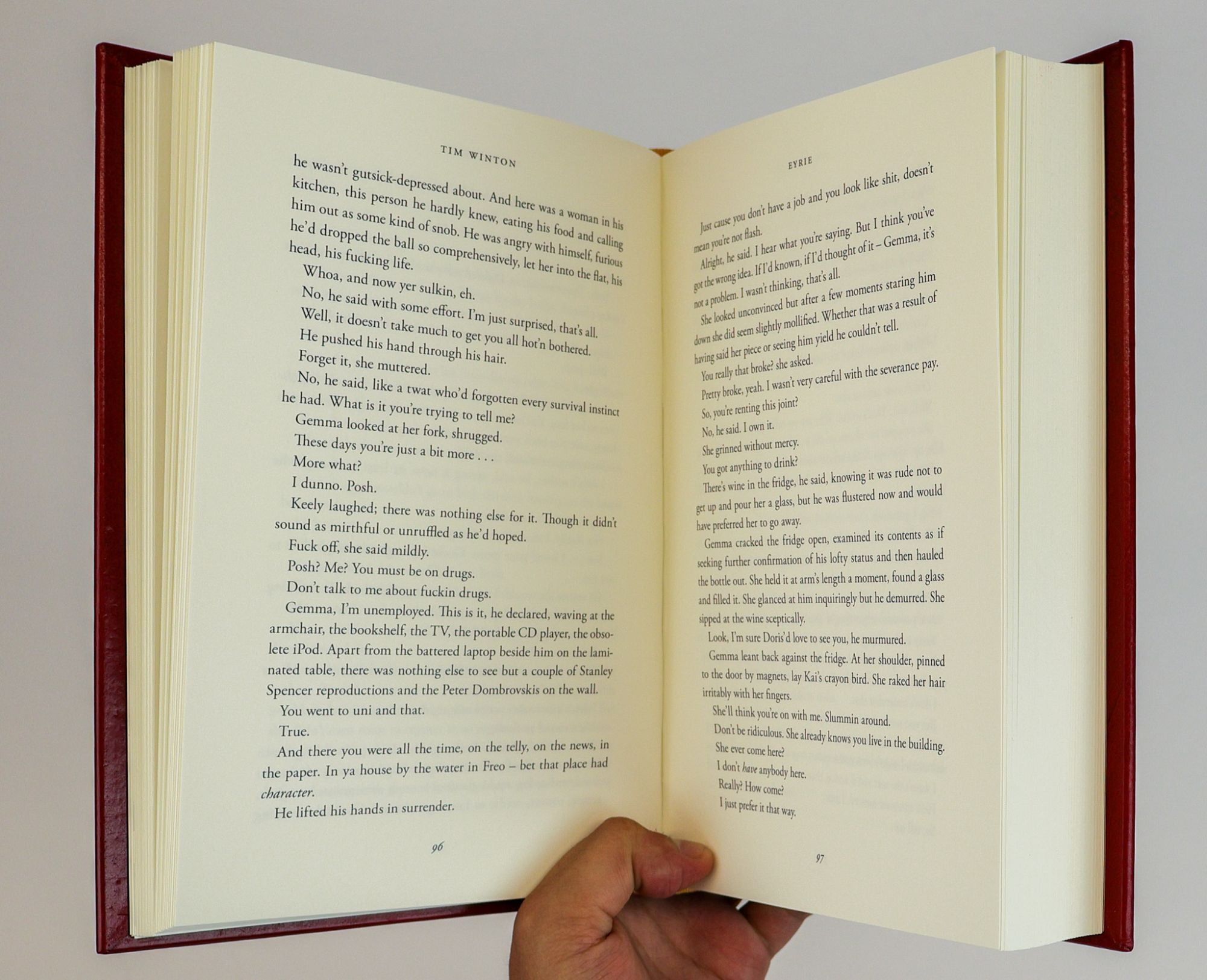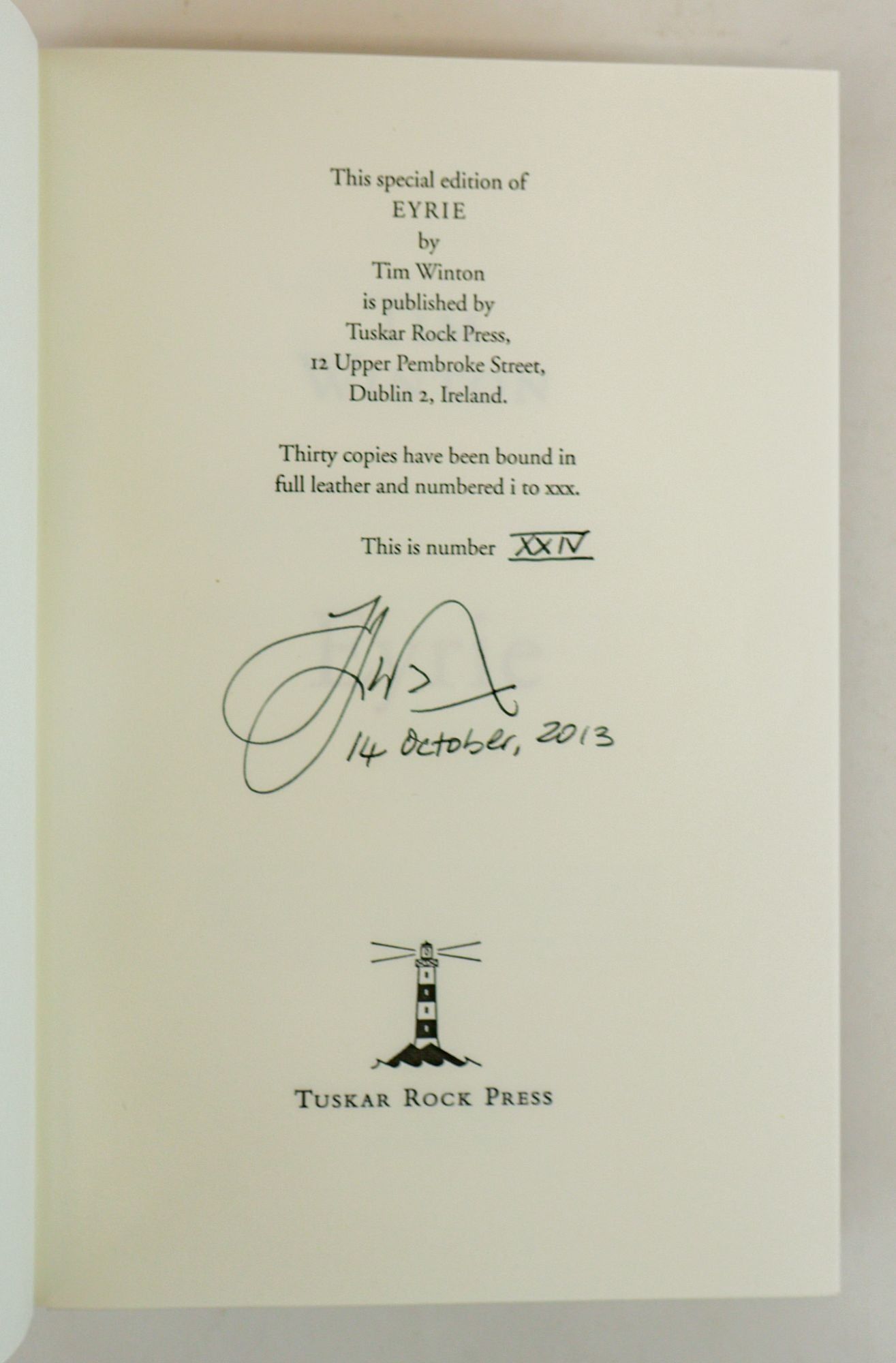 Melbourne, AUS: Tuskar Rock Press, 2013. First Edition, First Printing, Limited Edition, #XXIV/XXX. Hardcover. Octavo, 424 pages. In Near Fine condition. Tan cloth slipcase with dark red velvet interior. Blood red leather spine with gilted lettering and publisher's symbol. Boards are wrapped in publisher's blood red leather. Signed by Tim Winton on publisher's limitation page, limited edition, #XXIV/XXX. JW consignment. Shelved Case 7. 1382233. Shelved Dupont Bookstore.