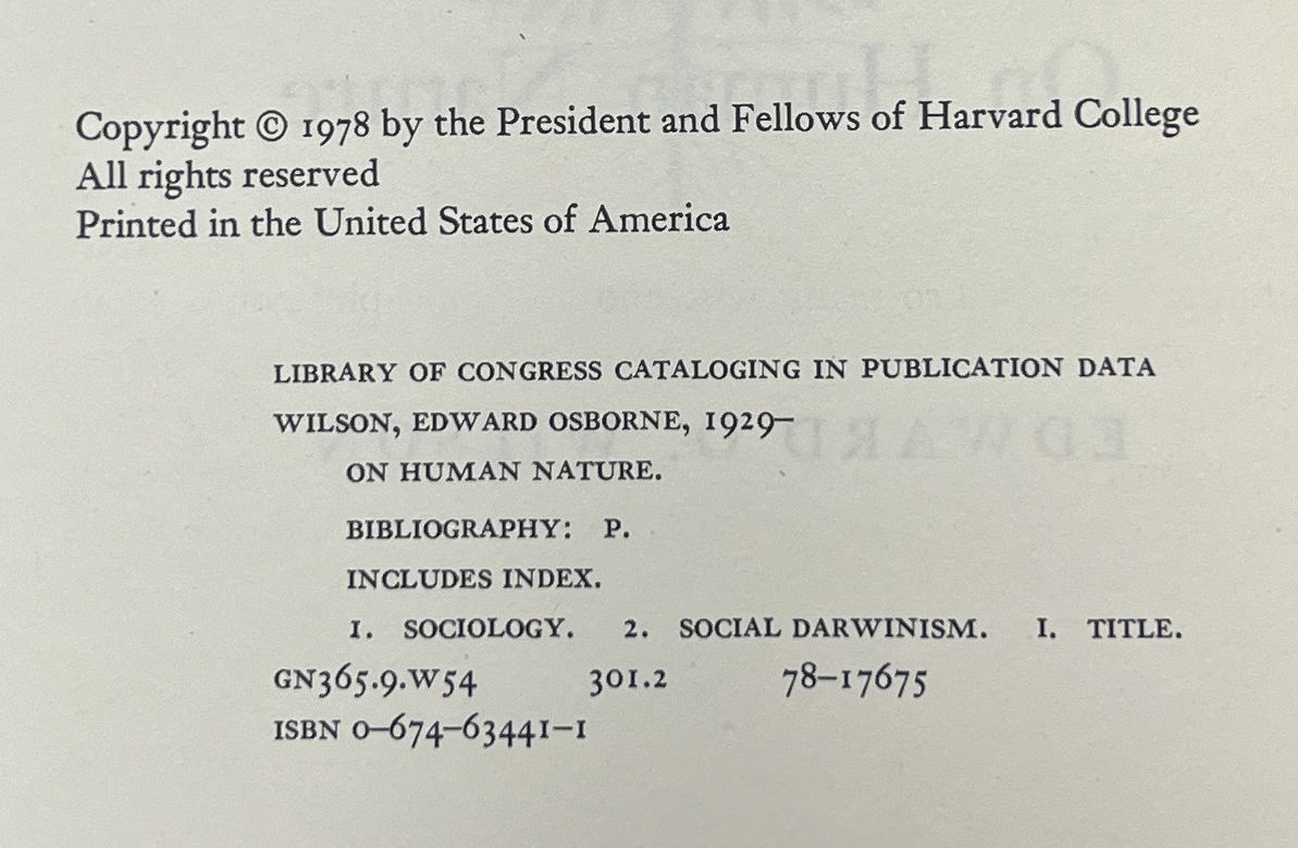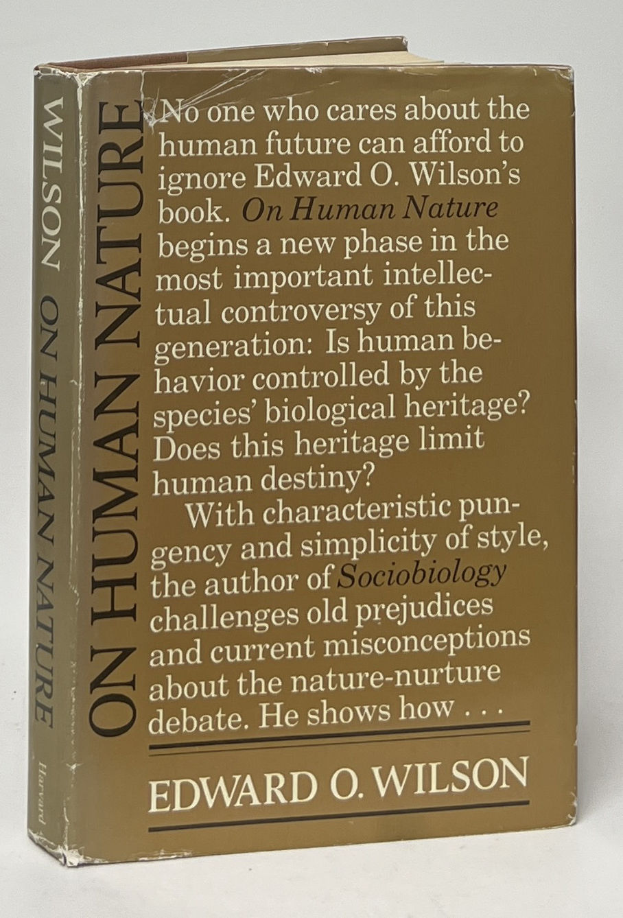 Cambridge: Harvard University Press, 1978. First Edition. Hardcover. Fine/Very Good. Fine in an about Very Good jacket, clipped, faded at the spine and edges, soiled at the panels, some creases and closed tears. Brown cloth with gilt lettering on the spine. Square and firmly bound, clean internally. Wilson's classic work in which he introduces his sociobiological theory and "arrives at conclusions far removed from the social Darwinist legac of the last century." Winner of the Pulitzer Prize.