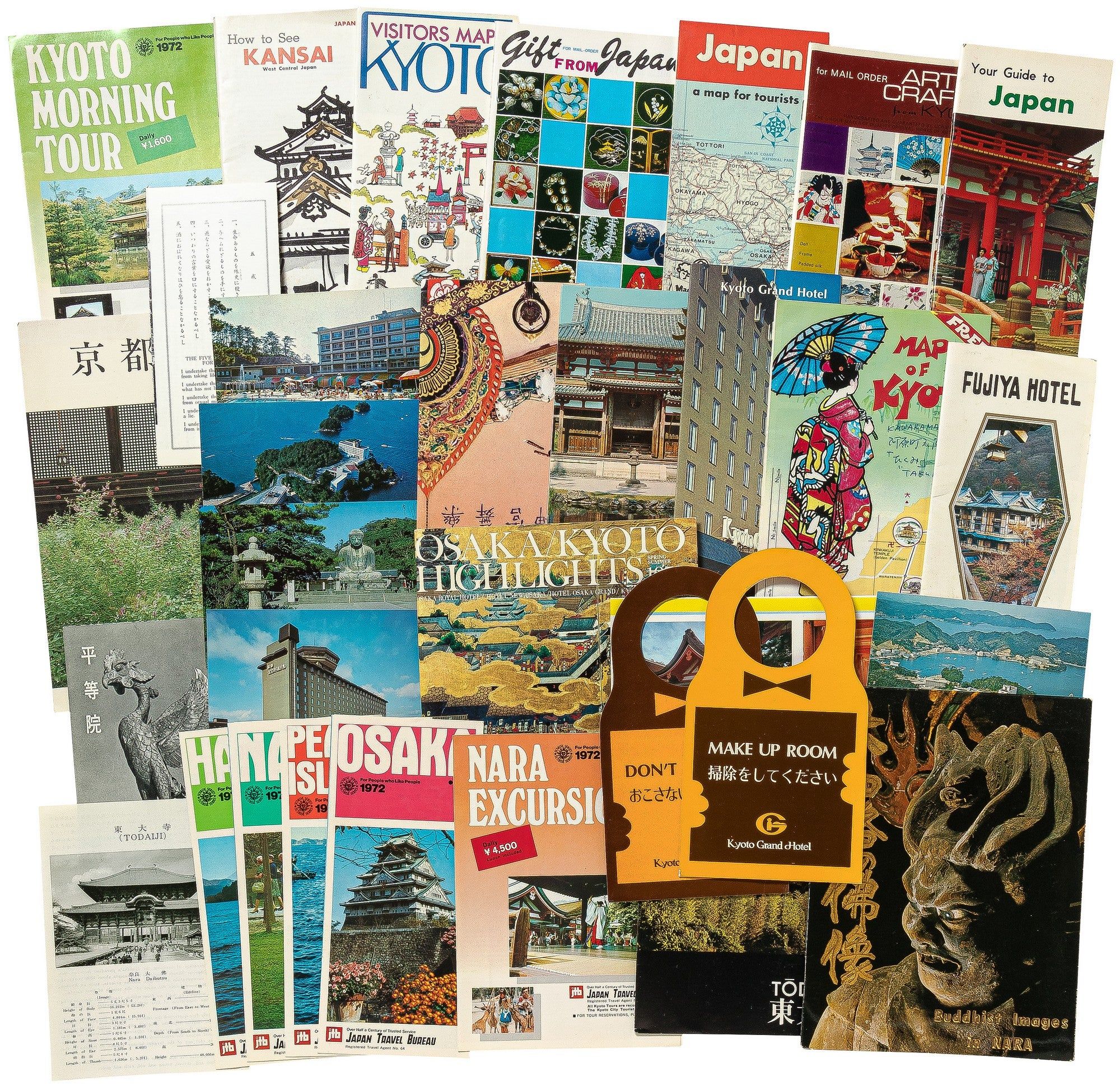 Japan: Various, 1972. Unbound. Fine. A collection of 27 ephemeral items (not counting individual postcards) from a 1972 trip to Japan. Included are three large folding maps, three postcard packs, 10 pamphlets related to scenic or historic destinations, four items related to hotels (including two door hangers), two small catalogs of Japanese crafts, and five pieces related to Japanese temples. One folding map with two inked notes and one door hanger with a diagonal crease, otherwise the material is bright and fine with only occasional nominal wear. An interesting collection of ephemeral material related to a trip to Japan in the early 1970s.