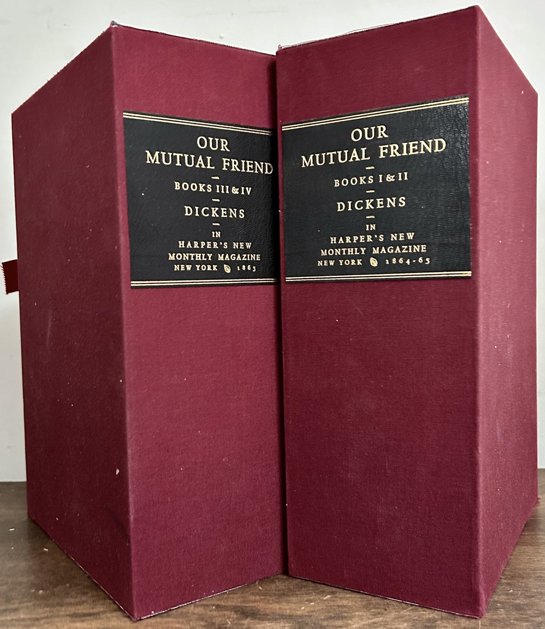 New York: Harper & Brothers, 1865. First American edition. Hardcover. Orig. printed wrappers, very good housed in two fine red cloth slip cases with black leather spine labels printed in gilt.. Stone, Marcus. 26.2 x 16.8 cm. Wood engraved portrait of Dickens after Marcus Stone and 34 parts in 19 vols. This was the first American periodical in parts. Each part appearing one month after the first British serial publication which ran from May 1854 to November 1865. Harper and Brothers purchased advance proofs of the work paying 1000 pounds to assure that the issue in the Magazine was probably its first appearance in the United States. Also intriguing, commentary on aspects on the American Civil War and slavery in the first issue. WILKINS p.32. SMITH AMERICAN 14, p.392, note 1. Text generally clean, chipping to wrappers, some light margin stains, a few spines with some loss. Attractive well preserved set.