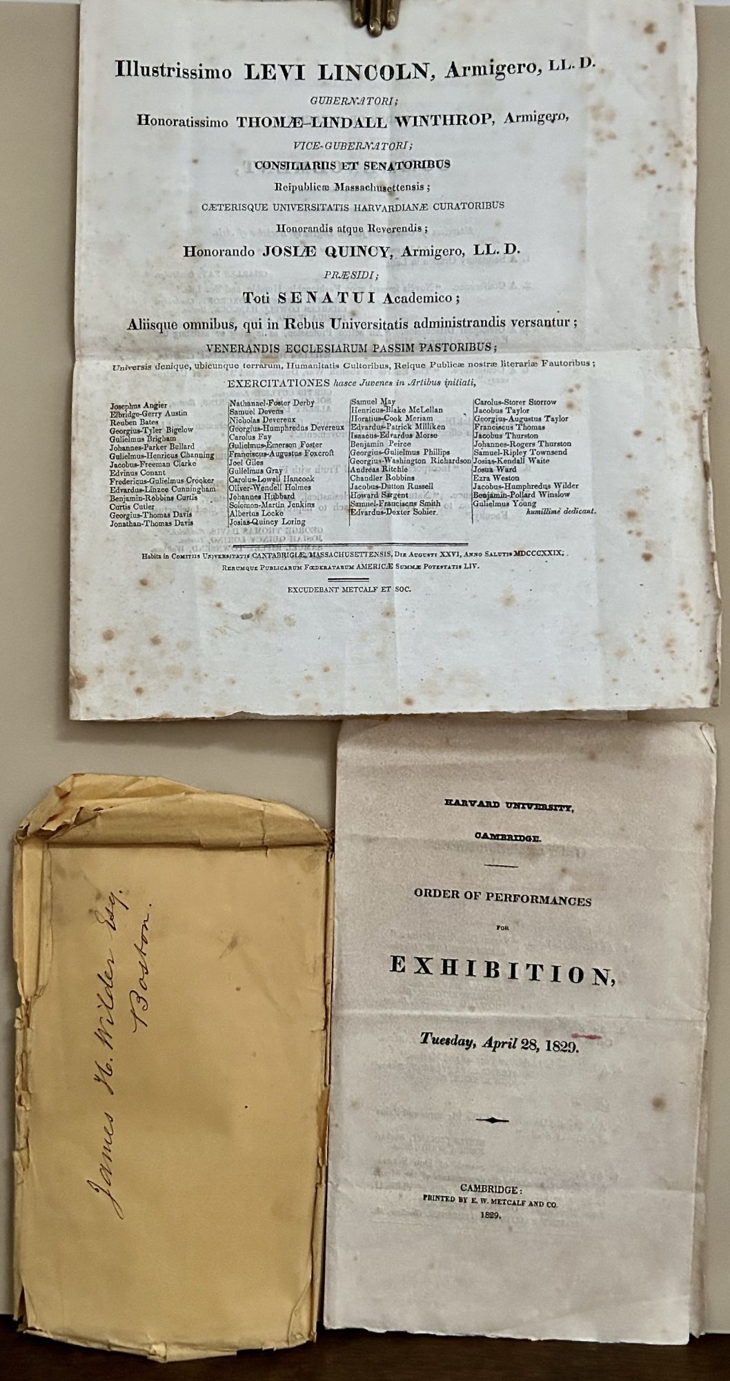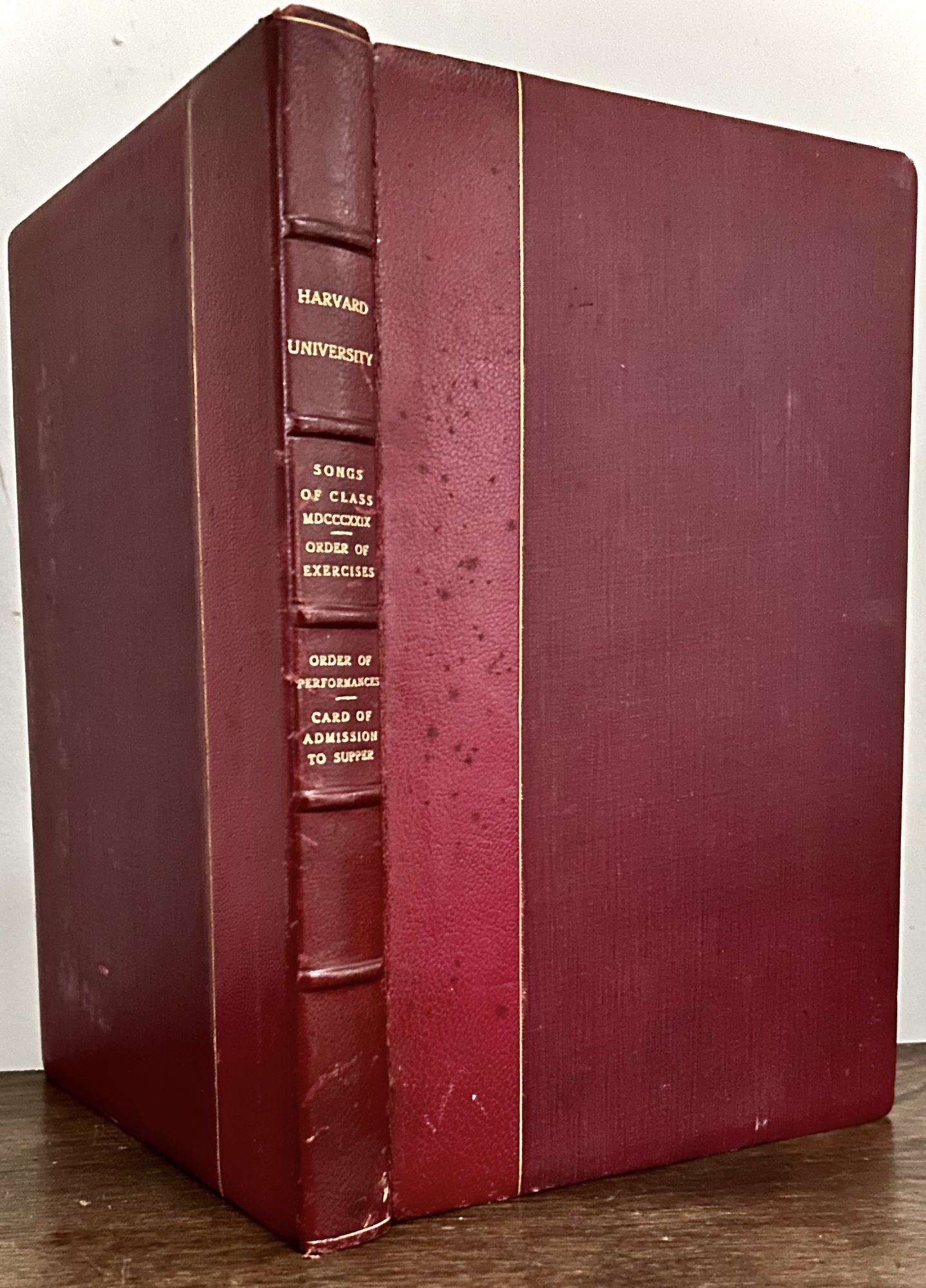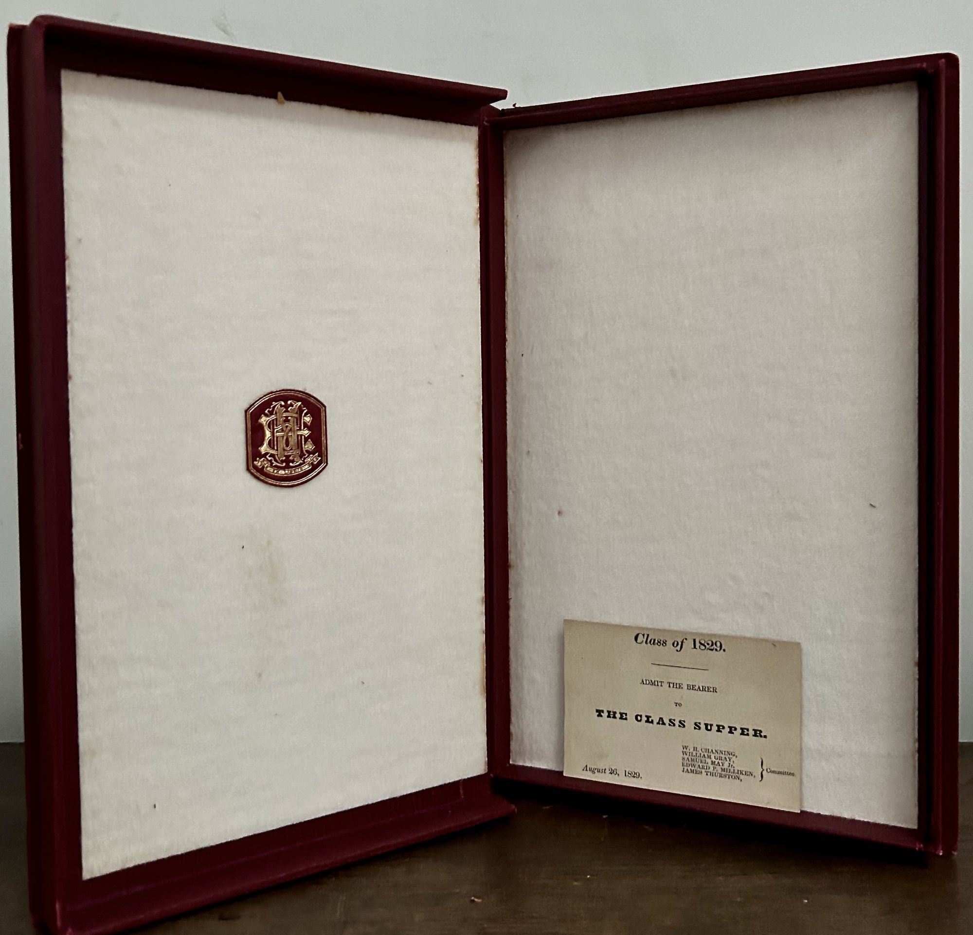 Boston: Prentiss and Sawyer, 1854. First edition. Hardcover. Gilt lettered half morocco and red cloth clamshell box with silk moire chemise. Near fine. A fine copy of the exceedingly rare first edition of six leaves: that present five poems, three of which by Holmes, and others including S.F. Smith, the author of "My Country Tis of Thee." This copy is enhanced by the following three associated pieces: [1] Harvard University. Cambridge Order of Performances For Exhibition, Tuesday, April 28, 1829. Cambridge: Printed by E.W. Metcalf and Co. 1829. Four pages. [2] Harvard University, Cambridge. Order of Performances for Exhibition, Tuesday, April 28, 1828. 4 pages as issued. Number 7 in the Order of Exercises announces "A Poem. Forgotten Ages, by Oliver Wendell Holmes." [3] A card of Admission to the Supper of the Class, reading: Class of 1829. "Admit the Bearer to the Class Supper," etc. Dated August 26, 1829. The Order of Exercises For Commencement No.14 "A Forensic Disputation," notes James Humphrey Wilder, Hingham as a contributor. Hand written envelope belonging to latter also enclosed. BAL 8766.