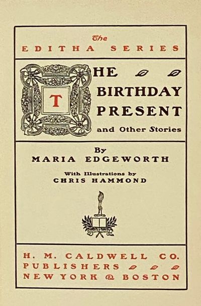 New York / Boston: H.M. Caldwell Co, 1908. Hard Cover. Very Good/Fair. Hammond, Chris. Includes scarce jacket, toned with chips from edges and one large tear, now under fresh archival cover. Ink gift note on front endpaper, front matter a bit foxed. 1908 Hard Cover. 23, 34, 23 pp. Woodcut frontispiece and illustrations by Chris Hammond. Color illustrations mounted on front board with dark green titles and borders. Three short stories by the Anglo-Irish author best known for her first novel Castle Rackrent. Includes: The Birthday Present; The Orphans; The Basket-Woman.