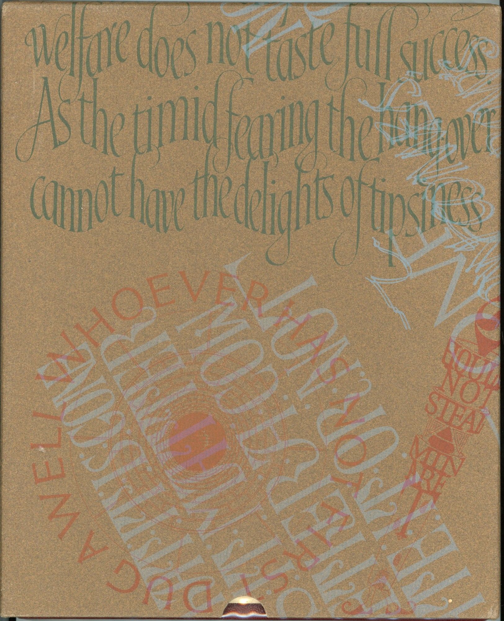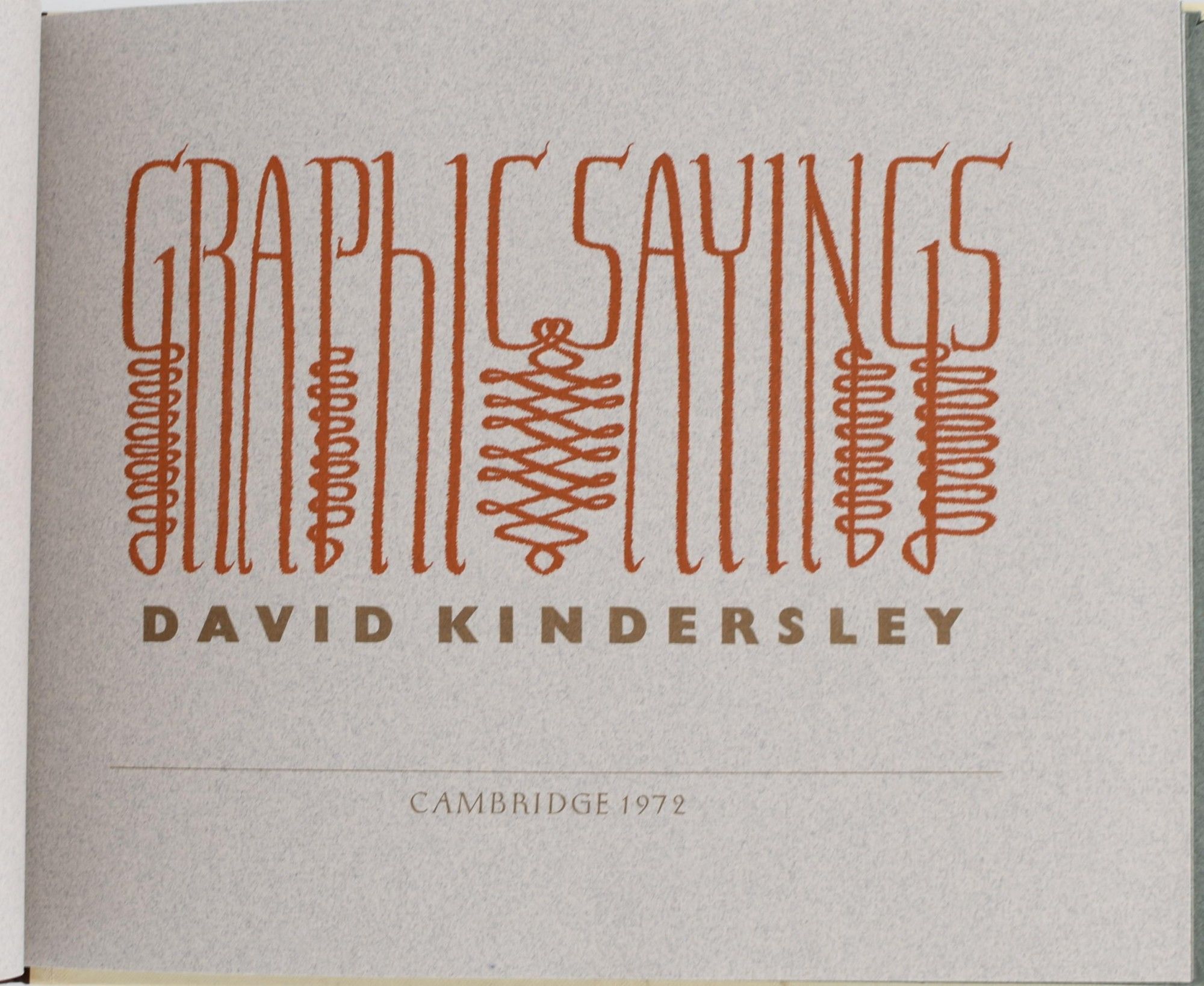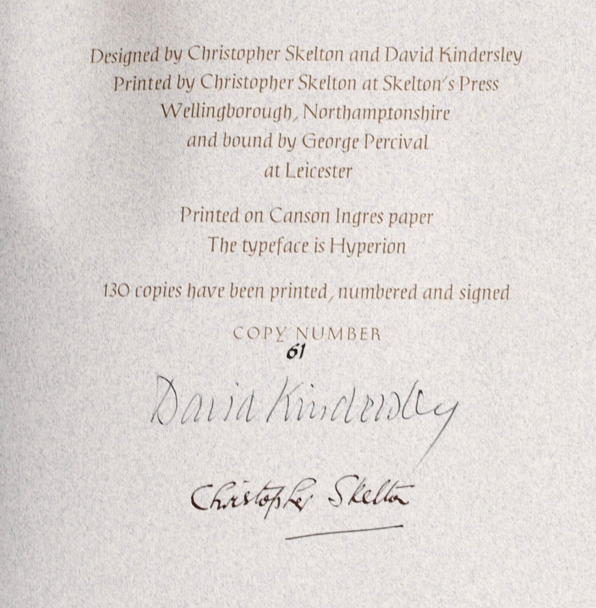 Wellingborough, Northamptonshire: Skelton's Press | Kindersley and Skelton, 1972. Near Fine binding. Oblong quarto; in printed champagne colored silk boards backed in burgundy colored morocco with titling in gilt, with the publisher's mylar wrapper and housed in a printed paper-covered slipcase; 20 double leaves, chiefly illustrations; printed on different colored paper stock, with an extra suite of 16 plates printed on Japanese paper loose in the pocket inside the rear oover. ~~This is the Deluxe Edition limited to 130 copies of which this is #61, signed by both David Kindersley and Christopher Skelton. Near Fine binding.
